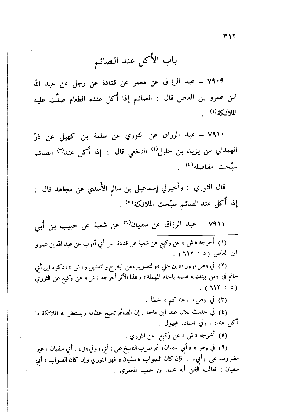 ٧٩١٠ - عَنِ الثَّوْرِيِّ، عَنْ سَلَمَةَ بْنِ كُهَيْلٍ، عَنْ ذَرٍّ الْهَمْدَانِيِّ، عَنْ يَزِيدَ بْنِ حَلِيلٍ النَّخَعيِّ قَالَ: «إِذَا أُكِلَ عِنْدَ الصَّائِمِ سَبَّحَتْ مَفَاصِلُهُ»
