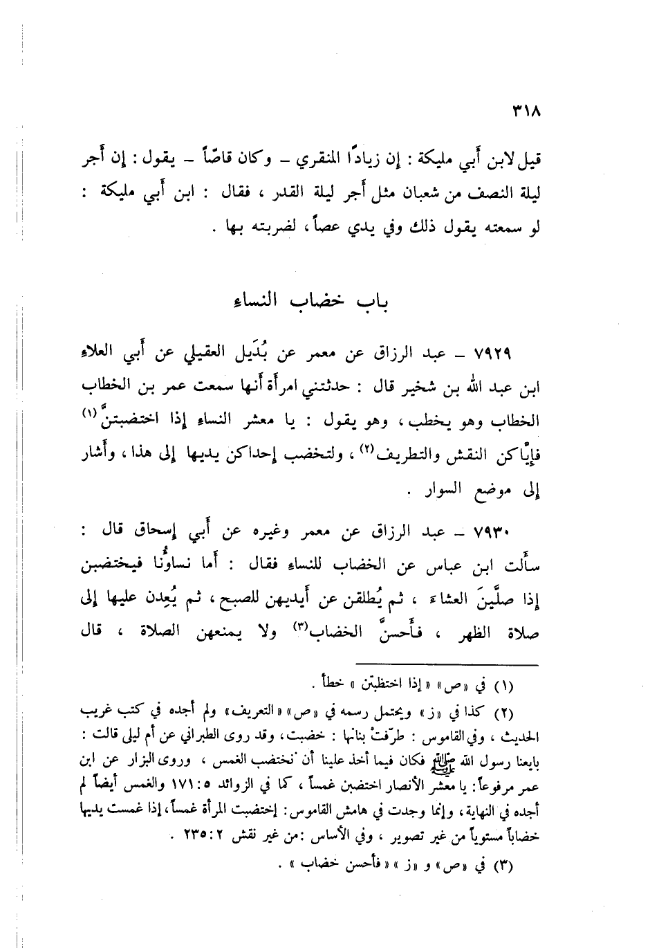 ٧٩٢٩ - عَنْ مَعْمَرٍ، عَنْ بُدَيْلٍ الْعُقَيْلِيِّ، عَنْ أَبِي الْعَلَاءِ بْنِ عَبْدِ اللَّهِ بْنِ شِخِّيرٍ قَالَ: حَدَثَتْنِي امْرَأَةٌ أَنَّهَا: سَمِعَتْ عُمَرَ بْنَ الْخَطَّابِ، وَهُوَ يَخْطُبُ وَهُوَ يَقُولُ: «يَا مَعْشَرَ النِّسَاءِ إِذَا اخْتَضَبْتُنَّ، فَإِيَّاكُنَّ النَّقْشَ، وَالتَّطْرِيفَ وَلْتَخَضِبْ إِحْدَاكُنَّ يَدَيْهَا إِلَى هَذَا، وَأَشَارَ إِلَى مَوْضِعِ السِّوَارِ»