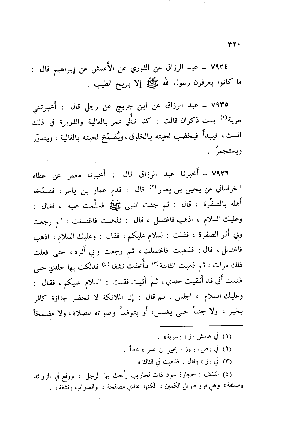 ٧٩٣٦ - عَبْدُ الرَّزَّاقِ قَالَ: أَخْبَرَنَا مَعْمَرٌ، عَنْ عَطَاءٍ الْخُرَاسَانِيِّ، عَنْ يَحْيَى بْنِ يَعْمَرَ قَالَ: قَدِمَ عَمَّارُ بْنُ يَاسِرٍ فَضَمَّخَهُ أَهْلُهُ بِالصُّفْرَةِ قَالَ: ثُمَّ جِئْتُ النَّبِيَّ صَلَّى اللهُ عَلَيْهِ وَسَلَّمَ فَسَلَّمْتُ عَلَيْهِ فَقَالَ: «وَعَلَيْكَ السَّلَامُ اذْهَبْ فَاغْتَسِلْ» قَالَ: فَذَهَبْتُ فَاغْتَسَلْتُ، ثُمَّ رَجَعْتُ، وَبِي أَثَرُ الصُّفْرَةِ، فَقُلْتُ: السَّلَامُ عَلَيْكُمْ، فَقَالَ: «وَعَلَيْكَ السَّلَامُ، اذْهَبْ فَاغْتَسِلْ» قَالَ: فَذَهَبْتُ فَاغْتَسَلْتُ، ثُمَّ رَجَعْتُ، وَبِي أَثَرُهُ حَتَّى فَعَلْتُ ذَلِكَ مَرَّاتٍ، ثُمَّ ذَهَبْتُ الثَّالِثَةَ، فَأَخَذْتُ نَشَفًا فَدَلَّكْتُ بِهَا جِلْدِي حَتَّى ظَنَنْتُ أَنِّي قَدْ أَنْقَيْتُ جِلْدِي، ثُمَّ أَتَيْتُ، فَقُلْتُ: السَّلَامُ عَلَيْكُمْ، فَقَالَ: «وَعَلَيْكَ السَّلَامُ اجْلِسْ»، ثُمَّ قَالَ: «إِنَّ الْمَلَائِكَةَ لَا تَحْضُرُ جِنَازَةَ كَافِرٍ بَخَيْرٍ، وَلَا جُنُبًا حَتَّى يَغْتَسِلَ، أَوْ يَتَوَضَّأَ، وُضُوءَهُ لِلصَّلَاةِ، وَلَا مُضُمَّخًا ⦗٣٢١⦘ بِصُفْرَةٍ»