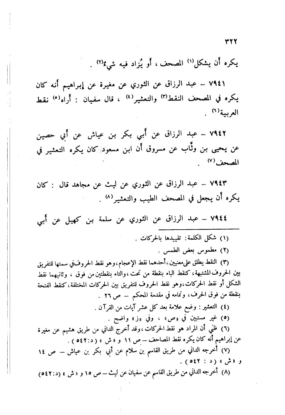 ٧٩٤٢ - عَنْ أَبِي بَكْرِ بْنِ عَيَّاشٍ، عَنْ أَبِي حُصَيْنٍ، عَنْ يَحْيَى بْنِ وَثَّابٍ، عَنْ مَسْرُوقٍ: «أَنَّ ابْنَ مَسْعُودٍ كَانَ يَكْرَهُ التَّعْشِيرَ فِي الْمُصْحَفِ»
