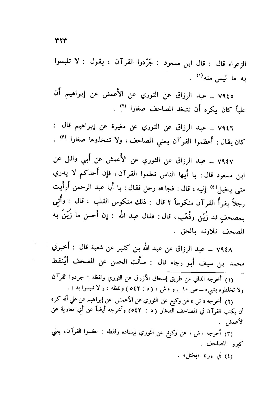 ٧٩٤٧ - عَنِ الثَّوْرِيِّ، عَنِ الْأَعْمَشِ، عَنْ أَبِي وَائِلٍ، عَنِ ابْنِ مَسْعُودٍ قَالَ: «يَا أَيُّهَا النَّاسُ تَعَلَّمُوا الْقُرْآنَ؛ فَإِنَّ أَحَدَكُمْ لَا يَدْرِي مَتَى يُخَيَّلُ إِلَيْهِ؟» قَالَ: فَجَاءَهُ رَجُلٌ، فَقَالَ: يَا أَبَا عَبْدِ الرَّحْمَنِ أَرَأَيْتَ رَجُلًا يَقْرَأُ الْقُرْآنَ مَنْكُوسًا؟ قَالَ: «ذَلِكَ مَنْكُوسُ الْقَلْبِ» قَالَ: وَأَتَى بِمُصْحَفٍ قَدْ زُيِّنَ، وَذُهِّبَ قَالَ: فَقَالَ عَبْدُ اللَّهِ: «إِنَّ أَحْسَنَ مَا زُيِّنَ بِهِ الْمُصْحَفُ تِلَاوَتُهُ بِالْحَقِّ»