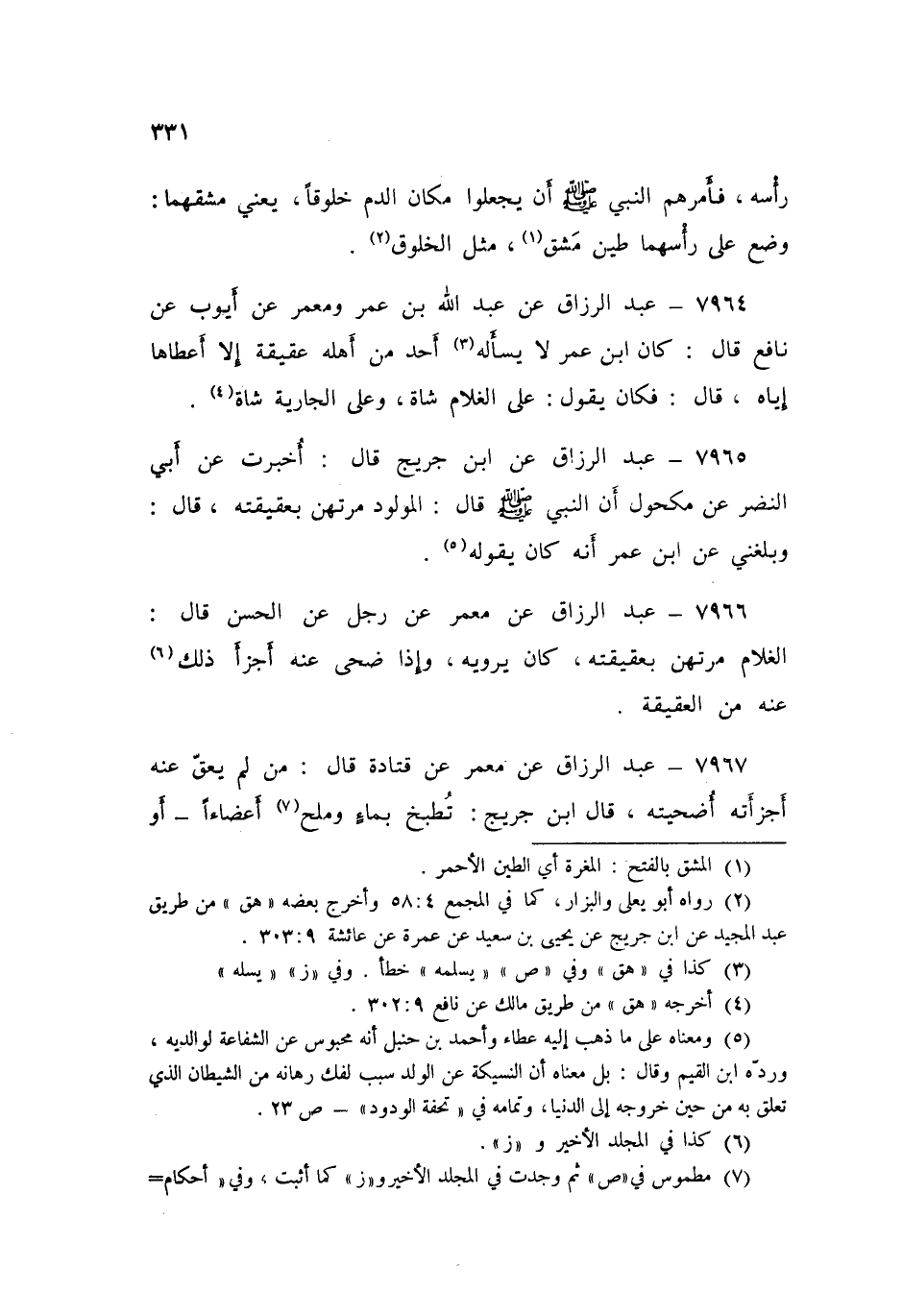 ٧٩٦٥ - عَنِ ابْنِ جُرَيْجٍ قَالَ: أُخْبِرْتُ عَنْ أَبِي النَّضْرِ، عَنْ مَكْحُولٍ، أَنَّ النَّبِيَّ صَلَّى اللهُ عَلَيْهِ وَسَلَّمَ قَالَ: «الْمَوْلُودُ مُرْتَهَنٌ بِعَقِيقَتِهِ» قَالَ: وَبَلَغَنِي عَنِ ابْنِ عُمَرَ أَنَّهُ كَانَ يَقُولُهُ