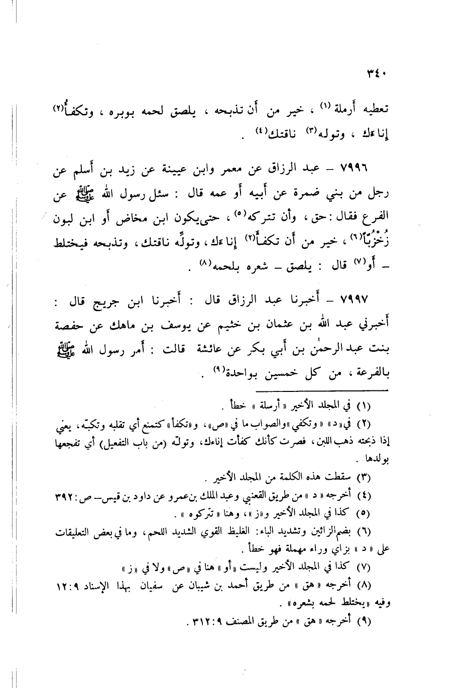 ٧٩٩٧ - عَبْدُ الرَّزَّاقِ قَالَ: أَخْبَرَنَا ابْنُ جُرَيْجٍ قَالَ: أَخْبَرَنِي عَبْدُ اللَّهِ بْنُ عُثْمَانَ بْنِ خُثَيْمٍ، عَنْ يُوسُفَ بْنِ مَاهَكَ، عَنْ حَفْصَةَ بِنْتِ عَبْدِ الرَّحْمَنِ بْنِ أَبِي بَكْرٍ، عَنْ عَائِشَةَ قَالَتْ: «أَمَرَ رَسُولُ اللَّهِ صَلَّى اللهُ عَلَيْهِ وَسَلَّمَ بِالْفَرَعَةِ مِنْ كُلِّ خَمْسِينَ بِوَاحِدَةٍ»