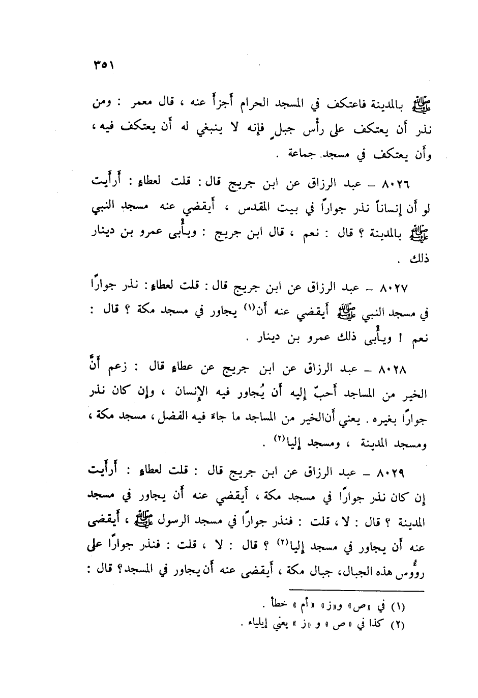 ٨٠٢٩ - عَنِ ابْنِ جُرَيْجٍ قَالَ: قُلْتُ لِعَطَاءٍ: أَرَأَيْتَ إِنْ كَانَ نَذَرَ جِوَارًا فِي مَسْجِدِ مَكَّةَ، أَيَقْضِي عَنْهُ أَنْ يُجَاوِرَ فِي مَسْجِدِ الْمَدِينَةِ؟ قَالَ: «لَا»، قُلْتُ: فَنَذَرَ جِوَارًا فِي مَسْجِدِ الرَّسُولِ صَلَّى اللهُ عَلَيْهِ وَسَلَّمَ أَيَقْضِي عَنْهُ أَنْ يُجَاوِرَ فِي مَسْجِدِ إِلِيَّا؟ قَالَ: «لَا»، قُلْتُ: فَنَذَرَ جِوَارًا عَلَى رُءُوسِ هَذِهِ الْجِبَالِ جِبَالِ مَكَّةَ، أَيَقْضِي عَنْهُ أَنْ يُجَاوِرَ فِي الْمَسْجِدِ؟ قَالَ: «نَعَمْ، الْمَسْجِدُ خَيْرٌ وَأَطْهَرُ»، قُلْتُ: وَكَذَلِكَ فِي كُلِّ أَرْضٍ؟ قَالَ: «نَعَمْ»، ثُمَّ أَخْبَرَنِي عِنْدَ ذَلِكَ خَبَرَ عَائِشَةَ حِينَ نَذَرَتْ أَنْ تُجَاوِرَ فِي جَوْفِ ثَبِيرٍ