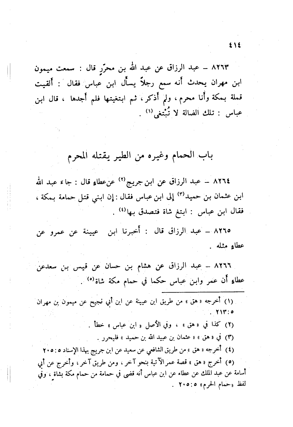 ٨٢٦٤ - عَنِ ابْنِ جُرَيْجٍ، عَنْ عَطَاءٍ قَالَ: جَاءَ عَبْدُ اللَّهِ بْنُ عُثْمَانَ بْنِ حُمَيْدٍ إِلَى ابْنِ عَبَّاسٍ فَقَالَ: إِنَّ ابْنِي قَتَلَ حَمَامَةً بِمَكَّةَ فَقَالَ ابْنُ عَبَّاسٍ: «ابْتَغِ شَاةً فَتَصَدَّقْ بِهَا» عَبْدُ الرَّزَّاقِ،