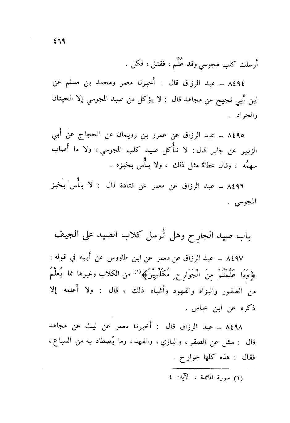 ٨٤٩٨ - قَالَ: أَخْبَرَنَا مَعْمَرٌ، عَنْ لَيْثٍ، عَنْ مُجَاهِدٍ قَالَ: سُئِلَ عَنِ الصَّقْرِ، وَالْبَازِيِّ، وَالْفَهْدِ، وَمَا يَصْطَادُ بِهِ مِنَ السِّبَاعِ، فَقَالَ: «هَذِهِ كُلُّهَا جَوَارِحُ»، قَالَ مَعْمَرٌ: وَقَالَ حَمَّادٌ «ذَلِكَ غَيْرَ أَنَّ الصَّقْرَ وَالْبَازِيَّ إِذَا أَكَلَا من صَيْدِهِمَا أُكِلَ مِنْهُ، وَإِذَا أَكَلَ الْكَلْبُ، وَالْفَهْدُ لَمْ يُؤْكَلْ»، قَالَ عَبْدُ الرَّزَّاقِ: «وَسَمِعْتُهُ مِنْ مَعْمَرٍ غَيْرَ مَرَّةٍ حَدِيثَ لَيْثٍ»