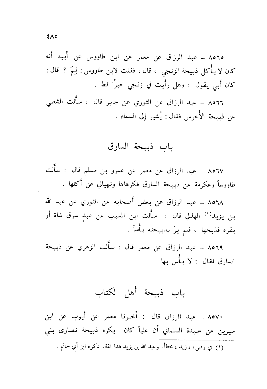 ٨٥٦٩ - عَنْ مَعْمَرٍ قَالَ: سَأَلْتُ الزُّهْرِيَّ عَنْ ذَبِيحَةِ السَّارِقِ فَقَالَ: «لَا بَأْسَ بِهَا».