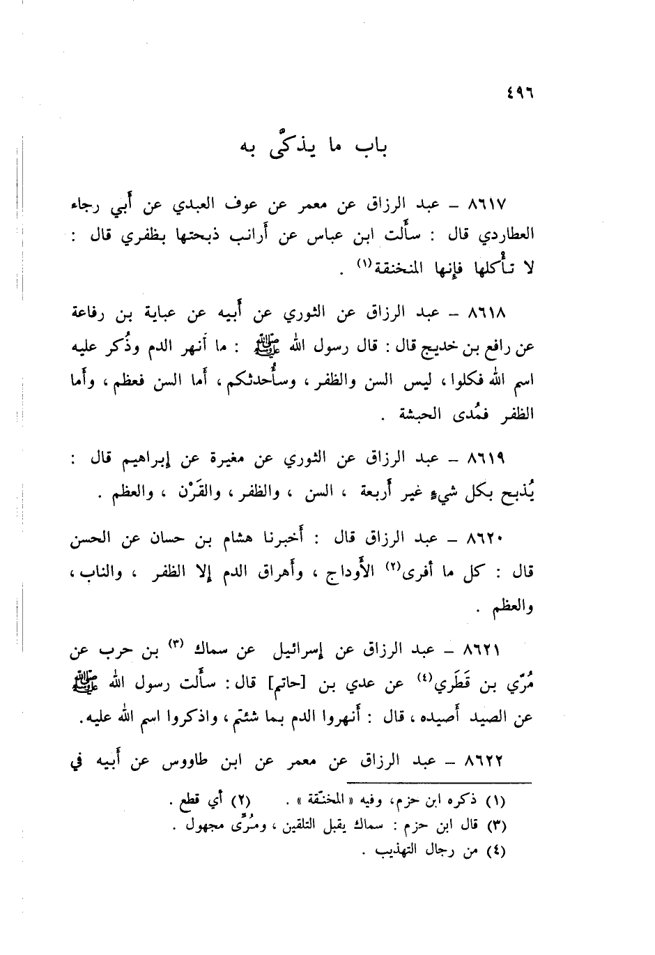 ٨٦١٨ - عَنِ الثَّوْرِيِّ، عَنْ أَبِيهِ، عَنْ عَبَايَةَ بْنِ رِفَاعَةَ، عَنْ رَافِعِ بْنِ خَدِيجٍ قَالَ: قَالَ رَسُولُ اللَّهِ صَلَّى اللهُ عَلَيْهِ وَسَلَّمَ: «مَا أَنْهَرَ الدَّمَ، وَذُكِرَ عَلَيْهِ اسْمُ اللَّهِ فَكُلُوا، لَيْسَ السِّنَّ، وَالظُّفْرَ، وَسَأُحَدِّثُكُمْ، أَمَّا السِّنُّ فَعَظْمٌ، وَأَمَّا الظُّفْرُ فَمُدَى الْحَبَشَةِ»