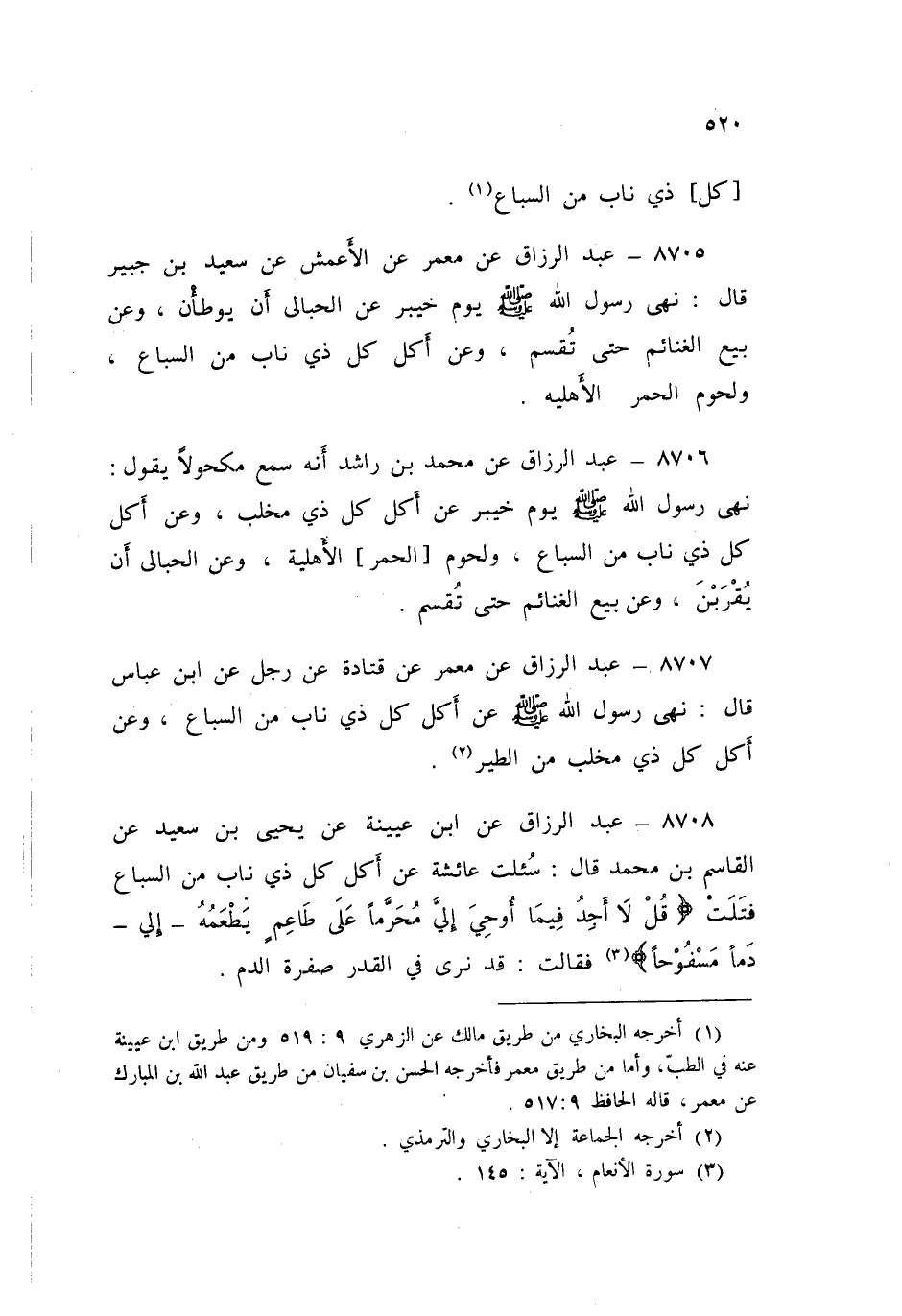 ٨٧٠٨ - عَنِ ابْنِ عُيَيْنَةَ، عَنْ يَحْيَى بْنِ سَعِيدٍ، عَنِ الْقَاسِمِ بْنِ مُحَمَّدٍ قَالَ: سُئِلَتْ عَائِشَةُ، عَنْ أَكْلِ كُلِّ ذِي نَابٍ مِنَ السِّبَاعِ، فَتَلَتْ: {قُلْ لَا أَجِدُ فِيمَا أُوحِيَ إِلَيَّ مُحَرَّمًا عَلَى طَاعِمٍ يَطْعَمُهُ إِلَّا أَنْ يَكُونَ مَيْتَةً أَوْ دَمًا مَسْفُوحًا} فَقَالَتْ: «قَدْ نَرَى فِي الْقِدْرِ صُفْرَةَ الدَّمِ»