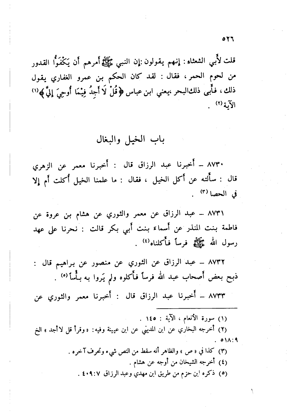 ٨٧٣٠ - عَبْدُ الرَّزَّاقِ قَالَ: أَخْبَرَنَا مَعْمَرٌ، عَنِ الزُّهْرِيِّ قَالَ: سَأَلْتُهُ عَنْ أَكْلِ الْخَيْلِ؟ فَقَالَ: «مَا عَلِمْنَا الْخَيْلَ أُكِلَتْ أَمْ إِلَّا فِي الْحَصَا»