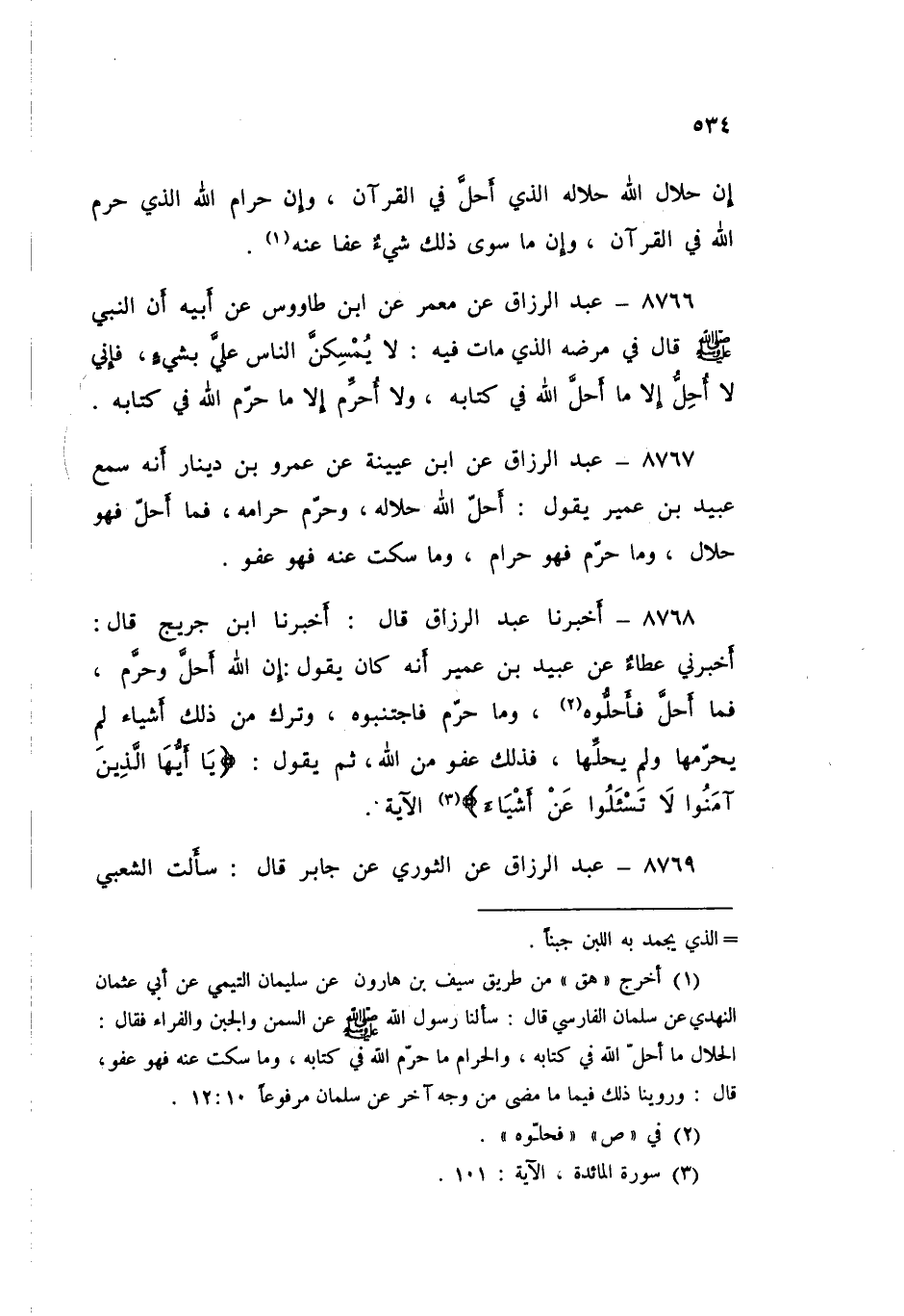 ٨٧٦٧ - عَنِ ابْنِ عُيَيْنَةَ، عَنْ عَمْرِو بْنِ دِينَارٍ، أَنَّهُ سَمِعَ عُبَيْدَ بْنَ عُمَيْرٍ يَقُولُ: «أَحَلَّ اللَّهُ حَلَالَهُ، وَحَرَّمَ حَرَامَهُ، فَمَا أَحَلَّ فَهُوَ حَلَالٌ، وَمَا حَرَّمَ فَهُوَ حَرَامٌ، وَمَا سَكَتَ عَنْهُ فَهُوَ عَفْوٌ»