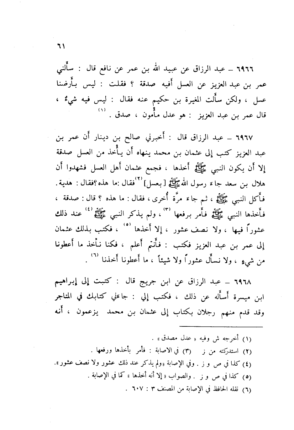 ٦٩٦٧ - قَالَ: أَخْبَرَنِي صَالِحُ بْنُ دِينَارٍ، أَنَّ عُمَرَ بْنَ عَبْدِ الْعَزِيزِ، كَتَبَ إِلَى عُثمَانَ بْنِ مُحَمَّدٍ يَنْهَاهُ أَنْ يَأْخُذَ مِنَ الْعَسَلِ صَدَقَةً إِلَا أَنْ يَكُونَ النَّبِيُّ صَلَّى اللهُ عَلَيْهِ وَسَلَّمَ أَخَذَهَا، فَجَمَعَ عُثْمَانُ أَهْلَ الْعَسَلِ فَشَهِدُوا أَنَّ هِلَالَ بْنَ سَعْدٍ جَاءَ رَسُولَ اللَّهِ صَلَّى اللهُ عَلَيْهِ وَسَلَّمَ بِعَسَلٍ فَقَالَ: «مَا هَذِهِ؟» فَقَالَ: هَدِيَّةٌ «فَأَكَلَ النَّبِيُّ صَلَّى اللهُ عَلَيْهِ وَسَلَّمَ» ثُمَّ جَاءَ مَرَّةً أُخْرَى، فَقَالَ: «مَا هَذِهِ؟» قَالَ: صَدَقَةٌ فَأَخَذَهَا النَّبِيُّ صَلَّى اللهُ عَلَيْهِ وَسَلَّمَ فَأَمَرَ بِرَفْعِهَا "، وَلَمْ يَذْكُرِ النَّبِيُّ صَلَّى اللهُ عَلَيْهِ وَسَلَّمَ عِنْدَ ذَلِكَ عُشُورًا فِيهَا، وَلَا نِصْفَ عُشُورٍ إِلَا أَخَذَهَا فَكَتَبَ بِذَلِكَ عُثْمَانُ إِلَى عُمَرَ بْنَ عَبْدِ الْعَزِيزِ فَكَتَبَ: «فَأَنْتُمْ أَعْلَمُ فَكُنَّا نَأْخُذُ مَا أَعْطُونَا مِنْ شَيْءٍ، وَلَا نَسْأَلُ عُشُورًا، وَلَا شَيْئًا، مَا أَعْطُونَا أَخَذْنَا»
