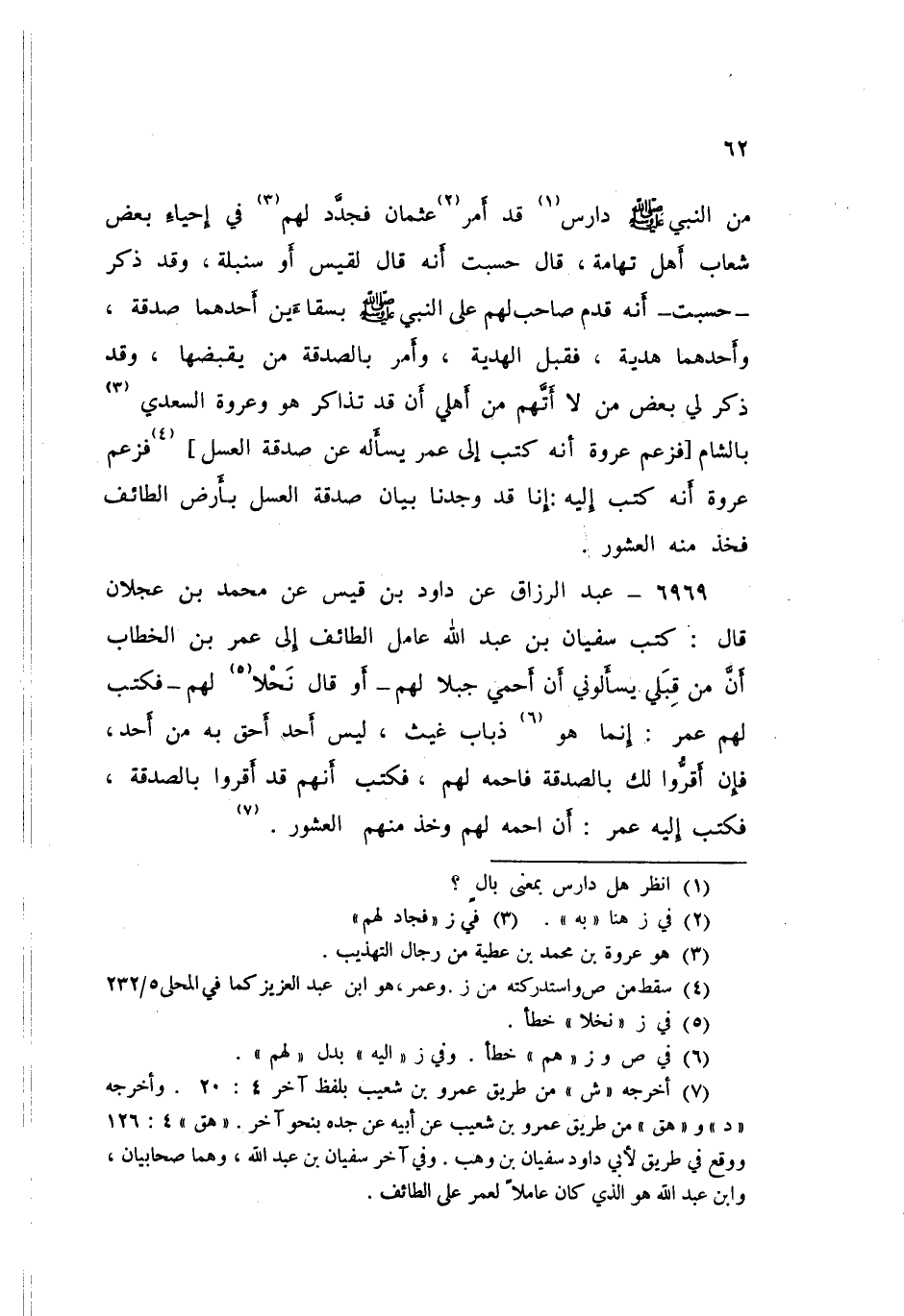 ٦٩٦٩ - عَنْ دَاوُدَ بْنِ قَيْسٍ، عَنْ مُحَمَّدِ بْنِ عَجْلَانَ قَالَ: كَتَبَ سُفْيَانُ بْنُ عَبْدِ اللَّهِ عَامِلُ الطَّائِفِ إِلَى عُمَرَ بْنِ الْخَطَّابِ أَنَّ مَنْ قَبِلِي يَسْأَلُونِي أَنْ أَحْمِيَ جَبَلًا لَهُمْ - أَوْ قَالَ: نَحْلًا لَهُمْ - فَكَتَبَ لَهُمْ عُمَرُ: «إِنَّمَا هُوَ ذُبَابُ غَيْثٍ، لَيْسَ أَحَدٌ أَحَقَّ بِهِ مِنْ أَحَدٍ، فَإِنْ أَقَرُّوا لَكَ بِالصَّدَقَةِ فَاحْمِهِ لَهُمْ، فَكَتَبَ أَنَّهُمْ قَدْ أَقَرُّوا بِالصَّدَقَةِ، فَكَتَبَ إِلَيْهِ عُمَرُ أَنِ احْمِهِ لَهُمْ وَخُذْ مِنْهُمُ الْعُشُورَ»