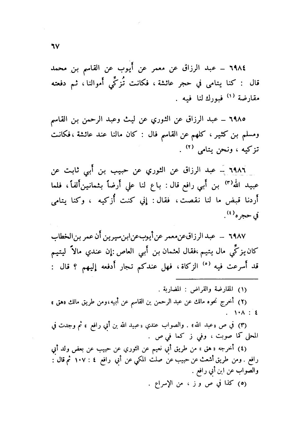 ٦٩٨٥ - عَنِ الثَّوْرِيِّ، عَنْ لَيْثٍ، وَعَبْدُ الرَّحْمَنِ بْنُ الْقَاسِمِ، وَمُسْلِمُ بْنُ كَثِيرٍ، كُلُّهُمْ عَنِ الْقَاسِمِ قَالَ: «كَانَ مَالُنَا عِنْدَ عَائِشَةَ فَكَانَتْ تُزَكِّيهِ، وَنَحْنُ يَتَامَى»