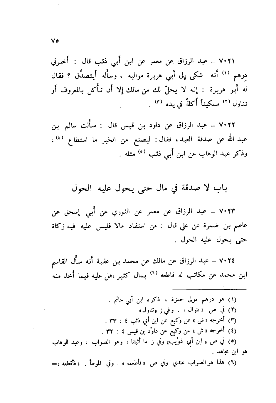 ٧٠٢٤ - عَنْ مَالِكٍ، عَنْ مُحَمَّدِ بْنِ عُقْبَةَ، أَنَّهُ سَأَلَ الْقَاسِمَ بْنَ مُحَمَّدٍ عَنْ مُكَاتِبٍ لَهُ قَاطَعَهُ بِمَالٍ كَثِيرٍ، هَلْ عَلَيْهِ فِيمَا أَخَذَ مِنْهُ زَكَاةٌ؟ فَقَالَ الْقَاسِمُ: «أَنَّ أَبَا بَكْرٍ الصِّدِّيقَ كَانَ لَا يَأْخُذُ مِنْ مَالٍ زَكَاةً حَتَّى يَحُولَ عَلَيْهِ الْحَوْلُ، وَكَانَ إِذَا أَعْطَى الرَّجُلَ عَطَاءً سَأَلَهُ هَلْ عِنْدَكَ مَالٌ وَجَبَ عَلَيْكَ فِيهِ زَكَاةٌ؟» فَإِنْ قَالَ: نَعَمْ أَخَذَ مِنْهُ مِنْ عَطَائِهِ زَكَاةَ ذَلِكَ الْمَالِ، وَإِلَّا سَلَّمَ إِلَيْهِ عَطَاءَهُ، وَافِرًا " عَبْدُ الرَّزَّاقِ،