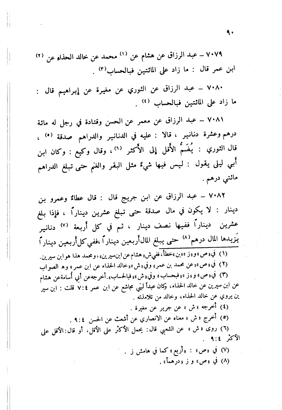 ٧٠٨٠ - عَنِ الثَّوْرِيِّ، عَنْ مُغِيرَةَ، عَنْ إِبْرَاهِيمَ قَالَ: «مَا زَادَ عَلَى الْمِائَتَيْنِ فَبِالْحِسَابِ»