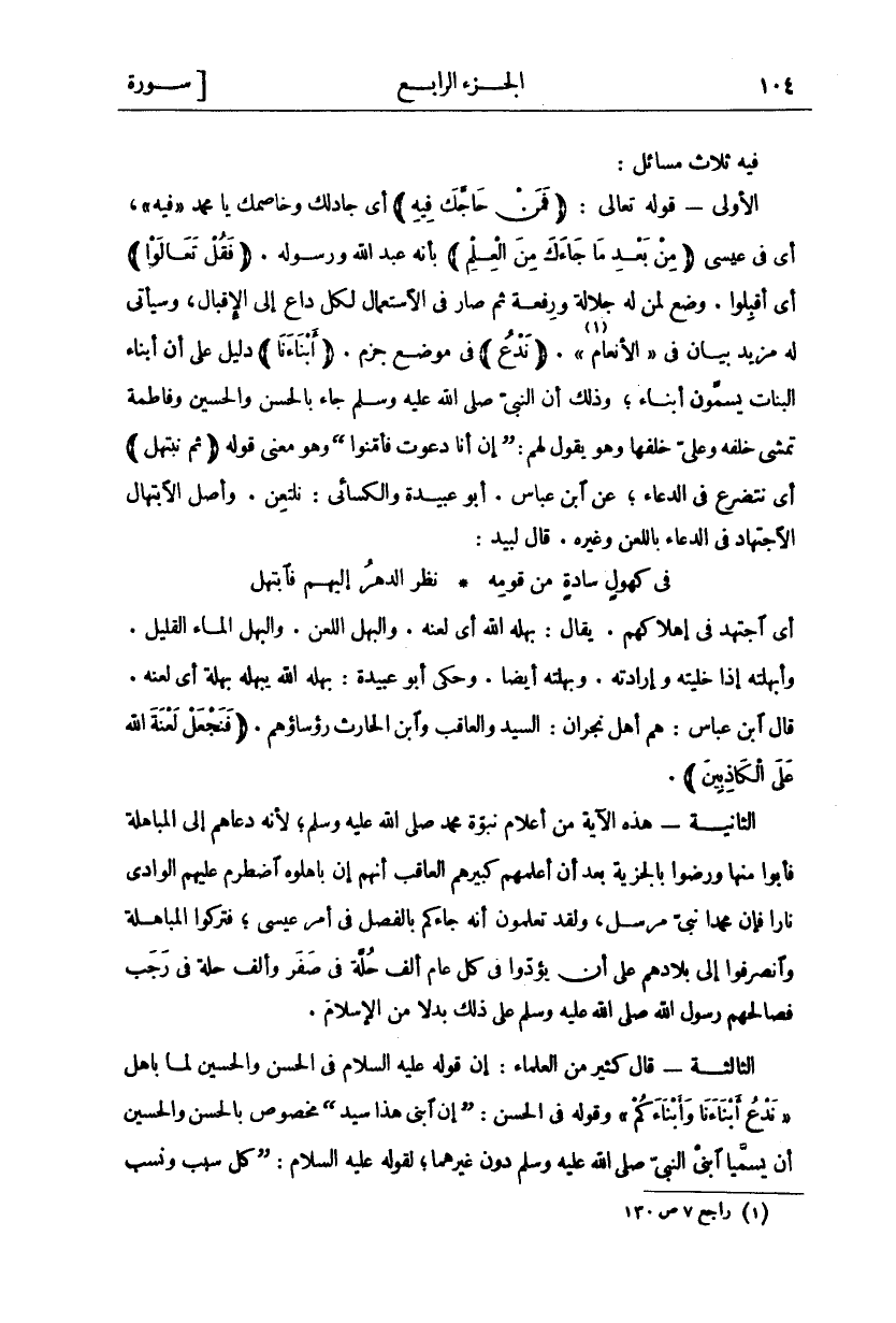 أَيِ اجْتَهَدَ فِي إِهْلَاكِهِمْ. يُقَالُ: بَهَلَهُ اللَّهُ أَيْ لَعَنَهُ. وَالْبَهْلُ: اللَّعْنُ. وَالْبَهْلُ الْمَاءُ الْقَلِيلُ. وَأَبْهَلْتُهُ إِذَا خَلَّيْتُهُ وَإِرَادَتَهُ. وَبَهَلْتُهُ أَيْضًا. وَحَكَى أَبُو عُبَيْدَةَ: بَهَلَهُ اللَّهُ يُبْهِلُهُ بَهْلَةً أَيْ لَعَنَهُ. قَالَ ابْنُ عَبَّاسٍ: هُمْ أَهْلُ نَجْرَانَ: السَّيِّدُ وَالْعَاقِبُ وابن الحارث رؤساؤهم. (فَنَجْعَلْ لَعْنَتَ اللَّهِ عَلَى الْكاذِبِينَ). الثَّانِيَةُ- هَذِهِ الْآيَةُ مِنْ أَعْلَامِ نُبُوَّةِ مُحَمَّدٍ صَلَّى اللَّهُ عَلَيْهِ وَسَلَّمَ، لِأَنَّهُ دَعَاهُمْ إِلَى الْمُبَاهَلَةِ فَأَبَوْا مِنْهَا وَرَضُوا بِالْجِزْيَةِ بَعْدَ أَنْ أَعْلَمَهُمْ كَبِيرُهُمُ الْعَاقِبُ أَنَّهُمْ إِنْ بَاهَلُوهُ اضْطَرَمَ عَلَيْهِمُ الْوَادِي نَارًا فَإِنَّ مُحَمَّدًا نَبِيٌّ مُرْسَلٌ، وَلَقَدْ تَعْلَمُونَ أَنَّهُ جَاءَكُمْ بِالْفَصْلِ فِي أَمْرِ عِيسَى، فَتَرَكُوا الْمُبَاهَلَةَ وَانْصَرَفُوا إِلَى بِلَادِهِمْ عَلَى أَنْ يُؤَدُّوا فِي كُلِّ عَامٍ أَلْفَ حُلَّةٍ فِي صَفَرٍ وَأَلْفَ حُلَّةٍ فِي رَجَبٍ فَصَالَحَهُمْ رَسُولُ اللَّهِ صَلَّى اللَّهُ عَلَيْهِ وَسَلَّمَ عَلَى ذَلِكَ بَدَلًا مِنَ الْإِسْلَامِ. الثَّالِثَةُ- قَالَ كَثِيرٌ مِنَ الْعُلَمَاءِ: إِنَّ قَوْلَهُ عَلَيْهِ السَّلَامُ فِي الْحَسَنِ وَالْحُسَيْنِ لَمَّا بَاهَلَ" نَدْعُ أَبْناءَنا وَأَبْناءَكُمْ" وَقَوْلَهُ فِي الْحَسَنِ: (إِنَّ ابْنِي هَذَا سَيِّدٌ) مَخْصُوصٌ بِالْحَسَنِ وَالْحُسَيْنِ أَنْ يُسَمَّيَا ابْنَيِ النَّبِيِّ صَلَّى اللَّهُ عَلَيْهِ وَسَلَّمَ دُونَ غَيْرِهِمَا، لِقَوْلِهِ عَلَيْهِ السَّلَامُ: (كُلُّ سَبَبٍ ونسب