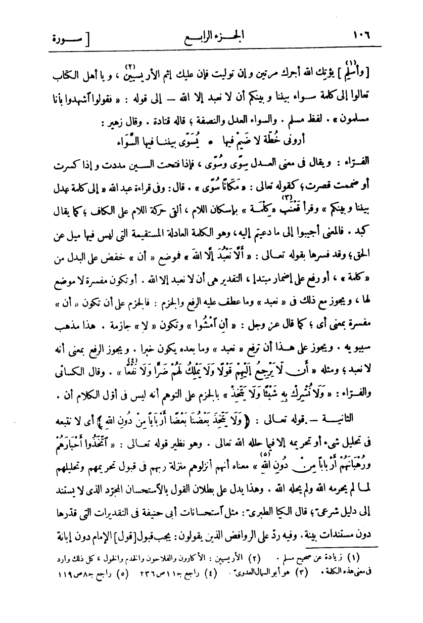 الْفَرَّاءُ: وَيُقَالُ فِي مَعْنَى الْعَدْلِ سِوًى وَسُوًى، فَإِذَا فَتَحْتَ السِّينَ مَدَدْتَ وَإِذَا كَسَرْتَ أَوْ ضَمَمْتَ قصرت، كقوله تعالى:" مَكاناً سُوىً" [طه: ٥٨]. قَالَ: وَفِي قِرَاءَةِ عَبْدِ اللَّهِ" إِلَى كَلِمَةِ عَدْلٍ بَيْنَنَا وَبَيْنَكُمْ" وَقَرَأَ قَعْنَبٌ «٣» " كِلْمَةٍ" بِإِسْكَانِ اللَّامِ، أَلْقَى حَرَكَةَ اللَّامِ عَلَى الْكَافِ، كَمَا يُقَالُ كِبْدٌ. فَالْمَعْنَى أَجِيبُوا إِلَى مَا دُعِيتُمْ إِلَيْهِ، وَهُوَ الْكَلِمَةُ الْعَادِلَةُ الْمُسْتَقِيمَةُ الَّتِي لَيْسَ فِيهَا مَيْلٌ عَنِ الْحَقِّ، وَقَدْ فَسَّرَهَا بقَوْلِهِ تَعَالَى:" أَلَّا نَعْبُدَ إِلَّا اللَّهَ" فَمَوْضِعُ" أَنْ" خُفِضَ عَلَى الْبَدَلِ مِنْ" كَلِمَةٍ"، أَوْ رُفِعَ عَلَى إِضْمَارِ مُبْتَدَأٍ، التَّقْدِيرُ هِيَ أَنْ لَا نَعْبُدَ إِلَّا اللَّهَ. أَوْ تَكُونُ مُفَسِّرَةً لَا مَوْضِعَ لَهَا، وَيَجُوزُ مَعَ ذَلِكَ فِي" نَعْبُدَ" وَمَا عُطِفَ عَلَيْهِ الرَّفْعُ وَالْجَزْمُ: فَالْجَزْمُ عَلَى أَنْ تَكُونَ" أَنْ" مُفَسِّرَةً بِمَعْنَى أَيْ، كَمَا قال عز وجل:" أَنِ امْشُوا" [ص: ٦] وَتَكُونُ" لَا" جَازِمَةً. هَذَا مَذْهَبُ سِيبَوَيْهِ. وَيَجُوزُ عَلَى هَذَا أَنْ تَرْفَعَ" نَعْبُدُ" وَمَا بَعْدَهُ يَكُونُ خَبَرًا. وَيَجُوزُ الرَّفْعُ بِمَعْنَى أَنَّهُ لَا نَعْبُدُ، وَمِثْلُهُ" أَلَّا يَرْجِعُ إِلَيْهِمْ قَوْلًا وَلا يَمْلِكُ لَهُمْ ضَرًّا وَلا نَفْعاً" [طه: ٨٩] «٤». وَقَالَ الْكِسَائِيُّ وَالْفَرَّاءُ:" وَلا نُشْرِكَ بِهِ شَيْئاً وَلا يَتَّخِذَ" بِالْجَزْمِ عَلَى التَّوَهُّمِ أَنَّهُ لَيْسَ فِي أَوَّلِ الْكَلَامِ أَنْ. الثَّانِيَةُ- قَوْلُهُ تَعَالَى: (وَلا يَتَّخِذَ بَعْضُنا بَعْضاً أَرْباباً مِنْ دُونِ اللَّهِ) أي لا نتبعه في تحليل شي أَوْ تَحْرِيمِهِ إِلَّا فِيمَا حَلَّلَهُ اللَّهُ تَعَالَى. وَهُوَ نَظِيرُ قَوْلِهِ تَعَالَى:" اتَّخَذُوا أَحْبارَهُمْ وَرُهْبانَهُمْ أَرْباباً مِنْ دُونِ اللَّهِ" [التوبة: ٣١] «٥» مَعْنَاهُ أَنَّهُمْ أَنْزَلُوهُمْ مَنْزِلَةَ رَبِّهِمْ فِي قَبُولِ تَحْرِيمِهِمْ وَتَحْلِيلِهِمْ لِمَا لَمْ يُحَرِّمْهُ اللَّهُ وَلَمْ يُحِلَّهُ اللَّهُ. وَهَذَا يَدُلُّ عَلَى بُطْلَانِ الْقَوْلِ بِالِاسْتِحْسَانِ الْمُجَرَّدِ الَّذِي لَا يَسْتَنِدُ إِلَى دَلِيلٍ شَرْعِيٍّ، قَالَ الْكِيَا الطَّبَرِيُّ: مِثْلَ اسْتِحْسَانَاتِ أَبِي حَنِيفَةَ فِي التَّقْدِيرَاتِ الَّتِي قَدَّرَهَا دُونَ مُسْتَنَدَاتٍ بَيِّنَةٍ. وَفِيهِ رَدٌّ عَلَى الرَّوَافِضِ الَّذِينَ يَقُولُونَ: يجب قبول [قول] الامام دون إبانة