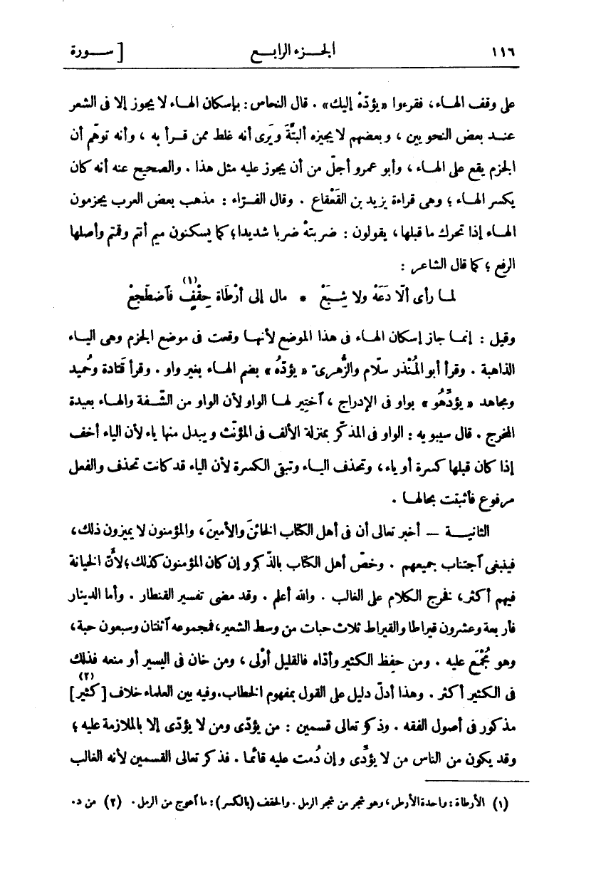 عَلَى وَقْفِ الْهَاءِ، فَقَرَءُوا" يُؤَدِّهِ إِلَيْكَ". قَالَ النَّحَّاسُ: بِإِسْكَانِ الْهَاءِ لَا يَجُوزُ إِلَّا فِي الشِّعْرِ عِنْدَ بَعْضِ النَّحْوِيِّينَ، وَبَعْضُهُمْ لَا يُجِيزُهُ أَلْبَتَّةَ وَيَرَى أَنَّهُ غَلَطٌ مِمَّنْ قَرَأَ بِهِ، وَإِنَّهُ تَوَهَّمَ أَنَّ الْجَزْمَ يَقَعُ عَلَى الْهَاءِ، وَأَبُو عَمْرٍو أَجَلُّ مِنْ أَنْ يَجُوزَ عَلَيْهِ مِثْلُ هَذَا. وَالصَّحِيحُ عَنْهُ أَنَّهُ كَانَ يَكْسِرُ الْهَاءَ، وَهِيَ قِرَاءَةُ يَزِيدَ بْنِ الْقَعْقَاعِ. وَقَالَ الْفَرَّاءُ: مَذْهَبُ بَعْضِ الْعَرَبِ يَجْزِمُونَ الْهَاءَ إِذَا تَحَرَّكَ مَا قَبْلَهَا، يَقُولُونَ: ضَرَبْتُهُ ضَرْبًا شَدِيدًا، كَمَا يُسَكِّنُونَ مِيمَ أَنْتُمْ وَقُمْتُمْ وَأَصْلُهَا الرَّفْعُ، كَمَا قَالَ الشَّاعِرُ:
