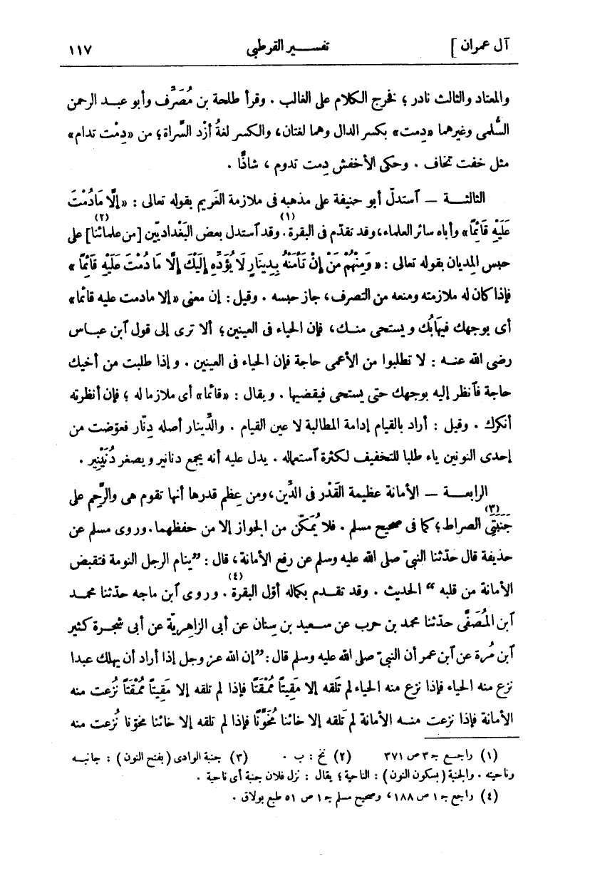 وَالْمُعْتَادُ وَالثَّالِثُ نَادِرٌ، فَخَرَجَ الْكَلَامُ عَلَى الْغَالِبِ. وَقَرَأَ طَلْحَةُ بْنُ مُصَرِّفٍ وَأَبُو عَبْدِ الرَّحْمَنِ السُّلَمِيُّ وَغَيْرُهُمَا" دِمْتَ" بِكَسْرِ الدَّالِّ وَهُمَا لُغَتَانِ، وَالْكَسْرُ لُغَةُ أَزْدِ السَّرَاةِ، مِنْ" دِمْتَ تُدَامُ" مِثْلَ خِفْتَ تُخَافُ. وَحَكَى الْأَخْفَشُ دِمْتَ تَدُومُ، شَاذًّا. الثَّالِثَةُ- اسْتَدَلَّ أَبُو حَنِيفَةَ عَلَى مَذْهَبِهِ فِي مُلَازَمَةِ الْغَرِيمِ بِقَوْلِهِ تَعَالَى:" إِلَّا مَا دُمْتَ عَلَيْهِ قائِماً" وَأَبَاهُ سَائِرُ الْعُلَمَاءِ، وَقَدْ تَقَدَّمَ فِي الْبَقَرَةِ «١». وَقَدِ اسْتَدَلَّ بَعْضُ الْبَغْدَادِيِّينَ [مِنْ عُلَمَائِنَا] «٢» عَلَى حَبْسِ الْمِدْيَانِ بِقَوْلِهِ تَعَالَى:" وَمِنْهُمْ مَنْ إِنْ تَأْمَنْهُ بِدِينارٍ لَا يُؤَدِّهِ إِلَيْكَ إِلَّا مَا دُمْتَ عَلَيْهِ قائِماً" فَإِذَا كَانَ لَهُ مُلَازَمَتُهُ وَمَنْعُهُ مِنَ التَّصَرُّفِ، جَازَ حَبْسُهُ. وَقِيلَ: إِنَّ مَعْنَى" إِلَّا مَا دُمْتَ عَلَيْهِ قائِماً" أَيْ بِوَجْهِكَ فَيَهَابُكَ وَيَسْتَحِي مِنْكَ، فَإِنَّ الْحَيَاءَ فِي الْعَيْنَيْنِ، أَلَا تَرَى إِلَى قَوْلِ ابْنِ عَبَّاسٍ رَضِيَ اللَّهُ عَنْهُ: لَا تَطْلُبُوا مِنَ الْأَعْمَى حَاجَةً فَإِنَّ الْحَيَاءَ فِي الْعَيْنَيْنِ. وَإِذَا طَلَبْتَ مِنْ أَخِيكَ حَاجَةً فَانْظُرْ إِلَيْهِ بِوَجْهِكَ حَتَّى يَسْتَحِيَ فَيَقْضِيهَا. وَيُقَالُ:" قائِماً" أَيْ مُلَازِمًا لَهُ، فَإِنْ أَنْظَرْتَهُ أَنْكَرَكَ. وَقِيلَ: أَرَادَ بِالْقِيَامِ إِدَامَةَ الْمُطَالَبَةِ لَا عَيْنَ الْقِيَامِ. وَالدِّينَارُ أَصْلُهُ دِنَّارٌ فَعُوِّضَتْ مِنْ إِحْدَى النُّونَيْنِ يَاءٌ طَلَبًا لِلتَّخْفِيفِ لِكَثْرَةِ اسْتِعْمَالِهِ. يَدُلُّ عَلَيْهِ أَنَّهُ يُجْمَعُ دَنَانِيرُ وَيُصَغَّرُ دُنَيْنِيرُ. الرَّابِعَةُ- الْأَمَانَةُ عَظِيمَةُ الْقَدْرِ فِي الدِّينِ، وَمِنْ عِظَمِ قَدْرِهَا أَنَّهَا تَقُومُ هِيَ وَالرَّحِمِ عَلَى جَنَبَتَيِ «٣» الصِّرَاطِ، كَمَا فِي صَحِيحِ مُسْلِمٍ. فَلَا يُمَكَّنُ مِنَ الْجَوَازِ إِلَّا مَنْ حَفِظَهُمَا. وَرَوَى مُسْلِمٌ عَنْ حُذَيْفَةَ قَالَ حَدَّثَنَا النَّبِيُّ صَلَّى اللَّهُ عَلَيْهِ وَسَلَّمَ عَنْ رَفْعِ الْأَمَانَةِ، قَالَ: (يَنَامُ الرَّجُلُ النَّوْمَةَ فَتُقْبَضُ الْأَمَانَةُ مِنْ قَلْبِهِ) الْحَدِيثَ. وَقَدْ تَقَدَّمَ بِكَمَالِهِ أَوَّلَ الْبَقَرَةِ «٤». وَرَوَى ابْنُ مَاجَهْ حدثنا محمد ابن الْمُصَفَّى حَدَّثَنَا مُحَمَّدُ بْنُ حَرْبٍ عَنْ سَعِيدِ بْنِ سِنَانٍ عَنْ أَبِي الزَّاهِرِيَّةِ عَنْ أَبِي شجرة كثير ابن مُرَّةَ عَنِ ابْنِ عُمَرَ أَنَّ النَّبِيَّ صَلَّى اللَّهُ عَلَيْهِ وَسَلَّمَ قَالَ: (إِنَّ اللَّهَ عَزَّ وَجَلَّ إِذَا أَرَادَ أَنْ يُهْلِكَ عَبْدًا نَزَعَ مِنْهُ الْحَيَاءَ فَإِذَا نَزَعَ مِنْهُ الْحَيَاءَ لَمْ تَلْقَهُ إِلَّا مَقِيتًا مُمْقَتًا فَإِذَا لَمْ تَلْقَهُ إِلَّا مَقِيتًا مُمْقَتًا نُزِعَتْ مِنْهُ الْأَمَانَةُ فَإِذَا نُزِعَتْ مِنْهُ الْأَمَانَةُ لَمْ تَلْقَهُ إِلَّا خَائِنًا مُخَوَّنًا فَإِذَا لَمْ تَلْقَهُ إِلَّا خَائِنًا مُخَوَّنًا نزعت منه