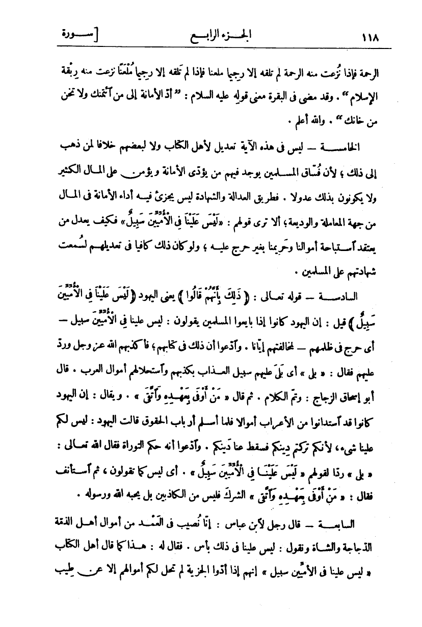 الرَّحْمَةُ فَإِذَا نُزِعَتْ مِنْهُ الرَّحْمَةُ لَمْ تَلْقَهُ إِلَّا رَجِيمًا مُلَعَّنًا فَإِذَا لَمْ تَلْقَهُ إِلَّا رَجِيمًا مُلَعَّنًا نُزِعَتْ مِنْهُ رِبْقَةُ الْإِسْلَامِ (. وَقَدْ مَضَى فِي الْبَقَرَةِ مَعْنَى قَوْلِهِ عَلَيْهِ السَّلَامُ:) أد الأمانة إلى من ائتمنك ولا نحن مَنْ خَانَكَ (. وَاللَّهُ أَعْلَمُ. الْخَامِسَةُ لَيْسَ فِي هَذِهِ الْآيَةِ تَعْدِيلٌ لِأَهْلِ الْكِتَابِ وَلَا لِبَعْضِهِمْ خِلَافًا لِمَنْ ذَهَبَ إِلَى ذَلِكَ، لِأَنَّ فُسَّاقَ الْمُسْلِمِينَ يُوجَدُ فِيهِمْ مَنْ يُؤَدِّي الْأَمَانَةَ وَيُؤْمَنُ عَلَى الْمَالِ الْكَثِيرِ وَلَا يَكُونُونَ بِذَلِكَ عُدُولًا. فَطَرِيقُ الْعَدَالَةِ وَالشَّهَادَةِ لَيْسَ يُجْزِئُ فِيهِ أَدَاءُ الْأَمَانَةِ فِي الْمَالِ مِنْ جِهَةِ الْمُعَامَلَةِ وَالْوَدِيعَةِ، أَلَا تَرَى قَوْلَهُمْ:" لَيْسَ عَلَيْنا فِي الْأُمِّيِّينَ سَبِيلٌ" [آل عمران: ٧٥] فَكَيْفَ يُعَدَّلُ مَنْ يَعْتَقِدُ اسْتِبَاحَةَ أَمْوَالِنَا وَحَرِيمِنَا بِغَيْرِ حَرَجِ عَلَيْهِ، وَلَوْ كَانَ ذَلِكَ كَافِيًا فِي تَعْدِيلِهِمْ لَسُمِعَتْ شَهَادَتُهُمْ عَلَى الْمُسْلِمِينَ. السَّادِسَةُ- قَوْلُهُ تَعَالَى: (ذلِكَ بِأَنَّهُمْ قالُوا) يَعْنِي الْيَهُودَ (لَيْسَ عَلَيْنا فِي الْأُمِّيِّينَ سَبِيلٌ) قِيلَ: إِنَّ الْيَهُودَ كَانُوا إِذَا بَايَعُوا الْمُسْلِمِينَ يَقُولُونَ: لَيْسَ عَلَيْنَا فِي الْأُمِّيِّينَ سَبِيلٌ- أَيْ حَرَجٌ فِي ظُلْمِهِمْ- لِمُخَالَفَتِهِمْ إِيَّانَا. وَادَّعَوْا أَنَّ ذَلِكَ فِي كِتَابِهِمْ، فَأَكْذَبَهُمُ اللَّهُ عَزَّ وَجَلَّ وَرَدَّ عَلَيْهِمْ فَقَالَ:" بَلى " أَيْ بَلَى عَلَيْهِمْ سَبِيلٌ الْعَذَابِ بِكَذِبِهِمْ وَاسْتِحْلَالِهِمْ أَمْوَالَ الْعَرَبِ. قَالَ أَبُو إِسْحَاقَ الزَّجَّاجُ: وَتَمَّ الْكَلَامُ. ثُمَّ قَالَ:" مَنْ أَوْفى بِعَهْدِهِ وَاتَّقى " [آل عمران: ٧٦]. وَيُقَالُ: إِنَّ الْيَهُودَ كَانُوا قَدِ اسْتَدَانُوا مِنَ الْأَعْرَابِ أَمْوَالًا فَلَمَّا أَسْلَمَ أَرْبَابُ الْحُقُوقِ قَالَتِ اليهود: ليس لكم علينا شي، لِأَنَّكُمْ تَرَكْتُمْ دِينَكُمْ فَسَقَطَ عَنَّا دَيْنُكُمْ. وَادَّعَوْا أَنَّهُ حُكْمُ التَّوْرَاةِ فَقَالَ اللَّهُ تَعَالَى:" بَلى " رَدًّا لِقَوْلِهِمْ" لَيْسَ عَلَيْنا فِي الْأُمِّيِّينَ سَبِيلٌ". أَيْ لَيْسَ كَمَا تَقُولُونَ، ثُمَّ اسْتَأْنَفَ فَقَالَ:" مَنْ أَوْفى بِعَهْدِهِ وَاتَّقى " الشِّرْكَ فَلَيْسَ مِنَ الْكَاذِبِينَ بَلْ يُحِبُّهُ اللَّهُ وَرَسُولُهُ. السَّابِعَةُ- قَالَ رَجُلٌ لِابْنِ عَبَّاسٍ: إِنَّا نُصِيبُ فِي الْعَمْدِ مِنْ أَمْوَالِ أَهْلِ الذِّمَّةِ الدَّجَاجَةَ وَالشَّاةَ وَنَقُولُ: لَيْسَ عَلَيْنَا فِي ذَلِكَ بَأْسٌ. فَقَالَ لَهُ: هَذَا كَمَا قَالَ أَهْلُ الْكِتَابِ" لَيْسَ عَلَيْنا فِي الْأُمِّيِّينَ سَبِيلٌ" إِنَّهُمْ إِذَا أَدَّوُا الْجِزْيَةَ لَمْ تَحِلَّ لَكُمْ أَمْوَالُهُمْ إِلَّا عَنْ طِيبِ