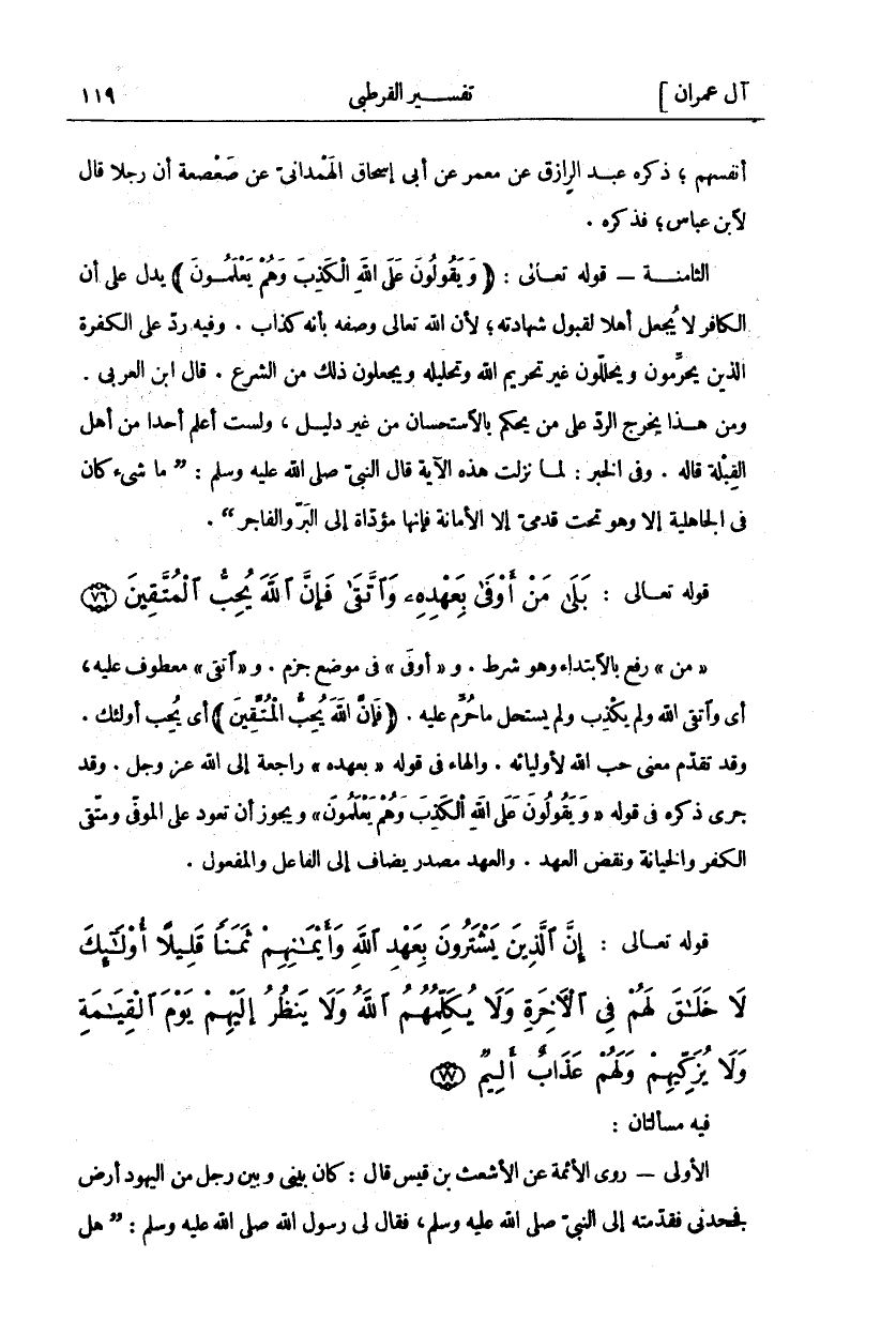 إِنَّ الَّذِينَ يَشْتَرُونَ بِعَهْدِ اللَّهِ وَأَيْمانِهِمْ ثَمَناً قَلِيلاً أُولئِكَ لَا خَلاقَ لَهُمْ فِي الْآخِرَةِ وَلا يُكَلِّمُهُمُ اللَّهُ وَلا يَنْظُرُ إِلَيْهِمْ يَوْمَ الْقِيامَةِ وَلا يُزَكِّيهِمْ وَلَهُمْ عَذابٌ أَلِيمٌ (٧٧)