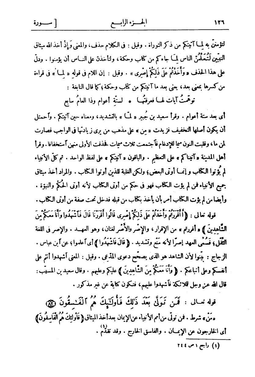 أَيْ بَعْدَ سِتَّةِ أَعْوَامٍ. وَقَرَأَ سعيد بن خبير" لَمَّا" بِالتَّشْدِيدِ، وَمَعْنَاهُ حِينَ آتَيْتُكُمْ. وَاحْتَمَلَ أَنْ يَكُونَ أَصْلُهَا التَّخْفِيفَ فَزِيدَتْ" مِنْ" عَلَى مَذْهَبِ مَنْ يَرَى زِيَادَتَهَا فِي الْوَاجِبِ فَصَارَتْ لِمَنْ مَا، وَقُلِبَتِ النُّونُ مِيمًا لِلْإِدْغَامِ فَاجْتَمَعَتْ ثَلَاثُ مِيمَاتٍ فَحُذِفَتِ الْأُولَى مِنْهُنَّ اسْتِخْفَافًا. وَقَرَأَ أَهْلُ الْمَدِينَةِ" آتَيْنَاكُمْ" عَلَى التَّعْظِيمِ. وَالْبَاقُونَ" آتَيْتُكُمْ" عَلَى لَفْظِ الْوَاحِدِ. ثُمَّ كُلُّ الْأَنْبِيَاءِ لَمْ يُؤْتُوا الْكِتَابَ وَإِنَّمَا أُوتِيَ الْبَعْضُ، وَلَكِنَّ الْغَلَبَةَ لِلَّذِينَ أُوتُوا الْكِتَابَ. وَالْمُرَادُ أَخْذُ مِيثَاقِ جَمِيعِ الْأَنْبِيَاءِ فَمَنْ لَمْ يُؤْتَ الْكِتَابَ فَهُوَ فِي حُكْمِ مَنْ أُوتِيَ الْكِتَابَ لِأَنَّهُ أُوتِيَ الْحُكْمَ وَالنُّبُوَّةَ. وَأَيْضًا مَنْ لَمْ يُؤْتَ الْكِتَابَ أُمِرَ بِأَنْ يَأْخُذَ بِكِتَابِ مَنْ قَبْلَهُ فَدَخَلَ تَحْتَ صِفَةِ مَنْ أُوتِيَ الْكِتَابَ. قَوْلُهُ تَعَالَى: (أَأَقْرَرْتُمْ وَأَخَذْتُمْ عَلى ذلِكُمْ إِصْرِي قالُوا أَقْرَرْنا قالَ فَاشْهَدُوا وَأَنَا مَعَكُمْ مِنَ الشَّاهِدِينَ)