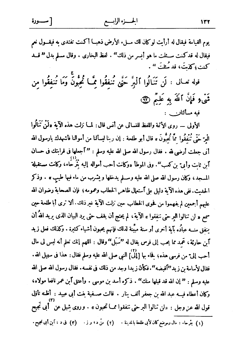 فِيهِ مَسْأَلَتَانِ: الْأُولَى- رَوَى الْأَئِمَّةُ وَاللَّفْظُ لِلنَّسَائِيِّ عَنْ أَنَسٍ قَالَ: لَمَّا نَزَلَتْ هَذِهِ الْآيَةُ:" لَنْ تَنالُوا الْبِرَّ حَتَّى تُنْفِقُوا مِمَّا تُحِبُّونَ" قَالَ أَبُو طَلْحَةَ: إِنَّ رَبَّنَا لَيَسْأَلُنَا مِنْ أَمْوَالِنَا فَأُشْهِدُكَ يَا رَسُولَ اللَّهِ أَنِّي جَعَلْتُ أَرْضِي لِلَّهِ. فَقَالَ رَسُولُ اللَّهِ صَلَّى اللَّهُ عَلَيْهِ وَسَلَّمَ: (اجْعَلْهَا فِي قَرَابَتِكَ فِي حسان ابن ثَابِتٍ وَأُبَيِّ بْنِ كَعْبٍ). وَفِي الْمُوَطَّأِ" وَكَانَتْ أَحَبَّ أَمْوَالِهِ إِلَيْهِ بِئْرُ حَاءٍ «١»، وَكَانَتْ مُسْتَقْبِلَةَ الْمَسْجِدِ، وَكَانَ رَسُولُ اللَّهِ صَلَّى اللَّهُ عَلَيْهِ وَسَلَّمَ يَدْخُلُهَا وَيَشْرَبُ مِنْ مَاءٍ فِيهَا طَيِّبٍ". وَذَكَرَ الْحَدِيثَ. فَفِي هَذِهِ الْآيَةِ دَلِيلٌ عَلَى اسْتِعْمَالِ ظَاهِرِ الْخِطَابِ وَعُمُومِهِ، فَإِنَّ الصَّحَابَةَ رِضْوَانُ اللَّهِ عَلَيْهِمْ أَجْمَعِينَ لَمْ يَفْهَمُوا مِنْ فَحْوَى الْخِطَابِ حِينَ نَزَلَتِ الْآيَةُ غَيْرَ ذَلِكَ. أَلَا تَرَى أَبَا طَلْحَةَ حِينَ سَمِعَ" لَنْ تَنالُوا الْبِرَّ حَتَّى تُنْفِقُوا" الْآيَةَ، لَمْ يَحْتَجْ أَنْ يَقِفَ حَتَّى يَرِدَ الْبَيَانُ الَّذِي يُرِيدُ اللَّهُ أَنْ يُنْفِقَ مِنْهُ عِبَادُهُ بِآيَةٍ أُخْرَى أَوْ سُنَّةٍ مُبَيِّنَةٍ لِذَلِكَ فَإِنَّهُمْ يُحِبُّونَ أَشْيَاءَ كَثِيرَةً. وكذلك فعل زيد ابن حَارِثَةَ، عَمَدَ مِمَّا يُحِبُّ إِلَى فَرَسٍ يُقَالُ لَهُ (سَبَلٌ) وَقَالَ: اللَّهُمَّ إِنَّكَ تَعْلَمُ أَنَّهُ لَيْسَ لِي مَالٌ أَحَبَّ إِلَيَّ مِنْ فَرَسِي هَذِهِ، فَجَاءَ بِهَا [إِلَى] «٢» النَّبِيِّ صَلَّى اللَّهُ عَلَيْهِ وَسَلَّمَ فَقَالَ: هَذَا فِي سَبِيلِ اللَّهِ. فَقَالَ لِأُسَامَةَ بْنِ زَيْدٍ (اقْبِضْهُ). فَكَأَنَّ زَيْدًا وَجَدَ مِنْ ذَلِكَ فِي نَفْسِهِ. فَقَالَ رَسُولُ اللَّهِ صَلَّى اللَّهُ عَلَيْهِ وَسَلَّمَ: (إِنَّ اللَّهَ قَدْ قَبِلَهَا مِنْكَ). ذَكَرَهُ أَسَدُ بْنُ مُوسَى. وَأَعْتَقُ ابْنُ عُمَرَ نَافِعًا مَوْلَاهُ، وَكَانَ أَعْطَاهُ فِيهِ عَبْدَ اللَّهِ بْنَ جَعْفَرٍ أَلْفَ دِينَارٍ. قالت صفية بنت أبي عبيد: أَظُنُّهُ تَأَوَّلَ قَوْلَ اللَّهِ عَزَّ وَجَلَّ:" لَنْ تَنالُوا الْبِرَّ حَتَّى تُنْفِقُوا مِمَّا تُحِبُّونَ". وروى شبل عن «٣» أبي نجيح