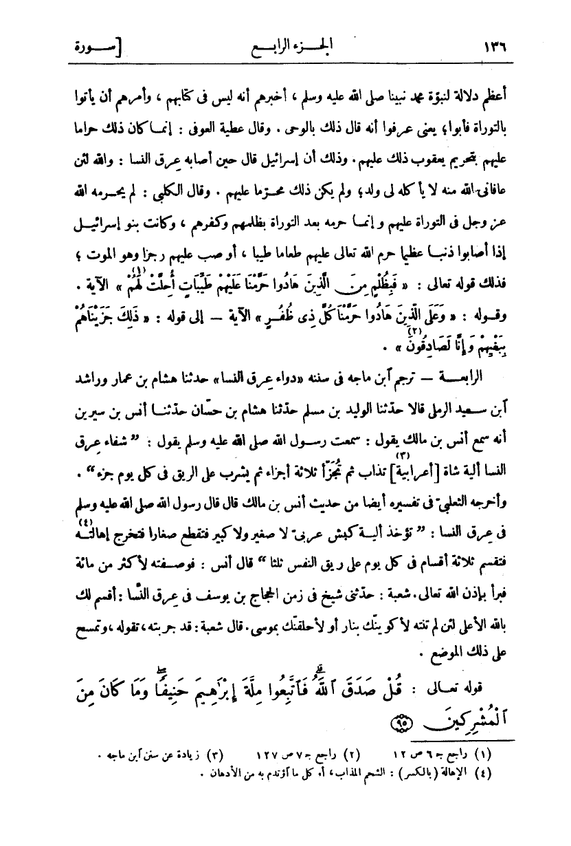 أَعْظَمُ دِلَالَةٍ لِنُبُوَّةِ مُحَمَّدٍ نَبِيِّنَا صَلَّى اللَّهُ عَلَيْهِ وَسَلَّمَ، أَخْبَرَهُمْ أَنَّهُ لَيْسَ فِي كِتَابِهِمْ، وَأَمَرَهُمْ أَنْ يَأْتُوا بِالتَّوْرَاةِ فَأَبَوْا، يَعْنِي عَرَفُوا أَنَّهُ قَالَ ذَلِكَ بِالْوَحْيِ. وَقَالَ عَطِيَّةُ الْعَوْفِيُّ: إِنَّمَا كَانَ ذَلِكَ حَرَامًا عَلَيْهِمْ بِتَحْرِيمِ يَعْقُوبَ ذَلِكَ عَلَيْهِمْ. وَذَلِكَ أَنَّ إِسْرَائِيلَ قَالَ حِينَ أَصَابَهُ عِرْقُ النَّسَا: وَاللَّهُ لَئِنْ عَافَانِي اللَّهُ مِنْهُ لَا يَأْكُلُهُ لِي وَلَدٌ، وَلَمْ يَكُنْ ذَلِكَ مُحَرَّمًا عَلَيْهِمْ. وَقَالَ الْكَلْبِيُّ: لَمْ يُحَرِّمْهُ اللَّهُ عَزَّ وَجَلَّ فِي التَّوْرَاةِ عَلَيْهِمْ وَإِنَّمَا حَرَّمَهُ بَعْدَ التَّوْرَاةِ بِظُلْمِهِمْ وَكُفْرِهِمْ، وَكَانَتْ بَنُو إِسْرَائِيلَ إِذَا أَصَابُوا ذَنْبًا عَظِيمًا حَرَّمَ اللَّهُ تَعَالَى عَلَيْهِمْ طَعَامًا طَيِّبًا، أَوْ صَبَّ عَلَيْهِمْ رِجْزًا وَهُوَ الْمَوْتُ، فَذَلِكَ قَوْلُهُ تَعَالَى:" فَبِظُلْمٍ مِنَ الَّذِينَ هادُوا حَرَّمْنا عَلَيْهِمْ طَيِّباتٍ أُحِلَّتْ لَهُمْ" [النساء: ١٦٠] «١» الْآيَةَ. وَقَوْلُهُ:" وَعَلَى الَّذِينَ هادُوا حَرَّمْنا كُلَّ ذِي ظُفُرٍ" الْآيَةَ- إِلَى قَوْلِهِ:" ذلِكَ جَزَيْناهُمْ بِبَغْيِهِمْ"" وَإِنَّا لَصادِقُونَ" [الانعام: ١٤٦] «٢». الرَّابِعَةُ- تَرْجَمَ ابْنُ مَاجَهْ فِي سُنَنِهِ" دَوَاءَ عِرْقِ النَّسَا" حَدَّثَنَا هِشَامُ بْنُ عَمَّارٍ وَرَاشِدُ ابن سَعِيدٍ الرَّمْلِيُّ قَالَا حَدَّثَنَا الْوَلِيدُ بْنُ مُسْلِمٍ حَدَّثَنَا هِشَامُ بْنُ حَسَّانَ حَدَّثَنَا أَنَسُ بْنُ سِيرِينَ أَنَّهُ سَمِعَ أَنَسَ بْنَ مَالِكٍ يَقُولُ: سَمِعْتُ رَسُولَ اللَّهِ صَلَّى اللَّهُ عَلَيْهِ وَسَلَّمَ يَقُولُ: (شِفَاءُ عِرْقِ النَّسَا أَلْيَةُ شَاةٍ [أَعْرَابِيَّةٍ] «٣» تُذَابُ ثُمَّ تُجَزَّأُ ثَلَاثَةَ أَجْزَاءٍ ثُمَّ يُشْرَبُ عَلَى الرِّيقِ فِي كُلِّ يَوْمٍ جُزْءٌ). وَأَخْرَجَهُ الثَّعْلَبِيُّ فِي تَفْسِيرِهِ أَيْضًا مِنْ حَدِيثِ أَنَسِ بْنِ مَالِكٍ قَالَ قَالَ رَسُولُ اللَّهِ صَلَّى اللَّهُ عَلَيْهِ وَسَلَّمَ فِي عِرْقِ النَّسَا: (تُؤْخَذُ أَلْيَةُ كَبْشٍ عَرَبِيٍّ لَا صَغِيرَ وَلَا كَبِيرَ فتقطع صغارا فتخرج إهالته «٤» فتقسم ثَلَاثَةَ أَقْسَامٍ فِي كُلِّ يَوْمٍ عَلَى رِيقِ النَّفَسِ ثُلُثًا) قَالَ أَنَسٌ: فَوَصَفْتُهُ لِأَكْثَرِ مِنْ مِائَةٍ فَبَرَأَ بِإِذْنِ اللَّهِ تَعَالَى. شُعْبَةُ: حَدَّثَنِي شَيْخٌ فِي زَمَنِ الْحَجَّاجِ بْنِ يُوسُفَ فِي عِرْقِ النَّسَا: أُقْسِمُ لَكَ بِاللَّهِ الْأَعْلَى لَئِنْ لَمْ تَنْتَهِ لَأَكْوِيَنَّكَ بِنَارٍ أَوْ لَأَحْلِقَنَّكَ بِمُوسَى. قَالَ شُعْبَةُ: قَدْ جَرَّبْتُهُ، تَقُولُهُ، وَتَمْسَحُ عَلَى ذلك الموضع.