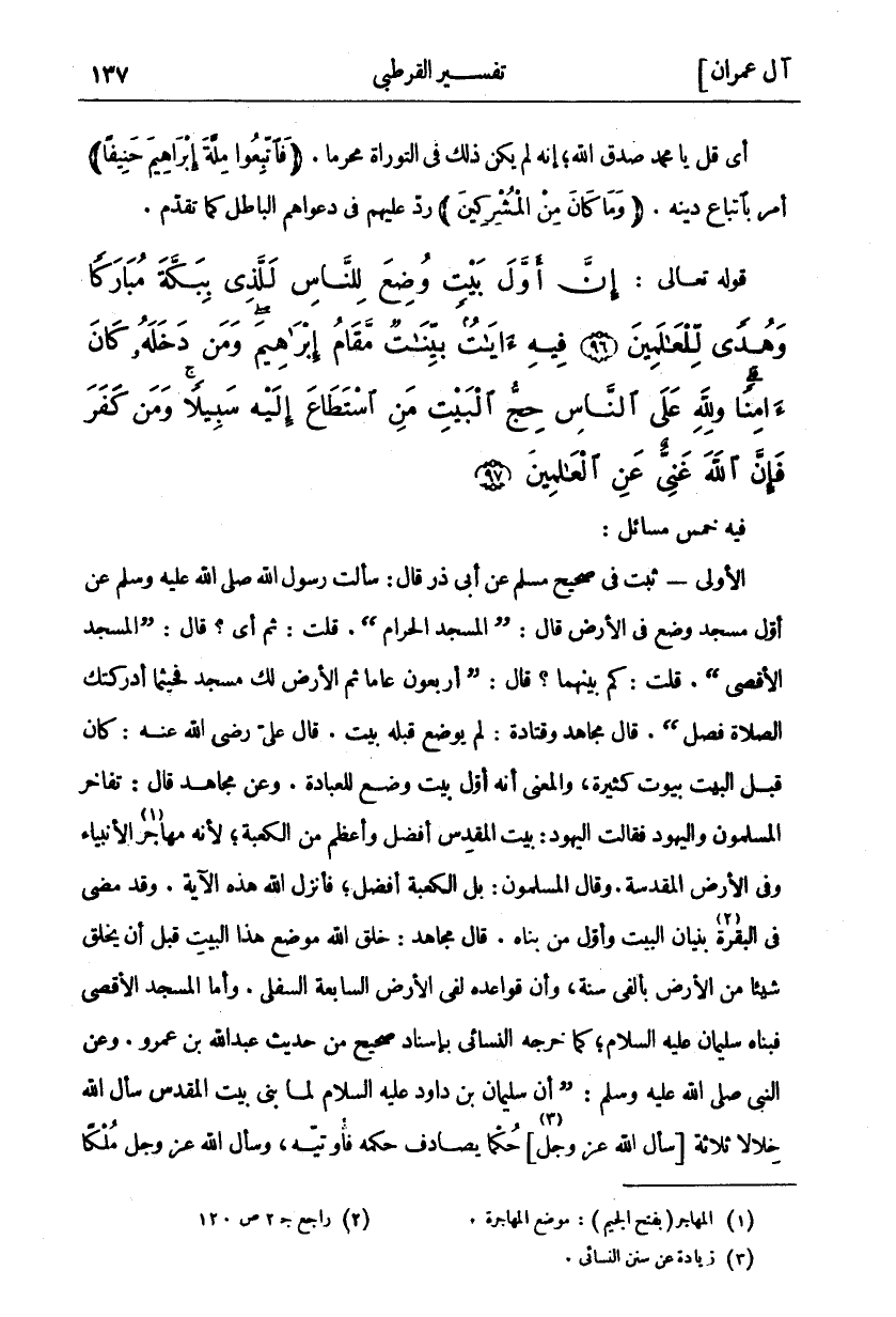 فِيهِ خَمْسُ مَسَائِلَ: الْأُولَى- ثَبَتَ فِي صَحِيحِ مُسْلِمٍ عَنْ أَبِي ذَرٍّ قَالَ: سَأَلْتُ رَسُولَ اللَّهِ صَلَّى اللَّهُ عَلَيْهِ وَسَلَّمَ عَنْ أَوَّلِ مَسْجِدٍ وُضِعَ فِي الْأَرْضِ قَالَ: (الْمَسْجِدُ الْحَرَامُ). قُلْتُ: ثُمَّ أَيَّ؟ قَالَ: (الْمَسْجِدُ الْأَقْصَى). قُلْتُ: كَمْ بَيْنَهُمَا؟ قَالَ: (أَرْبَعُونَ عَامًا ثُمَّ الْأَرْضُ لَكَ مَسْجِدٌ فَحَيْثُمَا أَدْرَكَتْكَ الصَّلَاةُ فَصَلِّ). قَالَ مُجَاهِدٌ وَقَتَادَةُ: لَمْ يُوضَعْ قَبْلَهُ بَيْتٌ. قَالَ عَلِيٌّ رَضِيَ اللَّهُ عَنْهُ: كَانَ قَبْلَ الْبَيْتِ بُيُوتٌ كَثِيرَةٌ، وَالْمَعْنَى أَنَّهُ أَوَّلُ بَيْتٍ وُضِعَ لِلْعِبَادَةِ. وَعَنْ مُجَاهِدٍ قَالَ: تَفَاخَرَ الْمُسْلِمُونَ وَالْيَهُودُ فَقَالَتِ الْيَهُودُ: بَيْتُ الْمَقْدِسِ أَفْضَلُ وَأَعْظَمُ مِنَ الْكَعْبَةِ، لِأَنَّهُ مُهَاجَرُ «١» الْأَنْبِيَاءِ وَفِي الْأَرْضِ الْمُقَدَّسَةِ. وَقَالَ الْمُسْلِمُونَ: بَلِ الْكَعْبَةُ أَفْضَلُ، فَأَنْزَلَ اللَّهُ هَذِهِ الْآيَةَ. وَقَدْ مَضَى فِي الْبَقَرَةِ «٢» بُنْيَانُ الْبَيْتِ وَأَوَّلُ مَنْ بَنَاهُ. قَالَ مُجَاهِدٌ: خَلَقَ اللَّهُ مَوْضِعَ هَذَا الْبَيْتِ قَبْلَ أَنْ يَخْلُقَ شَيْئًا مِنَ الْأَرْضِ بِأَلْفَيْ سَنَةٍ، وَأَنَّ قَوَاعِدَهُ لَفِي الْأَرْضِ السَّابِعَةِ السُّفْلَى. وَأَمَّا الْمَسْجِدُ الْأَقْصَى فَبَنَاهُ سُلَيْمَانُ عَلَيْهِ السَّلَامُ، كَمَا خَرَّجَهُ النَّسَائِيُّ بِإِسْنَادٍ صَحِيحٍ مِنْ حَدِيثِ عَبْدِ اللَّهِ بْنِ عَمْرٍو. وَعَنِ النَّبِيِّ صَلَّى اللَّهُ عَلَيْهِ وَسَلَّمَ: (أَنَّ سُلَيْمَانَ بْنَ دَاوُدَ عَلَيْهِ السَّلَامُ لَمَّا بَنَى بَيْتَ الْمَقْدِسِ سَأَلَ اللَّهَ خِلَالًا ثَلَاثَةً [سَأَلَ اللَّهَ عَزَّ وَجَلَّ] «٣» حُكْمًا يُصَادِفُ حُكْمَهُ فأوتيه، وسأل الله عز وجل ملكا