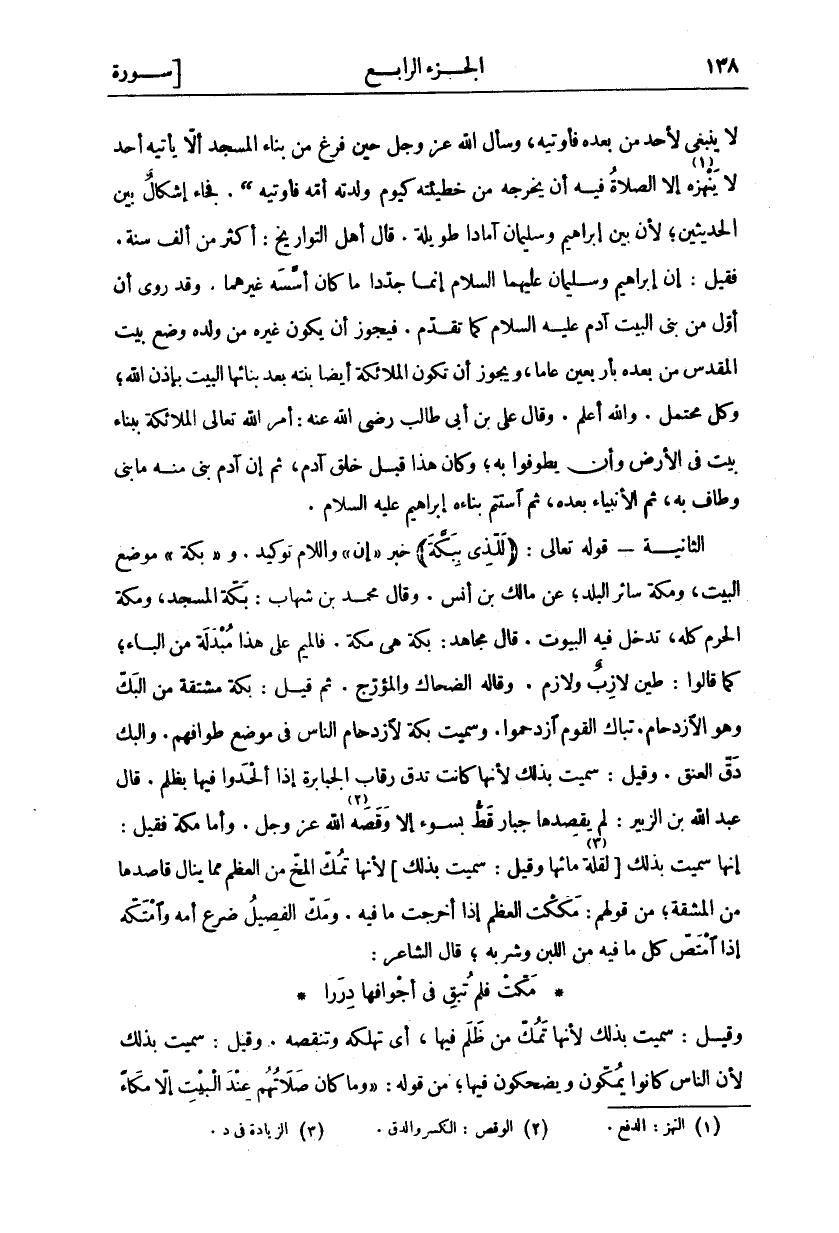 لَا يَنْبَغِي لِأَحَدٍ مِنْ بَعْدِهِ فَأُوتِيَهُ، وَسَأَلَ اللَّهَ عَزَّ وَجَلَّ حِينَ فَرَغَ مِنْ بِنَاءِ الْمَسْجِدِ أَلَّا يَأْتِيَهُ أَحَدٌ لَا يَنْهَزُهُ «١» إِلَّا الصَّلَاةُ فِيهِ أَنْ يُخْرِجَهُ مِنْ خَطِيئَتِهِ كَيَوْمِ وَلَدَتْهُ أُمُّهُ فَأُوتِيَهُ (. فَجَاءَ إِشْكَالٌ بَيْنَ الْحَدِيثَيْنِ، لِأَنَّ بَيْنَ إِبْرَاهِيمَ وَسُلَيْمَانَ آمَادًا طَوِيلَةً. قَالَ أَهْلُ التَّوَارِيخِ: أَكْثَرُ مِنْ أَلْفِ سَنَةٍ. فَقِيلَ: إِنَّ إِبْرَاهِيمَ وَسُلَيْمَانَ عَلَيْهِمَا السَّلَامُ إِنَّمَا جَدَّدَا مَا كَانَ أَسَّسَهُ غَيْرُهُمَا. وَقَدْ رُوِيَ أَنَّ أَوَّلَ مَنْ بَنَى الْبَيْتَ آدَمُ عَلَيْهِ السَّلَامُ كَمَا تَقَدَّمَ. فَيَجُوزُ أَنْ يَكُونَ غَيْرُهُ مِنْ وَلَدِهِ وَضَعَ بَيْتَ الْمَقْدِسِ مِنْ بَعْدِهِ بِأَرْبَعِينَ عَامًا، وَيَجُوزُ أَنْ تَكُونَ الْمَلَائِكَةُ أَيْضًا بَنَتْهُ بَعْدَ بِنَائِهَا الْبَيْتَ بِإِذْنِ اللَّهِ، وَكُلٌّ مُحْتَمَلٌ. وَاللَّهُ أَعْلَمُ. وَقَالَ عَلِيُّ بْنُ أَبِي طَالِبٍ رَضِيَ اللَّهُ عَنْهُ: أَمَرَ اللَّهُ تَعَالَى الْمَلَائِكَةَ بِبِنَاءِ بَيْتٍ فِي الْأَرْضِ وَأَنْ يَطَّوَّفُوا بِهِ، وَكَانَ هَذَا قَبْلَ خَلْقِ آدَمَ، ثُمَّ إِنَّ آدَمَ بَنَى مِنْهُ مَا بَنَى وَطَافَ بِهِ، ثُمَّ الْأَنْبِيَاءُ بَعْدَهُ، ثُمَّ اسْتَتَمَّ بِنَاءَهُ إِبْرَاهِيمُ عَلَيْهِ السَّلَامُ. الثَّانِيَةُ- قَوْلُهُ تَعَالَى: (لَلَّذِي بِبَكَّةَ) خبر" إِنَّ" واللام توكيد. و" بِبَكَّةَ" مَوْضِعُ الْبَيْتِ، وَمَكَّةُ سَائِرُ الْبَلَدِ، عَنْ مَالِكِ بْنِ أَنَسٍ. وَقَالَ مُحَمَّدُ بْنُ شِهَابٍ: بَكَّةُ الْمَسْجِدُ، وَمَكَّةُ الْحَرَمُ كُلُّهُ، تَدْخُلُ فِيهِ الْبُيُوتُ. قَالَ مُجَاهِدٌ: بَكَّةُ هِيَ مَكَّةُ. فَالْمِيمُ عَلَى هَذَا مُبْدَلَةٌ مِنَ الْبَاءِ، كَمَا قَالُوا: طِينٌ لَازِبٌ وَلَازِمٌ. وَقَالَهُ الضَّحَّاكُ وَالْمُؤَرِّجُ. ثُمَّ قِيلَ: بَكَّةُ مُشْتَقَّةٌ مِنَ الْبَكِّ وَهُوَ الِازْدِحَامُ. تَبَاكَّ الْقَوْمُ ازْدَحَمُوا. وَسُمِّيَتْ بَكَّةَ لِازْدِحَامِ النَّاسِ فِي مَوْضِعِ طَوَافِهِمْ. وَالْبَكُّ دَقُّ الْعُنُقِ. وَقِيلَ: سُمِّيَتْ بِذَلِكَ لِأَنَّهَا كَانَتْ تَدُقُّ رِقَابَ الْجَبَابِرَةِ إِذَا أَلْحَدُوا فِيهَا بِظُلْمٍ. قَالَ عَبْدُ اللَّهِ بْنُ الزُّبَيْرِ: لَمْ يَقْصِدْهَا جَبَّارٌ قَطُّ بِسُوءٍ إِلَّا وَقَصَهُ «٢» اللَّهُ عَزَّ وَجَلَّ. وَأَمَّا مَكَّةُ فَقِيلَ: إِنَّهَا سُمِّيَتْ بِذَلِكَ [لِقِلَّةِ «٣» مَائِهَا وَقِيلَ: سُمِّيَتْ بِذَلِكَ] لِأَنَّهَا تَمُكُّ الْمُخَّ مِنَ الْعَظْمِ مِمَّا يَنَالُ قَاصِدُهَا مِنَ الْمَشَقَّةِ مِنْ قَوْلِهِمْ: مَكَكْتُ الْعَظْمَ إِذَا أَخْرَجْتُ مَا فِيهِ. وَمَكَّ الْفَصِيلُ ضَرْعَ أُمِّهِ وَامْتَكَّهُ إِذَا امْتَصَّ كُلَّ مَا فِيهِ مِنَ اللَّبَنِ وَشَرِبَهُ، قَالَ الشَّاعِرُ: