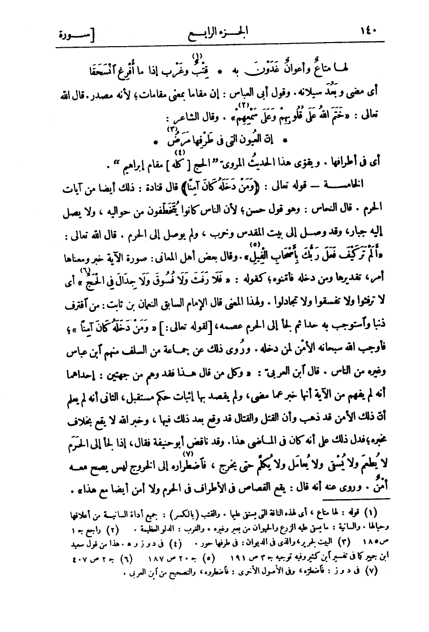 أَيْ فِي أَطْرَافِهَا. وَيُقَوِّي هَذَا الْحَدِيثُ الْمَرْوِيُّ (الْحَجُّ [كُلُّهُ] «٤» مَقَامُ إِبْرَاهِيمَ). الْخَامِسَةُ- قَوْلُهُ تَعَالَى: (وَمَنْ دَخَلَهُ كانَ آمِناً) قَالَ قَتَادَةُ: ذَلِكَ أَيْضًا مِنْ آيَاتِ الْحَرَمِ. قَالَ النَّحَّاسُ: وَهُوَ قَوْلٌ حَسَنٌ، لِأَنَّ النَّاسَ كَانُوا يُتَخَطَّفُونَ مِنْ حَوَالَيْهِ، وَلَا يَصِلُ إِلَيْهِ جَبَّارٌ، وَقَدْ وُصِلَ إِلَى بَيْتِ الْمَقْدِسِ وَخُرِّبَ، وَلَمْ يُوصَلْ إِلَى الْحَرَمِ. قَالَ اللَّهُ تَعَالَى:" أَلَمْ تَرَ كَيْفَ فَعَلَ رَبُّكَ بِأَصْحابِ الْفِيلِ" [الْفِيلِ: ١] «٥». وَقَالَ بَعْضُ أَهْلِ الْمَعَانِي: صُورَةُ الْآيَةِ خَبَرٌ وَمَعْنَاهَا أَمْرٌ، تَقْدِيرُهَا وَمَنْ دَخَلَهُ فَأَمِّنُوهُ، كَقَوْلِهِ:" فَلا رَفَثَ وَلا فُسُوقَ وَلا جِدالَ فِي الْحَجِّ" [البقرة: ١٩٧] «٦» أَيْ لَا تَرْفُثُوا وَلَا تَفْسُقُوا وَلَا تَجَادَلُوا. وَلِهَذَا الْمَعْنَى قَالَ الْإِمَامُ السَّابِقُ النُّعْمَانُ بْنُ ثَابِتٍ: مَنِ اقْتَرَفَ ذَنْبًا وَاسْتَوْجَبَ بِهِ حَدًّا ثُمَّ لَجَأَ إِلَى الْحَرَمِ عَصَمَهُ، [لِقَوْلِهِ تَعَالَى: [" وَمَنْ دَخَلَهُ كانَ آمِناً"، فَأَوْجَبَ اللَّهُ سُبْحَانَهُ الْأَمْنَ لِمَنْ دَخَلَهُ. وَرُوِيَ ذَلِكَ عَنْ جَمَاعَةٍ مِنَ السَّلَفِ مِنْهُمُ ابْنُ عَبَّاسٍ وَغَيْرُهُ مِنَ النَّاسِ. قَالَ ابْنُ الْعَرَبِيِّ:" وَكُلُّ مَنْ قَالَ هَذَا فَقَدْ وَهِمَ مِنْ جِهَتَيْنِ: إِحْدَاهُمَا أَنَّهُ لَمْ يَفْهَمْ مِنَ الْآيَةِ أَنَّهَا خَبَرٌ عَمَّا مَضَى، وَلَمْ يَقْصِدْ بِهَا إِثْبَاتَ حُكْمٍ مُسْتَقْبَلٍ، الثَّانِي أَنَّهُ لَمْ يَعْلَمْ أَنَّ ذَلِكَ الْأَمْنَ قَدْ ذَهَبَ وَأَنَّ الْقَتْلَ وَالْقِتَالَ قَدْ وَقَعَ بَعْدَ ذَلِكَ فِيهَا، وَخَبَرُ اللَّهِ لَا يَقَعُ بِخِلَافِ مَخْبَرِهِ، فَدَلَّ ذَلِكَ عَلَى أَنَّهُ كَانَ فِي الْمَاضِي هَذَا. وَقَدْ نَاقَضَ أَبُو حَنِيفَةَ فَقَالَ، إِذَا لَجَأَ إِلَى الْحَرَمِ لَا يُطْعَمُ وَلَا يُسْقَى وَلَا يُعَامَلُ وَلَا يُكَلَّمُ حَتَّى يَخْرُجَ، فَاضْطِرَارُهُ «٧» إِلَى الْخُرُوجِ لَيْسَ يَصِحُّ مَعَهُ أَمْنٌ. وَرُوِيَ عَنْهُ أَنَّهُ قَالَ: يَقَعُ الْقِصَاصُ فِي الْأَطْرَافِ فِي الْحَرَمِ وَلَا أَمْنَ أَيْضًا مع هذا".