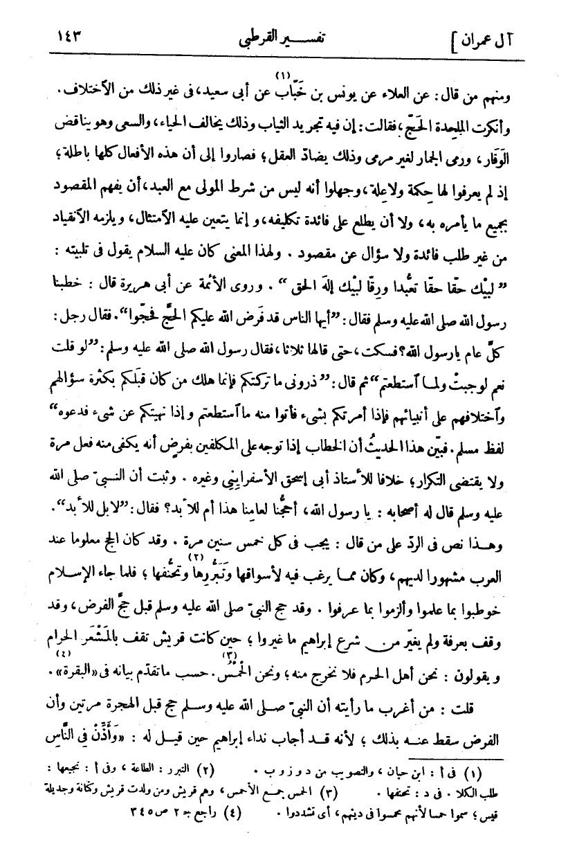 وَمِنْهُمْ مَنْ قَالَ: عَنِ الْعَلَاءِ عَنْ يُونُسَ بْنِ خَبَّابٍ «١» عَنْ أَبِي سَعِيدٍ، فِي غَيْرِ ذَلِكَ مِنَ الِاخْتِلَافِ. وَأَنْكَرَتِ الْمُلْحِدَةُ الْحَجَّ، فَقَالَتْ: إِنَّ فِيهِ تَجْرِيدَ الثِّيَابِ وَذَلِكَ يُخَالِفُ الْحَيَاءَ، وَالسَّعْيَ وَهُوَ يُنَاقِضُ الْوَقَارَ، وَرَمْيَ الْجِمَارِ لِغَيْرِ مَرْمًى وَذَلِكَ يُضَادُّ الْعَقْلَ، فَصَارُوا إِلَى أَنَّ هَذِهِ الْأَفْعَالَ كُلَّهَا بَاطِلَةٌ، إِذْ لَمْ يَعْرِفُوا لَهَا حِكْمَةً وَلَا عِلَّةَ، وَجَهِلُوا أَنَّهُ لَيْسَ مِنْ شَرْطِ الْمَوْلَى مَعَ الْعَبْدِ، أَنْ يَفْهَمَ الْمَقْصُودَ بِجَمِيعِ مَا يَأْمُرُهُ بِهِ، وَلَا أَنْ يَطَّلِعَ عَلَى فَائِدَةِ تَكْلِيفِهِ، وَإِنَّمَا يَتَعَيَّنُ عَلَيْهِ الِامْتِثَالُ، وَيَلْزَمُهُ الِانْقِيَادُ مِنْ غَيْرِ طَلَبِ فَائِدَةٍ وَلَا سُؤَالٍ عَنْ مَقْصُودٍ. وَلِهَذَا الْمَعْنَى كَانَ عَلَيْهِ السَّلَامُ يَقُولُ فِي تَلْبِيَتِهِ: (لَبَّيْكَ حَقًّا حَقًّا تَعَبُّدًا وَرِقًّا لَبَّيْكَ إِلَهَ الْحَقِّ). وَرَوَى الْأَئِمَّةُ عَنْ أَبِي هُرَيْرَةَ قَالَ: خَطَبَنَا رَسُولُ اللَّهِ صَلَّى اللَّهُ عَلَيْهِ وَسَلَّمَ فَقَالَ: (أَيُّهَا النَّاسُ قَدْ فَرَضَ اللَّهُ عَلَيْكُمُ الْحَجَّ فَحُجُّوا). فَقَالَ رَجُلٌ: كُلَّ عَامٍ يَا رَسُولَ اللَّهِ؟ فَسَكَتَ، حَتَّى قَالَهَا ثَلَاثًا، فَقَالَ رَسُولُ اللَّهِ صَلَّى اللَّهُ عَلَيْهِ وَسَلَّمَ: (لَوْ قُلْتُ نَعَمْ لَوَجَبَتْ وَلَمَا اسْتَطَعْتُمْ) ثُمَّ قَالَ: ذَرُونِي مَا تَرَكْتُكُمْ فَإِنَّمَا هَلَكَ مَنْ كَانَ قَبْلَكُمْ بِكَثْرَةِ سُؤَالِهِمْ وَاخْتِلَافِهِمْ عَلَى أَنْبِيَائِهِمْ فَإِذَا أَمَرْتُكُمْ بِشَيْءٍ فَأْتُوا مِنْهُ مَا اسْتَطَعْتُمْ وَإِذَا نَهَيْتُكُمْ عَنْ شي فَدَعُوهُ) لَفْظُ مُسْلِمٍ. فَبَيَّنَ هَذَا الْحَدِيثُ أَنَّ الْخِطَابَ إِذَا تَوَجَّهَ عَلَى الْمُكَلَّفِينَ بِفَرْضٍ أَنَّهُ يَكْفِي مِنْهُ فِعْلُ مَرَّةٍ وَلَا يَقْتَضِي التَّكْرَارَ، خلافا للأستاذ أبي إسحاق الْإِسْفَرَايِينِيِّ وَغَيْرِهِ. وَثَبَتَ أَنَّ النَّبِيَّ صَلَّى اللَّهُ عَلَيْهِ وَسَلَّمَ قَالَ لَهُ أَصْحَابَهُ: يَا رَسُولَ اللَّهِ، أَحَجُّنَا لِعَامِنَا هَذَا أَمْ لِلْأَبَدِ؟ فَقَالَ: (لَا بَلْ لِلْأَبَدِ). وَهَذَا نَصٌّ فِي الرَّدِّ عَلَى مَنْ قَالَ: يَجِبُ فِي كُلِّ خَمْسِ سِنِينَ مَرَّةً. وَقَدْ كَانَ الْحَجُّ مَعْلُومًا عِنْدَ الْعَرَبِ مَشْهُورًا لَدَيْهِمْ، وَكَانَ مِمَّا يُرْغَبُ فِيهِ لِأَسْوَاقِهَا وَتَبَرُّرِهَا «٢» وَتَحَنُّفِهَا، فَلَمَّا جَاءَ الْإِسْلَامُ خُوطِبُوا بِمَا عَلِمُوا وَأُلْزِمُوا بِمَا عَرَفُوا. وَقَدْ حَجَّ النَّبِيُّ صَلَّى اللَّهُ عَلَيْهِ وَسَلَّمَ قَبْلَ حَجِّ الْفَرْضِ، وَقَدْ وَقَفَ بِعَرَفَةَ وَلَمْ يُغَيِّرْ مِنْ شَرْعِ إِبْرَاهِيمَ مَا غَيَّرُوا، حِينَ كَانَتْ قُرَيْشٌ تَقِفُ بِالْمَشْعَرِ الْحَرَامِ وَيَقُولُونَ: نَحْنُ أَهْلُ الْحَرَمِ فَلَا نَخْرُجُ مِنْهُ، وَنَحْنُ الْحَمْسُ «٣». حَسْبَ مَا تَقَدَّمَ بَيَانُهُ فِي" الْبَقَرَةِ" «٤». قُلْتُ: مِنْ أَغْرَبِ مَا رَأَيْتُهُ أَنَّ النَّبِيَّ صَلَّى اللَّهُ عَلَيْهِ وَسَلَّمَ حَجَّ قَبْلَ الْهِجْرَةِ مَرَّتَيْنِ وَأَنَّ الْفَرْضَ سَقَطَ عَنْهُ بِذَلِكَ، لِأَنَّهُ قَدْ أَجَابَ نِدَاءَ إِبْرَاهِيمَ حِينَ قِيلَ لَهُ:" وَأَذِّنْ فِي النَّاسِ بِالْحَجِّ"