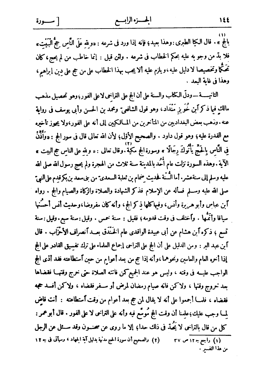 [الحج: ٢٧] «١». قَالَ الْكِيَا الطَّبَرِيُّ: وَهَذَا بَعِيدٌ، فَإِنَّهُ إِذَا وَرَدَ فِي شَرْعِهِ:" وَلِلَّهِ عَلَى النَّاسِ حِجُّ الْبَيْتِ" فَلَا بُدَّ مِنْ وُجُوبِهِ عَلَيْهِ بِحُكْمِ الخطاب في شرعه. ولين قِيلَ: إِنَّمَا خَاطَبَ مَنْ لَمْ يَحُجَّ، كَانَ تَحَكُّمًا وَتَخْصِيصًا لَا دَلِيلَ عَلَيْهِ، وَيَلْزَمُ عَلَيْهِ أَلَّا يَجِبَ بِهَذَا الْخِطَابِ عَلَى مَنْ حَجَّ عَلَى دِينِ إِبْرَاهِيمَ، وَهَذَا فِي غَايَةِ الْبُعْدِ. الثَّانِيَةُ- وَدَلَّ الْكِتَابُ وَالسُّنَّةُ عَلَى أَنَّ الْحَجَّ عَلَى التَّرَاخِي لَا عَلَى الْفَوْرِ، وَهُوَ تَحْصِيلُ مَذْهَبِ مَالِكٍ فِيمَا ذَكَرَ ابْنُ خُوَيْزِ مَنْدَادُ، وَهُوَ قَوْلُ الشَّافِعِيِّ وَمُحَمَّدِ بْنِ الْحَسَنِ وَأَبِي يُوسُفَ فِي رِوَايَةٍ عَنْهُ. وَذَهَبَ بَعْضُ الْبَغْدَادِيِّينَ مِنَ الْمُتَأَخِّرِينَ مِنَ الْمَالِكِيِّينَ إِلَى أَنَّهُ عَلَى الْفَوْرِ، وَلَا يَجُوزُ تَأْخِيرُهُ مَعَ الْقُدْرَةِ عَلَيْهِ، وَهُوَ قَوْلُ دَاوُدَ. وَالصَّحِيحُ الْأَوَّلُ، لِأَنَّ اللَّهَ تَعَالَى قَالَ فِي سُورَةِ الْحَجِّ:" وَأَذِّنْ فِي النَّاسِ بِالْحَجِّ يَأْتُوكَ رِجالًا" [الحج: ٢٧] وَسُورَةُ الْحَجِّ مَكِّيَّةٌ «٢». وَقَالَ تَعَالَى:" وَلِلَّهِ عَلَى النَّاسِ حِجُّ الْبَيْتِ" الْآيَةَ. وَهَذِهِ السُّورَةُ نَزَلَتْ عَامَ أُحُدٍ بِالْمَدِينَةِ سَنَةَ ثَلَاثٍ مِنَ الْهِجْرَةِ وَلَمْ يَحُجَّ رَسُولُ اللَّهِ صَلَّى اللَّهُ عَلَيْهِ وَسَلَّمَ إِلَى سَنَةِ عَشْرٍ. أَمَّا السُّنَّةُ فَحَدِيثُ ضِمَامِ بْنِ ثَعْلَبَةَ السَّعْدِيِّ مِنْ بَنِي سَعْدِ بْنِ بَكْرٍ قَدِمَ عَلَى النَّبِيِّ صَلَّى اللَّهُ عَلَيْهِ وَسَلَّمَ فَسَأَلَهُ عَنِ الْإِسْلَامِ فَذَكَرَ الشَّهَادَةَ وَالصَّلَاةَ وَالزَّكَاةَ وَالصِّيَامَ وَالْحَجَّ. رَوَاهُ ابْنُ عَبَّاسٍ وَأَبُو هُرَيْرَةَ وَأَنَسٌ، وَفِيهَا كُلِّهَا ذِكْرُ الْحَجِّ، وَأَنَّهُ كَانَ مَفْرُوضًا، وَحَدِيثُ أَنَسٍ أَحْسَنُهَا سِيَاقًا وَأَتَمُّهَا. وَاخْتُلِفَ فِي وَقْتِ قُدُومِهِ، فَقِيلَ: سَنَةَ خَمْسٍ. وَقِيلَ: سَنَةَ سَبْعٍ. وَقِيلَ: سَنَةَ تِسْعٍ، ذَكَرَهُ ابْنُ هِشَامٍ عَنْ أَبِي عُبَيْدَةَ الْوَاقِدِيِّ عَامَ الْخَنْدَقِ بَعْدَ انْصِرَافِ الْأَحْزَابِ. قَالَ ابْنُ عَبْدِ الْبَرِّ: وَمِنَ الدَّلِيلِ عَلَى أَنَّ الْحَجَّ عَلَى التَّرَاخِي إِجْمَاعُ الْعُلَمَاءِ عَلَى تَرْكِ تَفْسِيقِ الْقَادِرِ عَلَى الْحَجِّ إِذَا أَخَّرَهُ الْعَامَ وَالْعَامَيْنِ وَنَحْوَهُمَا، وَأَنَّهُ إِذَا حَجَّ مِنْ بَعْدِ أَعْوَامٍ مِنْ حِينِ اسْتِطَاعَتِهِ فَقَدْ أَدَّى الْحَجَّ الْوَاجِبَ عَلَيْهِ فِي وَقْتِهِ، وَلَيْسَ هُوَ عِنْدَ الْجَمِيعِ كَمَنْ فَاتَتْهُ الصَّلَاةُ حَتَّى خَرَجَ وَقْتُهَا فَقَضَاهَا بَعْدَ خُرُوجِ وَقْتِهَا، وَلَا كَمَنْ فَاتَهُ صِيَامُ رَمَضَانَ لِمَرَضٍ أَوْ سَفَرٍ فَقَضَاهُ. وَلَا كَمَنْ أَفْسَدَ حَجَّهُ فَقَضَاهُ، فَلَمَّا أَجْمَعُوا عَلَى أَنَّهُ لَا يُقَالُ لِمَنْ حَجَّ بَعْدَ أَعْوَامٍ مِنْ وَقْتٍ اسْتَطَاعَتِهِ: أَنْتَ قَاضٍ لِمَا وَجَبَ عَلَيْكَ، عَلِمْنَا أَنَّ وَقْتَ الْحَجِّ مُوَسَّعٌ فِيهِ وَأَنَّهُ عَلَى التَّرَاخِي لَا عَلَى الْفَوْرِ. قَالَ أَبُو عُمَرَ: كُلُّ مَنْ قَالَ بِالتَّرَاخِي لَا يَحُدُّ فِي ذَلِكَ حَدًّا، إِلَّا مَا رُوِيَ عَنْ سحنون وقد سئل عن الرجل