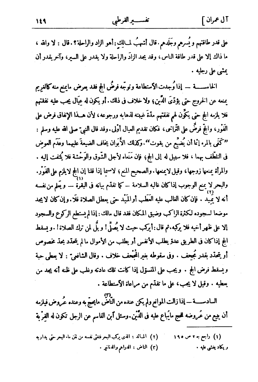 عَلَى قَدْرِ طَاقَتِهِمْ وَيُسْرِهِمْ وَجَلَدِهِمْ. قَالَ أَشْهَبُ لِمَالِكٍ: أَهُوَ الزَّادُ وَالرَّاحِلَةُ؟. قَالَ: لَا وَاللَّهِ، مَا ذَاكَ إِلَّا عَلَى قَدْرِ طَاقَةِ النَّاسِ، وَقَدْ يَجِدُ الزَّادَ وَالرَّاحِلَةَ وَلَا يَقْدِرُ عَلَى السَّيْرِ، وَآخَرُ يَقْدِرُ أَنْ يَمْشِيَ عَلَى رِجْلَيْهِ. إذا وجدت الاستطاعة وتوجه فرض الحج يَعْرِضُ مَا يَمْنَعُ مِنْهُ كَالْغَرِيمِ يَمْنَعُهُ عَنِ الْخُرُوجِ حَتَّى يُؤَدِّيَ الدَّيْنَ، وَلَا خِلَافَ فِي ذَلِكَ. أَوْ يَكُونُ لَهُ عِيَالٌ يَجِبُ عَلَيْهِ نَفَقَتُهُمْ فَلَا يَلْزَمُهُ الْحَجُّ حَتَّى يَكُونَ لَهُمْ نَفَقَتَهُمْ مُدَّةَ غَيْبَتِهِ لِذَهَابِهِ وَرُجُوعِهِ، لِأَنَّ هَذَا الْإِنْفَاقَ فَرْضٌ عَلَى الْفَوْرِ، وَالْحَجَّ فَرْضٌ عَلَى التَّرَاخِي، فَكَانَ تَقْدِيمُ الْعِيَالِ أَوْلَى. وَقَدْ قَالَ النَّبِيُّ صَلَّى اللَّهُ عَلَيْهِ وَسَلَّمَ: (كَفَى بِالْمَرْءِ إِثْمًا أَنْ يُضَيِّعَ مَنْ يَقُوتُ). وَكَذَلِكَ الْأَبَوَانِ يُخَافُ الضَّيْعَةُ عَلَيْهِمَا وَعَدَمُ الْعِوَضِ فِي التَّلَطُّفِ بِهِمَا، فَلَا سَبِيلَ لَهُ إِلَى الْحَجِّ، فَإِنْ مَنَعَاهُ لِأَجْلِ الشَّوْقِ وَالْوَحْشَةِ فَلَا يَلْتَفِتُ إِلَيْهِ. وَالْمَرْأَةُ يَمْنَعُهَا زَوْجُهَا، وَقِيلَ لَا يَمْنَعُهَا. وَالصَّحِيحُ الْمَنْعُ، لَا سِيَّمَا إِذَا قُلْنَا إِنَّ الْحَجَّ لا يلزم عَلَى الْفَوْرِ. وَالْبَحْرُ لَا يَمْنَعُ الْوُجُوبَ إِذَا كَانَ غَالِبُهُ السَّلَامَةَ- كَمَا تَقَدَّمَ بَيَانُهُ فِي الْبَقَرَةِ «١» - وَيَعْلَمُ مِنْ نَفْسِهِ أَنَّهُ لَا يَمِيدُ «٢». فَإِنْ كَانَ الْغَالِبُ عَلَيْهِ الْعَطَبَ أَوِ الْمَيْدَ حَتَّى يُعَطِّلَ الصَّلَاةَ فَلَا. وَإِنْ كَانَ لَا يَجِدُ مَوْضِعًا لِسُجُودِهِ لِكَثْرَةِ الرَّاكِبِ وَضِيقِ الْمَكَانِ فَقَدْ قَالَ مَالِكٌ: إِذَا لَمْ يَسْتَطِعِ الرُّكُوعَ وَالسُّجُودَ إِلَّا عَلَى ظَهْرِ أَخِيهِ فَلَا يَرْكَبْهُ. ثُمَّ قَالَ: أَيَرْكَبُ حَيْثُ لَا يُصَلِّي! وَيْلٌ لِمَنْ تَرَكَ الصَّلَاةَ! وَيَسْقُطُ الْحَجُّ إِذَا كَانَ فِي الطَّرِيقِ عَدُوٌّ يَطْلُبُ الْأَنْفُسَ أَوْ يَطْلُبُ مِنَ الْأَمْوَالِ مَا لَمْ يَتَحَدَّدْ بِحَدٍّ مَخْصُوصٍ أَوْ يَتَحَدَّدْ بِقَدْرٍ مُجْحِفٍ. وَفِي سُقُوطِهِ بِغَيْرِ الْمُجْحِفِ خِلَافٌ. وَقَالَ الشَّافِعِيُّ: لَا يُعْطَى حَبَّةً وَيَسْقُطُ فَرْضُ الْحَجِّ. وَيَجِبُ عَلَى الْمُتَسَوِّلِ إِذَا كَانَتْ تِلْكَ عَادَتَهُ وَغَلَبَ عَلَى ظَنِّهِ أَنَّهُ يَجِدُ مَنْ يُعْطِيهِ. وَقِيلَ لَا يَجِبُ، عَلَى ما تقدم من مراعاة الاستطاعة. إِذَا زَالَتِ الْمَوَانِعُ وَلَمْ يَكُنْ عِنْدَهُ مِنَ النَّاضِّ «٣» مَا يَحُجُّ بِهِ وَعِنْدَهُ عُرُوضٌ فَيَلْزَمُهُ أَنْ يَبِيعَ مِنْ عُرُوضِهِ لِلْحَجِّ مَا يُبَاعُ عليه في الدين. وسيل ابْنُ الْقَاسِمِ عَنِ الرَّجُلِ تَكُونُ لَهُ الْقِرْبَةُ