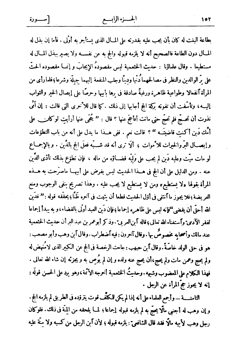 بِطَاعَةِ الْبِنْتِ لَهُ كَانَ بِأَنْ يَجِبَ عَلَيْهِ بِقُدْرَتِهِ عَلَى الْمَالِ الَّذِي يَسْتَأْجِرُ بِهِ أَوْلَى. فَأَمَّا إِنْ بَذَلَ لَهُ الْمَالَ دُونَ الطَّاعَةِ فَالصَّحِيحُ أَنَّهُ لَا يَلْزَمُهُ قَبُولُهُ وَالْحَجُّ بِهِ عَنْ نَفْسِهِ وَلَا يَصِيرُ بِبَذْلِ الْمَالِ لَهُ مُسْتَطِيعًا. وَقَالَ عُلَمَاؤُنَا: حَدِيثُ الْخَثْعَمِيَّةِ لَيْسَ مَقْصُودُهُ الْإِيجَابَ وَإِنَّمَا مَقْصُودُهُ الْحَثُّ عَلَى بِرِّ الْوَالِدَيْنِ وَالنَّظَرُ فِي مَصَالِحِهِمَا دُنْيَا؟ وَدِينًا وَجَلْبُ الْمَنْفَعَةِ إِلَيْهِمَا جِبِلَّةً وَشَرْعًا، فَلَمَّا رَأَى مِنَ الْمَرْأَةِ انْفِعَالًا وَطَوَاعِيَةً ظَاهِرَةً وَرَغْبَةً صَادِقَةً فِي بِرِّهَا بِأَبِيهَا وَحِرْصًا عَلَى إِيصَالِ الْخَيْرِ وَالثَّوَابِ إِلَيْهِ، وَتَأَسَّفَتْ أَنْ تَفُوتَهُ بَرَكَةُ الْحَجِّ أَجَابَهَا إِلَى ذَلِكَ. كَمَا قَالَ لِلْأُخْرَى الَّتِي قَالَتْ: إِنَّ أُمِّي نَذَرَتْ أَنْ تَحُجَّ فَلَمْ تَحُجَّ حَتَّى مَاتَتْ أَفَأَحُجُّ عَنْهَا؟ قَالَ: (حُجِّي عَنْهَا أَرَأَيْتِ لَوْ كَانَ عَلَى أُمِّكِ دَيْنٌ أَكُنْتِ قَاضِيَتَهُ)؟ قَالَتْ: نَعَمْ. فَفِي هَذَا مَا يَدُلُّ عَلَى أَنَّهُ مِنْ بَابِ التَّطَوُّعَاتِ وَإِيصَالِ الْبِرِّ وَالْخَيْرَاتِ لِلْأَمْوَاتِ، أَلَا تَرَى أَنَّهُ قَدْ شَبَّهَ فِعْلَ الْحَجِّ بِالدَّيْنِ. وَبِالْإِجْمَاعِ لَوْ مَاتَ مَيِّتٌ وَعَلَيْهِ دَيْنٌ لَمْ يَجِبْ عَلَى وَلِيِّهِ قَضَاؤُهُ مِنْ مَالِهِ، فَإِنْ تَطَوَّعَ بِذَلِكَ تَأَدَّى الدَّيْنُ عَنْهُ. وَمِنَ الدَّلِيلِ عَلَى أَنَّ الْحَجَّ فِي هَذَا الْحَدِيثِ لَيْسَ بِفَرْضٍ عَلَى أَبِيهَا مَا صَرَّحَتْ بِهِ هَذِهِ الْمَرْأَةُ بِقَوْلِهَا" لَا يَسْتَطِيعُ" وَمَنْ لَا يَسْتَطِيعُ لَا يَجِبُ عَلَيْهِ. وَهَذَا تَصْرِيحٌ بِنَفْيِ الْوُجُوبِ وَمَنْعِ الْفَرِيضَةِ، فَلَا يَجُوزُ مَا انْتَفَى فِي أَوَّلِ الْحَدِيثِ قَطْعًا أَنْ يَثْبُتَ فِي آخِرِهِ ظَنًّا، يُحَقِّقُهُ قَوْلُهُ: (فَدَيْنُ اللَّهِ أَحَقُّ أَنْ يُقْضَى) فَإِنَّهُ لَيْسَ عَلَى ظَاهِرِهِ إِجْمَاعًا، فَإِنَّ دَيْنَ الْعَبْدِ أَوْلَى بِالْقَضَاءِ، وَبِهِ يُبْدَأُ إِجْمَاعًا لِفَقْرِ الْآدَمِيِّ وَاسْتِغْنَاءِ اللَّهِ تَعَالَى، قَالَهُ ابْنُ الْعَرَبِيِّ. وَذَكَرَ أَبُو عُمَرَ بْنُ عَبْدِ الْبَرِّ أَنَّ حَدِيثَ الْخَثْعَمِيَّةِ عِنْدَ مَالِكٍ وَأَصْحَابِهِ مَخْصُوصٌ بِهَا. وَقَالَ آخَرُونَ: فِيهِ اضْطِرَابٌ. وَقَالَ ابْنُ وَهْبٍ وَأَبُو مُصْعَبٍ: هُوَ فِي حَقِّ الْوَلَدِ خَاصَّةً. وَقَالَ ابْنُ حَبِيبٍ: جَاءَتِ الرُّخْصَةُ فِي الْحَجِّ عَنِ الْكَبِيرِ الَّذِي لَا مَنْهَضَ لَهُ وَلَمْ يَحُجَّ وَعَمَّنْ مَاتَ وَلَمْ يَحُجَّ، أَنْ يَحُجَّ عَنْهُ وَلَدُهُ وَإِنْ لَمْ يُوصِ بِهِ وَيُجْزِئُهُ إِنْ شَاءَ اللَّهُ تَعَالَى. فَهَذَا الْكَلَامُ عَلَى الْمَعْضُوبِ وَشَبَهِهِ. وَحَدِيثُ الْخَثْعَمِيَّةِ أَخْرَجَهُ الْأَئِمَّةُ، وَهُوَ يَرُدُّ عَلَى الْحَسَنِ قَوْلَهُ: إِنَّهُ لَا يَجُوزُ حَجُّ الْمَرْأَةِ عَنِ الرَّجُلِ. الثَّامِنَةُ وَأَجْمَعَ الْعُلَمَاءُ عَلَى أَنَّهُ إِذَا لَمْ يَكُنْ لِلْمُكَلَّفِ قُوتٌ يَتَزَوَّدُهُ فِي الطَّرِيقِ لَمْ يَلْزَمْهُ الْحَجُّ. وَإِنْ وَهَبَ لَهُ أَجْنَبِيٌّ مَالًا يَحُجُّ بِهِ لَمْ يَلْزَمْهُ قَبُولُهُ إِجْمَاعًا، لِمَا يَلْحَقُهُ مِنَ الْمِنَّةِ فِي ذَلِكَ. فَلَوْ كَانَ رَجُلٌ وَهَبَ لِأَبِيهِ مَالًا فَقَدْ قَالَ الشَّافِعِيُّ: يَلْزَمُهُ قَبُولُهُ، لِأَنَّ ابْنَ الرَّجُلِ مِنْ كَسْبِهِ وَلَا مِنَّةَ عَلَيْهِ