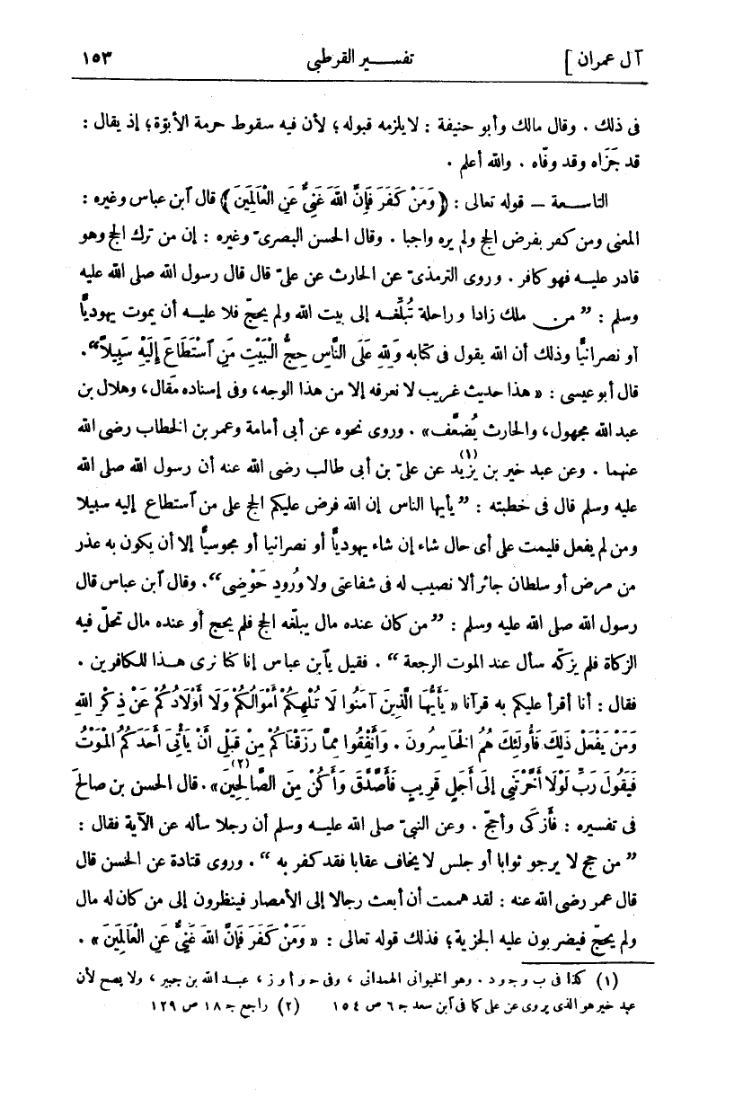فِي ذَلِكَ. وَقَالَ مَالِكٌ وَأَبُو حَنِيفَةَ: لَا يَلْزَمُهُ قَبُولُهُ، لِأَنَّ فِيهِ سُقُوطُ حُرْمَةِ الْأُبُوَّةِ، إِذْ يُقَالُ: قَدْ جَزَاهُ وَقَدْ وَفَّاهُ. وَاللَّهُ أَعْلَمُ. التَّاسِعَةُ- قَوْلُهُ تَعَالَى: (وَمَنْ كَفَرَ فَإِنَّ اللَّهَ غَنِيٌّ عَنِ الْعالَمِينَ) قَالَ ابْنُ عَبَّاسٍ وَغَيْرُهُ: الْمَعْنَى وَمَنْ كَفَرَ بِفَرْضِ الْحَجِّ وَلَمْ يَرَهُ وَاجِبًا. وَقَالَ الْحَسَنُ الْبَصْرِيُّ وَغَيْرُهُ: إِنَّ مَنْ تَرَكَ الْحَجَّ وَهُوَ قَادِرٌ عَلَيْهِ فَهُوَ كَافِرٌ. وَرَوَى التِّرْمِذِيُّ عَنِ الْحَارِثِ عَنْ عَلِيٍّ قَالَ: قَالَ رَسُولُ اللَّهِ صَلَّى اللَّهُ عَلَيْهِ وَسَلَّمَ: (مَنْ مَلَكَ زَادًا وَرَاحِلَةً تُبَلِّغُهُ إِلَى بَيْتِ اللَّهِ وَلَمْ يَحُجَّ فَلَا عَلَيْهِ أَنْ يَمُوتَ يَهُودِيًّا أَوْ نَصْرَانِيًّا وَذَلِكَ أَنَّ اللَّهَ يَقُولُ فِي كِتَابِهِ وَلِلَّهِ عَلَى النَّاسِ حِجُّ الْبَيْتِ مَنِ اسْتَطَاعَ إِلَيْهِ سَبِيلًا (. قَالَ أَبُو عِيسَى:) هَذَا حَدِيثٌ غَرِيبٌ لَا نَعْرِفُهُ إِلَّا مِنْ هَذَا الْوَجْهِ، وَفِي إِسْنَادِهِ مَقَالٌ، وَهِلَالُ بْنُ عَبْدِ اللَّهِ مَجْهُولٌ، وَالْحَارِثُ يُضَعَّفُ (. وَرُوِيَ نَحْوَهُ عَنْ أَبِي أُمَامَةَ وَعُمَرَ بْنِ الْخَطَّابِ رَضِيَ اللَّهُ عَنْهُمَا. وَعَنْ عَبْدِ خَيْرِ بْنِ يَزِيدَ «١» عَنْ عَلِيِّ بْنِ أَبِي طَالِبٍ رَضِيَ اللَّهُ عَنْهُ أَنَّ رَسُولَ اللَّهِ صَلَّى اللَّهُ عَلَيْهِ وَسَلَّمَ قَالَ فِي خُطْبَتِهِ:) يَا أَيُّهَا النَّاسُ إِنَّ اللَّهَ فَرَضَ عَلَيْكُمُ الْحَجَّ عَلَى مَنِ اسْتَطَاعَ إِلَيْهِ سَبِيلًا وَمَنْ لَمْ يَفْعَلْ فَلْيَمُتْ عَلَى أَيِّ حَالٍ شَاءَ إِنْ شَاءَ يَهُودِيًّا أَوْ نَصْرَانِيًّا أَوْ مَجُوسِيًّا إِلَّا أَنْ يَكُونَ بِهِ عُذْرٌ مِنْ مَرَضٍ أَوْ سُلْطَانٍ جَائِرٍ أَلَّا نَصِيبَ لَهُ فِي شَفَاعَتِي وَلَا وُرُودِ حَوْضِي (. وَقَالَ ابْنُ عَبَّاسٍ قَالَ رَسُولُ اللَّهِ صَلَّى اللَّهُ عَلَيْهِ وَسَلَّمَ:) مَنْ كَانَ عِنْدَهُ مَالٌ يُبَلِّغُهُ الْحَجَّ فَلَمْ يَحُجَّ أَوْ عِنْدَهُ مَالٌ تَحِلُّ فِيهِ الزَّكَاةُ فَلَمْ يُزَكِّهِ سَأَلَ عِنْدَ الْمَوْتِ الرَّجْعَةَ (. فَقِيلَ يَا ابْنَ عَبَّاسٍ إِنَّا كُنَّا نَرَى هَذَا لِلْكَافِرِينَ. فَقَالَ: أَنَا أَقْرَأُ عَلَيْكُمْ بِهِ قُرْآنًا:" يَا أَيُّهَا الَّذِينَ آمَنُوا لَا تُلْهِكُمْ أَمْوالُكُمْ وَلا أَوْلادُكُمْ عَنْ ذِكْرِ اللَّهِ وَمَنْ يَفْعَلْ ذلِكَ فَأُولئِكَ هُمُ الْخاسِرُونَ. وَأَنْفِقُوا مِنْ مَا رَزَقْناكُمْ مِنْ قَبْلِ أَنْ يَأْتِيَ أَحَدَكُمُ الْمَوْتُ فَيَقُولَ رَبِّ لَوْلا أَخَّرْتَنِي إِلى أَجَلٍ قَرِيبٍ فَأَصَّدَّقَ وَأَكُنْ مِنَ الصَّالِحِينَ" [المنافقون