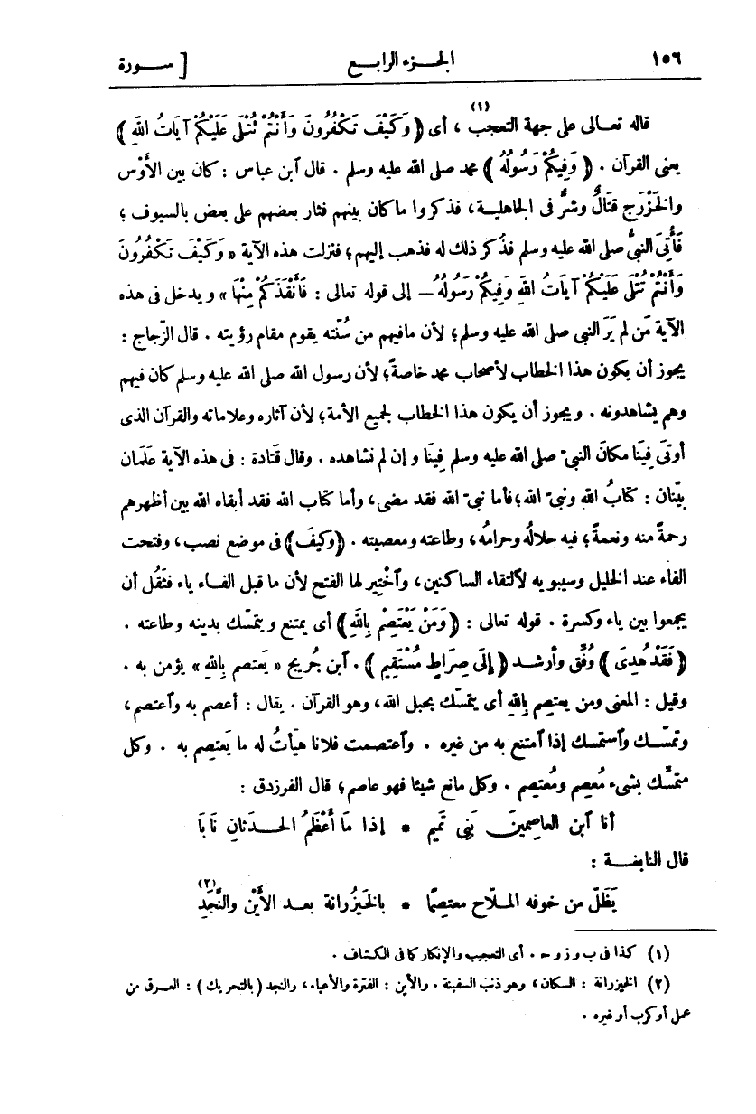 قَالَهُ تَعَالَى عَلَى جِهَةِ التَّعَجُّبِ «١»، أَيْ (وَكَيْفَ تَكْفُرُونَ وَأَنْتُمْ تُتْلى عَلَيْكُمْ آياتُ اللَّهِ) يَعْنِي الْقُرْآنَ. (وَفِيكُمْ رَسُولُهُ) مُحَمَّدٍ صَلَّى اللَّهُ عَلَيْهِ وَسَلَّمَ. قَالَ ابْنُ عَبَّاسٍ: كَانَ بَيْنَ الْأَوْسِ وَالْخَزْرَجِ قِتَالٌ وَشَرٌّ فِي الْجَاهِلِيَّةِ، فَذَكَرُوا مَا كَانَ بَيْنَهُمْ فَثَارَ بَعْضُهُمْ عَلَى بَعْضٍ بِالسُّيُوفِ، فَأَتَى النَّبِيُّ صَلَّى اللَّهُ عَلَيْهِ وَسَلَّمَ فَذَكَرَ ذَلِكَ لَهُ فَذَهَبَ إِلَيْهِمْ، فَنَزَلَتْ هَذِهِ الْآيَةُ" وَكَيْفَ تَكْفُرُونَ وَأَنْتُمْ تُتْلى عَلَيْكُمْ آياتُ اللَّهِ وَفِيكُمْ رَسُولُهُ- إِلَى قَوْلِهِ تَعَالَى: فَأَنْقَذَكُمْ مِنْها" وَيَدْخُلُ فِي هَذِهِ الْآيَةِ مَنْ لَمْ يَرَ النَّبِيَّ صَلَّى اللَّهُ عَلَيْهِ وَسَلَّمَ، لِأَنَّ مَا فِيهِمْ مِنْ سُنَّتِهِ يَقُومُ مَقَامَ رُؤْيَتِهِ. قَالَ الزَّجَّاجُ: يَجُوزُ أَنْ يَكُونَ هَذَا الْخِطَابُ لِأَصْحَابِ مُحَمَّدٍ خَاصَّةً، لِأَنَّ رَسُولَ اللَّهِ صَلَّى اللَّهُ عَلَيْهِ وَسَلَّمَ كَانَ فِيهِمْ وَهُمْ يُشَاهِدُونَهُ. وَيَجُوزُ أَنْ يَكُونَ هَذَا الْخِطَابُ لِجَمِيعِ الْأُمَّةِ، لِأَنَّ آثَارَهُ وَعَلَامَاتِهِ وَالْقُرْآنَ الَّذِي أُوتِيَ فِينَا مَكَانَ النَّبِيِّ صَلَّى اللَّهُ عَلَيْهِ وَسَلَّمَ فِينَا وَإِنْ لَمْ نُشَاهِدْهُ. وَقَالَ قَتَادَةُ: فِي هَذِهِ الْآيَةِ علمان ببنان؟: كِتَابُ اللَّهِ وَنَبِيُّ اللَّهِ، فَأَمَّا نَبِيُّ اللَّهِ فَقَدْ مَضَى، وَأَمَّا كِتَابُ اللَّهِ فَقَدْ أَبْقَاهُ بَيْنَ أَظْهُرِهِمْ رَحْمَةً مِنْهُ وَنِعْمَةً، فِيهِ حَلَالُهُ وَحَرَامُهُ، وَطَاعَتُهُ وَمَعْصِيَتُهُ. (وَكَيْفَ) فِي مَوْضِعِ نَصْبٍ، وَفُتِحَتِ الْفَاءُ عِنْدَ الْخَلِيلِ وَسِيبَوَيْهِ لِالْتِقَاءِ السَّاكِنَيْنِ، وَاخْتِيرَ لَهَا الْفَتْحُ لِأَنَّ مَا قَبْلَ الْفَاءِ يَاءٌ فَثَقُلَ أَنْ يَجْمَعُوا بَيْنَ يَاءٍ وَكَسْرَةٍ. قَوْلُهُ تَعَالَى: (وَمَنْ يَعْتَصِمْ بِاللَّهِ) أَيْ يَمْتَنِعُ وَيَتَمَسَّكُ بِدِينِهِ وَطَاعَتِهِ. (فَقَدْ هُدِيَ) وُفِّقَ وَأُرْشِدَ (إِلى صِراطٍ مُسْتَقِيمٍ). ابْنُ جُرَيْجٍ" يَعْتَصِمْ بِاللَّهِ" يُؤْمِنُ بِهِ. وَقِيلَ: الْمَعْنَى وَمَنْ يَعْتَصِمُ بِاللَّهِ أَيْ يَتَمَسَّكُ بِحَبْلِ اللَّهِ، وَهُوَ الْقُرْآنُ. يُقَالُ: أَعْصَمَ بِهِ وَاعْتَصَمَ، وَتَمَسَّكَ وَاسْتَمْسَكَ إِذَا امْتَنَعَ بِهِ مِنْ غَيْرِهِ. وَاعْتَصَمْتُ فُلَانًا هَيَّأْتُ لَهُ مَا يَعْتَصِمُ بِهِ. وَكُلُّ مُتَمَسِّكٍ بِشَيْءٍ مُعْصِمٌ وَمُعْتَصِمٌ. وَكُلُّ مَانِعٍ شَيْئًا فَهُوَ عَاصِمٌ، قَالَ الْفَرَزْدَقُ: