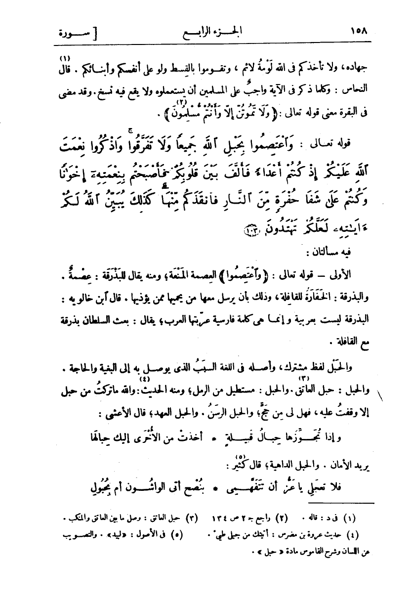 فِيهِ مَسْأَلَتَانِ: الْأُولَى- قَوْلُهُ تَعَالَى: (وَاعْتَصِمُوا) الْعِصْمَةُ الْمَنْعَةُ، وَمِنْهُ يقال للبدرقة: عِصْمَةٌ. وَالْبَذْرَقَةُ: الْخَفَارَةُ لِلْقَافِلَةِ، وَذَلِكَ بِأَنْ يُرْسِلَ مَعَهَا مَنْ يَحْمِيهَا مِمَّنْ يُؤْذِيهَا. قَالَ ابْنُ خالويه: البدرقة لَيْسَتْ بِعَرَبِيَّةٍ وَإِنَّمَا هِيَ كَلِمَةٌ فَارِسِيَّةٌ عَرَّبَتْهَا الْعَرَبُ، يُقَالُ: بَعَثَ السُّلْطَانُ بَذْرَقَةً مَعَ الْقَافِلَةِ. وَالْحَبْلُ لَفْظٌ مُشْتَرَكٌ، وَأَصْلُهُ فِي اللُّغَةِ السَّبَبُ الَّذِي يُوصَلُ بِهِ إِلَى الْبُغْيَةِ وَالْحَاجَةِ. وَالْحَبْلُ: حَبْلُ الْعَاتِقِ «٣». وَالْحَبْلُ: مُسْتَطِيلٌ مِنَ الرَّمْلِ، وَمِنْهُ الْحَدِيثُ «٤»: وَاللَّهِ مَا تَرَكْتُ مِنْ حَبْلٍ إِلَّا وَقَفْتُ عَلَيْهِ، فَهَلْ لِي مِنْ حَجٍّ، وَالْحَبْلُ الرَّسَنِ. وَالْحَبْلُ الْعَهْدُ، قَالَ الْأَعْشَى: