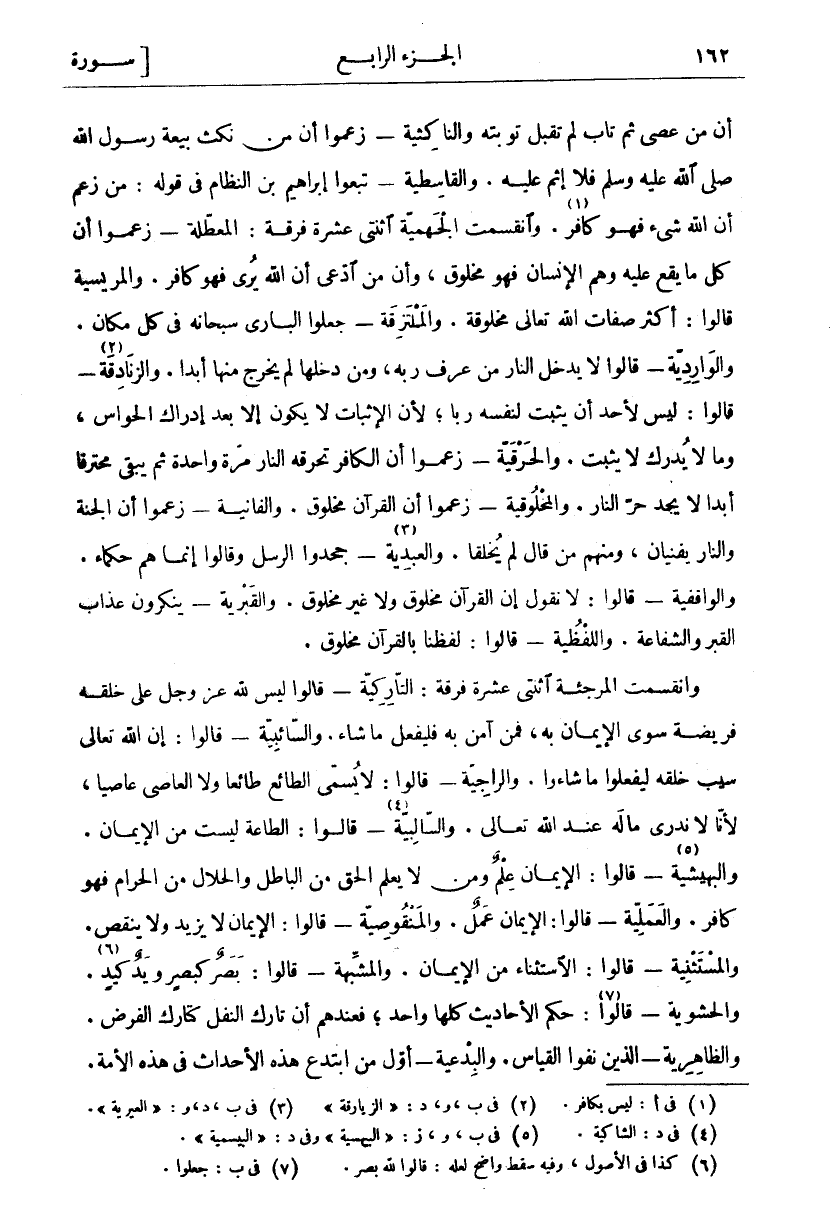 أَنَّ مَنْ عَصَى ثُمَّ تَابَ لَمْ تُقْبَلْ تَوْبَتُهُ وَالنَّاكِثِيَّةُ- زَعَمُوا أَنَّ مَنْ نَكَثَ بَيْعَةَ رَسُولِ اللَّهِ صَلَّى اللَّهُ عَلَيْهِ وَسَلَّمَ فَلَا إِثْمَ عَلَيْهِ وَالْقَاسِطِيَّةُ- تَبِعُوا إِبْرَاهِيمَ بْنَ النَّظَّامِ في قوله: من زعم أن الله شي فَهُوَ كَافِرٌ «١». وَانْقَسَمَتِ الْجَهْمِيَّةُ اثْنَتَيْ عَشْرَةَ فِرْقَةً: الْمُعَطِّلَةُ- زَعَمُوا أَنَّ كُلَّ مَا يَقَعُ عَلَيْهِ وَهْمُ الْإِنْسَانِ فَهُوَ مَخْلُوقٌ. وَإِنَّ مَنِ ادَّعَى أَنَّ اللَّهَ يُرَى فَهُوَ كَافِرٌ. وَالْمَرِيسِيَّةُ قَالُوا: أَكْثَرُ صِفَاتِ اللَّهِ تَعَالَى مَخْلُوقَةٌ. وَالْمُلْتَزِقَةُ- جَعَلُوا الْبَارِيَ سُبْحَانَهُ فِي كُلِّ مَكَانٍ. وَالْوَارِدِيَّةُ- قَالُوا لَا يَدْخُلُ النَّارَ مَنْ عَرَفَ رَبَّهُ، وَمَنْ دَخَلَهَا لَمْ يَخْرُجْ مِنْهَا أَبَدًا وَالزَّنَادِقَةُ «٢» - قَالُوا: لَيْسَ لِأَحَدٍ أَنْ يُثْبِتَ لِنَفْسِهِ رَبًّا، لِأَنَّ الْإِثْبَاتَ لَا يَكُونُ إِلَّا بَعْدَ إِدْرَاكِ الْحَوَاسِّ، وَمَا لَا يُدْرَكُ لَا يُثْبَتُ. وَالْحَرْقِيَّةُ- زَعَمُوا أَنَّ الْكَافِرَ تَحْرِقُهُ النَّارُ مَرَّةً وَاحِدَةً ثُمَّ يَبْقَى مُحْتَرِقًا أَبَدًا لَا يَجِدُ حَرَّ النَّارِ. وَالْمَخْلُوقِيَّةُ- زَعَمُوا أَنَّ الْقُرْآنَ مَخْلُوقٌ. وَالْفَانِيَةُ- زَعَمُوا أَنَّ الْجَنَّةَ وَالنَّارَ يَفْنَيَانِ، وَمِنْهُمْ مَنْ قَالَ لَمْ يُخْلَقَا. وَالْعَبْدِيَّةُ «٣» - جَحَدُوا الرُّسُلَ وَقَالُوا إِنَّمَا هُمْ حُكَمَاءُ. وَالْوَاقِفِيَّةُ- قَالُوا: لَا نَقُولُ إِنَّ الْقُرْآنَ مَخْلُوقٌ وَلَا غَيْرُ مَخْلُوقٍ. وَالْقَبْرِيَّةُ- يُنْكِرُونَ عَذَابَ الْقَبْرِ وَالشَّفَاعَةَ. وَاللَّفْظِيَّةُ- قَالُوا لَفْظُنَا بِالْقُرْآنِ مَخْلُوقٌ. وَانْقَسَمَتِ الْمُرْجِئَةُ اثْنَتَيْ عَشْرَةَ فِرْقَةً: التَّارِكِيَّةُ- قَالُوا لَيْسَ لِلَّهِ عَزَّ وَجَلَّ عَلَى خَلْقِهِ فَرِيضَةٌ سِوَى الْإِيمَانِ بِهِ، فَمَنْ آمَنَ بِهِ فَلْيَفْعَلْ مَا شَاءَ. وَالسَّائِبِيَّةُ- قَالُوا: إِنَّ اللَّهَ تعالى سيب خلقه ليفعلوا ما شاءوا. والراجئة- قَالُوا: لَا يُسَمَّى الطَّائِعُ طَائِعًا وَلَا الْعَاصِي عَاصِيًا، لِأَنَّا لَا نَدْرِي مَا لَهُ عِنْدَ اللَّهِ تَعَالَى. وَالسَّالِبِيَّةُ «٤» - قَالُوا: الطَّاعَةُ لَيْسَتْ مِنَ الْإِيمَانِ. وَالْبَهْيَشِيَّةُ «٥» - قَالُوا: الْإِيمَانُ عِلْمٌ وَمَنْ لَا يَعْلَمُ الْحَقَّ مِنَ الْبَاطِلِ وَالْحَلَالَ مِنَ الْحَرَامِ فَهُوَ كَافِرٌ. وَالْعَمَلِيَّةُ- قَالُوا: الْإِيمَانُ عَمَلٌ. وَالْمَنْقُوصِيَّةُ- قَالُوا: الْإِيمَانُ لَا يَزِيدُ وَلَا يَنْقُصُ. وَالْمُسْتَثْنِيَةُ- قَالُوا: الِاسْتِثْنَاءُ مِنَ الْإِيمَانِ. وَالْمُشَبِّهَةُ- قَالُوا: بَصَرٌ كبصر وئد كَيَدٍ «٦». وَالْحَشْوِيَّةُ- قَالُوا «٧»: حُكْمُ الْأَحَادِيثِ كُلِّهَا وَاحِدٌ، فَعِنْدَهُمْ أَنَّ تَارِكَ النَّفْلِ كَتَارِكِ الْفَرْضِ. وَالظَّاهِرِيَّةُ- الَّذِينَ نَفَوُا الْقِيَاسَ. وَالْبِدْعِيَّةُ- أَوَّلُ مَنِ ابْتَدَعَ هذه الأحداث في هذه الامة.