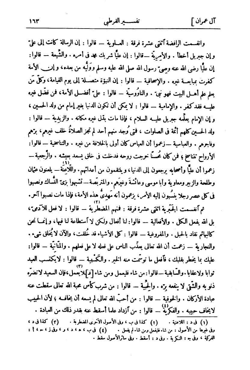 وَانْقَسَمَتِ الرَّافِضَةُ اثْنَتَيْ عَشْرَةَ فِرْقَةً: الْعَلَوِيَّةُ- قَالُوا: إِنَّ الرِّسَالَةَ كَانَتْ إِلَى عَلِيٍّ وَإِنَّ جِبْرِيلَ أَخْطَأَ. وَالْأَمْرِيَّةُ- قَالُوا: إِنَّ عَلِيًّا شَرِيكُ مُحَمَّدٍ فِي أَمْرِهِ. وَالشِّيعَةُ- قَالُوا: إِنَّ عَلِيًّا رَضِيَ اللَّهُ عَنْهُ وَصِيُّ رَسُولِ اللَّهِ صَلَّى اللَّهُ عَلَيْهِ وَسَلَّمَ وَوَلِيُّهُ مِنْ بَعْدِهِ، وَإِنَّ الْأُمَّةَ كَفَرَتْ بِمُبَايَعَةِ غَيْرِهِ. وَالْإِسْحَاقِيَّةُ- قَالُوا: إِنَّ النُّبُوَّةَ مُتَّصِلَةٌ إِلَى يَوْمِ الْقِيَامَةِ، وَكُلُّ مَنْ يَعْلَمُ عِلْمَ أَهْلِ الْبَيْتِ فَهُوَ نَبِيٌّ. وَالنَّاوُوسِيَّةُ- قَالُوا: عَلِيٌّ أَفْضَلُ الْأُمَّةِ، فَمَنْ فَضَّلَ غَيْرَهُ عَلَيْهِ فَقَدْ كَفَرَ. وَالْإِمَامِيَّةُ- قَالُوا: لَا يُمْكِنُ أَنْ تَكُونَ الدُّنْيَا بِغَيْرِ إِمَامٍ مِنْ وَلَدِ الْحُسَيْنِ، وَإِنَّ الْإِمَامَ يُعَلِّمُهُ جِبْرِيلُ عَلَيْهِ السَّلَامُ، فَإِذَا مَاتَ بُدِّلَ غَيْرُهُ مَكَانَهُ. وَالزَّيْدِيَّةُ- قَالُوا: وَلَدُ الْحُسَيْنِ كُلُّهُمْ أَئِمَّةٌ فِي الصَّلَوَاتِ، فَمَتَى وُجِدَ مِنْهُمْ أَحَدٌ لَمْ تَجُزِ الصَّلَاةُ خَلْفَ غَيْرِهِمْ، بَرِّهِمْ وَفَاجِرِهِمْ. وَالْعَبَّاسِيَّةُ- زَعَمُوا أَنَّ الْعَبَّاسَ كَانَ أَوْلَى بِالْخِلَافَةِ مِنْ غَيْرِهِ. وَالتَّنَاسُخِيَّةُ- قَالُوا: الْأَرْوَاحُ تَتَنَاسَخُ، فَمَنْ كَانَ مُحْسِنًا خَرَجَتْ رُوحُهُ فَدَخَلَتْ فِي خَلْقٍ يَسْعَدُ بِعَيْشِهِ. وَالرَّجْعِيَّةُ- زَعَمُوا أَنَّ عَلِيًّا وَأَصْحَابَهُ يَرْجِعُونَ إِلَى الدُّنْيَا، وَيَنْتَقِمُونَ مِنْ أَعْدَائِهِمْ. وَاللَّاعِنَةُ «١» - يَلْعَنُونَ عُثْمَانَ وَطَلْحَةَ وَالزُّبَيْرَ وَمُعَاوِيَةَ وَأَبَا مُوسَى وَعَائِشَةَ وَغَيْرَهُمْ وَالْمُتَرَبِّصَةُ- تَشَبَّهُوا بِزِيِّ النُّسَّاكِ وَنَصَبُوا فِي كُلِّ عَصْرٍ رَجُلًا يَنْسُبُونَ إِلَيْهِ الْأَمْرَ، يَزْعُمُونَ أَنَّهُ مَهْدِيُّ هَذِهِ الْأُمَّةِ، فَإِذَا مَاتَ نَصَبُوا آخَرَ. ثُمَّ انْقَسَمَتِ الْجَبْرِيَّةُ اثْنَتَيْ عَشْرَةَ فِرْقَةً: فَمِنْهُمُ الْمُضْطَرِّيَّةُ «٢» - قَالُوا: لَا فِعْلَ لِلْآدَمِيِّ، بَلِ اللَّهُ يَفْعَلُ الْكُلَّ. وَالْأَفْعَالِيَّةُ- قَالُوا: لَنَا أَفْعَالٌ وَلَكِنْ لَا اسْتِطَاعَةَ لَنَا فِيهَا، وَإِنَّمَا نَحْنُ كَالْبَهَائِمِ نُقَادُ بِالْحَبْلِ. وَالْمَفْرُوغِيَّةُ- قَالُوا: كُلُّ الْأَشْيَاءِ قَدْ خُلِقَتْ، وَالْآنَ لَا يخلق شي. وَالنَّجَّارِيَّةُ- زَعَمَتْ أَنَّ اللَّهَ تَعَالَى يُعَذِّبُ النَّاسَ عَلَى فِعْلِهِ لَا عَلَى فِعْلِهِمْ. وَالْمَنَّانِيَّةُ- قَالُوا: عَلَيْكَ بِمَا يَخْطِرُ بِقَلْبِكَ، فَافْعَلْ مَا تَوَسَّمْتَ مِنْهُ الْخَيْرَ. وَالْكَسْبِيَّةُ- قَالُوا: لَا يَكْتَسِبُ الْعَبْدُ ثَوَابًا وَلَا عِقَابًا. وَالسَّابِقِيَّةُ- قَالُوا: مَنْ شَاءَ فليعمل ومن شاء [ف]- لا يَعْمَلُ «٣»، فَإِنَّ السَّعِيدَ لَا تَضُرُّهُ ذُنُوبُهُ وَالشَّقِيَّ لَا يَنْفَعُهُ بِرُّهُ. وَالْحِبِّيَّةُ- قَالُوا: مَنْ شَرِبَ كَأْسَ مَحَبَّةِ اللَّهِ تَعَالَى سَقَطَتْ عَنْهُ عِبَادَةُ الْأَرْكَانِ. وَالْخَوْفِيَّةُ- قَالُوا: مَنْ أَحَبَّ اللَّهَ تَعَالَى لَمْ يَسَعْهُ أَنْ يَخَافَهُ، لِأَنَّ الْحَبِيبَ لَا يَخَافُ حَبِيبَهُ. وَالْفِكْرِيَّةُ «٤» - قَالُوا: مَنِ ازْدَادَ عِلْمًا أسقط عنه بقدر ذلك من العبادة.