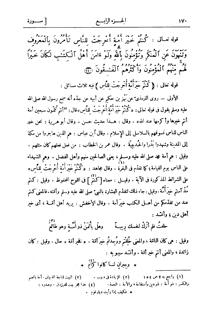 كُنْتُمْ خَيْرَ أُمَّةٍ أُخْرِجَتْ لِلنَّاسِ تَأْمُرُونَ بِالْمَعْرُوفِ وَتَنْهَوْنَ عَنِ الْمُنْكَرِ وَتُؤْمِنُونَ بِاللَّهِ وَلَوْ آمَنَ أَهْلُ الْكِتابِ لَكانَ خَيْراً لَهُمْ مِنْهُمُ الْمُؤْمِنُونَ وَأَكْثَرُهُمُ الْفاسِقُونَ (١١٠)