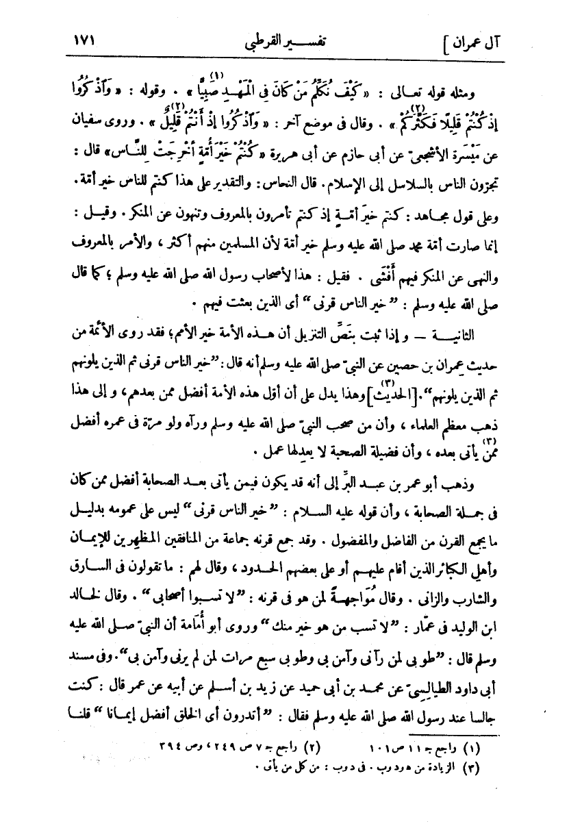 وَمِثْلُهُ قَوْلُهُ تَعَالَى:" كَيْفَ نُكَلِّمُ مَنْ كانَ فِي الْمَهْدِ «١» صَبِيًّا" [مريم: ٢٩]. وقوله:" وَاذْكُرُوا إِذْ كُنْتُمْ قَلِيلًا فَكَثَّرَكُمْ" [الأعراف: ٢ ([٨٦). وَقَالَ فِي مَوْضِعٍ آخَرَ:" وَاذْكُرُوا إِذْ أَنْتُمْ قَلِيلٌ" «٢». وَرَوَى سُفْيَانُ عَنْ مَيْسَرَةَ الْأَشْجَعِيِّ عَنْ أَبِي حَازِمٍ عَنْ أَبِي هُرَيْرَةَ" كُنْتُمْ خَيْرَ أُمَّةٍ أُخْرِجَتْ لِلنَّاسِ" قَالَ: تَجُرُّونَ النَّاسَ بِالسَّلَاسِلِ إِلَى الْإِسْلَامِ. قَالَ النَّحَّاسُ: وَالتَّقْدِيرُ عَلَى هَذَا كُنْتُمْ لِلنَّاسِ خَيْرَ أُمَّةٍ. وَعَلَى قَوْلِ مُجَاهِدٍ: كُنْتُمْ خَيْرَ أُمَّةٍ إِذْ كُنْتُمْ تَأْمُرُونَ بِالْمَعْرُوفِ وَتَنْهَوْنَ عَنِ الْمُنْكَرِ. وَقِيلَ: إِنَّمَا صَارَتْ أُمَّةُ مُحَمَّدٍ صَلَّى اللَّهُ عَلَيْهِ وَسَلَّمَ خَيْرَ أُمَّةٍ لِأَنَّ الْمُسْلِمِينَ مِنْهُمْ أَكْثَرُ، وَالْأَمْرُ بِالْمَعْرُوفِ وَالنَّهْيُ عَنِ الْمُنْكَرِ فِيهِمْ أَفْشَى. فَقِيلَ: هَذَا لِأَصْحَابِ رَسُولُ اللَّهِ صَلَّى اللَّهُ عَلَيْهِ وَسَلَّمَ، كَمَا قَالَ صَلَّى اللَّهُ عَلَيْهِ وَسَلَّمَ: (خَيْرُ النَّاسِ قَرْنِي) أَيِ الَّذِينَ بُعِثْتُ فِيهِمْ. الثَّانِيَةُ- وَإِذَا ثَبَتَ بِنَصِّ التَّنْزِيلِ أَنَّ هَذِهِ الْأُمَّةَ خَيْرُ الْأُمَمِ، فَقَدْ رَوَى الْأَئِمَّةُ مِنْ حَدِيثِ عِمْرَانَ بْنِ حُصَيْنٍ عَنِ النَّبِيِّ صَلَّى اللَّهُ عَلَيْهِ وَسَلَّمَ أَنَّهُ قَالَ: (خَيْرُ النَّاسِ قَرْنِي ثُمَّ الَّذِينَ يَلُونَهُمْ ثُمَّ الَّذِينَ يَلُونَهُمْ). [الْحَدِيثَ] «٣» وَهَذَا يَدُلُّ عَلَى أَنَّ أَوَّلَ هَذِهِ الْأُمَّةِ أَفْضَلُ مِمَّنْ بَعْدَهُمْ، وَإِلَى هَذَا ذَهَبَ مُعْظَمُ الْعُلَمَاءِ، وَإِنَّ مَنْ صَحِبَ النَّبِيَّ صَلَّى اللَّهُ عَلَيْهِ وَسَلَّمَ وَرَآهُ وَلَوْ مَرَّةً فِي عُمْرِهِ أَفْضَلُ مِمَّنْ يَأْتِي بَعْدَهُ، وَإِنَّ فَضِيلَةَ الصُّحْبَةِ لَا يَعْدِلُهَا عَمَلٌ. وَذَهَبَ أَبُو عُمَرَ بْنُ عَبْدِ الْبَرِّ إِلَى أَنَّهُ قَدْ يَكُونُ فِيمَنْ يَأْتِي بَعْدَ الصَّحَابَةِ أَفْضَلُ مِمَّنْ كَانَ فِي جُمْلَةِ الصحابة، وإن قول عَلَيْهِ السَّلَامُ: (خَيْرُ النَّاسِ قَرْنِي) لَيْسَ عَلَى عُمُومِهِ بِدَلِيلِ مَا يَجْمَعُ الْقَرْنُ مِنَ الْفَاضِلِ وَالْمَفْضُولِ. وَقَدْ جَمَعَ قَرْنُهُ جَمَاعَةً مِنَ الْمُنَافِقِينَ الْمُظْهِرِينَ لِلْإِيمَانِ وَأَهْلِ الْكَبَائِرِ الَّذِينَ أَقَامَ عَلَيْهِمْ أو على بعضهم الخدود، وَقَالَ لَهُمْ: مَا تَقُولُونَ فِي السَّارِقِ وَالشَّارِبِ وَالزَّانِي. وَقَالَ مُوَاجَهَةً لِمَنْ هُوَ فِي قَرْنِهِ: (لا تسبوا أصحابي). وقال لخالد ابن الْوَلِيدِ فِي عَمَّارٍ: (لَا تَسُبَّ مَنْ هُوَ خَيْرٌ مِنْكَ) وَرَوَى أَبُو أُمَامَةَ أَنَّ النَّبِيَّ صَلَّى اللَّهُ عَلَيْهِ وَسَلَّمَ قَالَ: (طُوبَى لِمَنْ رَآنِي وَآمَنَ بِي وَطُوبَى سَبْعَ مَرَّاتٍ لِمَنْ لَمْ يَرَنِي وَآمَنَ بِي). وَفِي مُسْنَدِ أَبِي دَاوُدَ الطَّيَالِسِيِّ عَنْ مُحَمَّدِ بْنِ أَبِي حُمَيْدٍ عَنْ زَيْدُ بْنُ أَسْلَمَ عَنْ أَبِيهِ عَنْ عُمَرَ. قَالَ: كُنْتُ جَالِسًا عِنْدَ رَسُولِ اللَّهِ صَلَّى اللَّهُ عَلَيْهِ وَسَلَّمَ فَقَالَ: (أَتَدْرُونَ أَيُّ الخلق أفضل إيمانا) قلنا