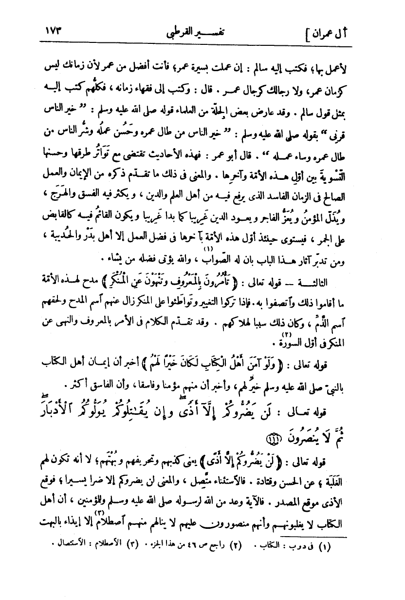 لِأَعْمَلَ بِهَا، فَكَتَبَ إِلَيْهِ سَالِمٌ: إِنْ عَمِلْتَ بِسِيرَةِ عُمَرَ، فَأَنْتَ أَفْضَلُ مِنْ عُمَرَ لِأَنَّ زَمَانَكَ لَيْسَ كَزَمَانِ عُمَرَ، وَلَا رِجَالَكَ كَرِجَالِ عُمَرَ. قَالَ: وَكَتَبَ إِلَى فُقَهَاءِ زَمَانِهِ، فَكُلُّهُمْ كَتَبَ إِلَيْهِ بِمِثْلِ قَوْلِ سَالِمٍ. وَقَدْ عَارَضَ بَعْضُ الْجِلَّةِ مِنَ الْعُلَمَاءِ قَوْلَهُ صَلَّى اللَّهُ عَلَيْهِ وَسَلَّمَ: (خَيْرُ النَّاسِ قَرْنِي) بِقَوْلِهِ صَلَّى اللَّهُ عَلَيْهِ وَسَلَّمَ: (خَيْرُ النَّاسِ مَنْ طَالَ عُمُرُهُ وَحَسُنَ عَمَلُهُ وَشَرُّ النَّاسِ مَنْ طَالَ عُمُرُهُ وَسَاءَ عَمَلُهُ). قَالَ أَبُو عُمَرَ: فَهَذِهِ الْأَحَادِيثُ تَقْتَضِي مَعَ تَوَاتُرِ طُرُقِهَا وَحُسْنِهَا التَّسْوِيَةَ بَيْنَ أَوَّلِ هَذِهِ الْأُمَّةِ وَآخِرِهَا. وَالْمَعْنَى فِي ذَلِكَ مَا تَقَدَّمَ ذِكْرُهُ مِنَ الْإِيمَانِ وَالْعَمَلِ الصَّالِحِ فِي الزَّمَانِ الْفَاسِدِ الَّذِي يُرْفَعُ فِيهِ مِنْ أَهْلِ الْعِلْمِ وَالدِّينِ، وَيَكْثُرُ فِيهِ الْفِسْقُ وَالْهَرْجُ، وَيُذَلُّ الْمُؤْمِنُ وَيُعَزُّ الْفَاجِرُ وَيَعُودُ الدِّينُ غَرِيبًا كَمَا بَدَأَ غَرِيبًا وَيَكُونُ الْقَائِمُ فِيهِ كَالْقَابِضِ عَلَى الْجَمْرِ، فَيَسْتَوِي حِينَئِذٍ أَوَّلُ هَذِهِ الْأُمَّةِ بِآخِرِهَا فِي فَضْلِ الْعَمَلِ إِلَّا أَهْلَ بَدْرٍ وَالْحُدَيْبِيَةِ، وَمَنْ تَدَبَّرَ آثَارَ هَذَا الْبَابِ بَانَ لَهُ الصَّوَابُ «١»، وَاللَّهُ يُؤْتِي فَضْلَهُ مَنْ يَشَاءُ. الثَّالِثَةُ- قَوْلُهُ تَعَالَى: (تَأْمُرُونَ بِالْمَعْرُوفِ وَتَنْهَوْنَ عَنِ الْمُنْكَرِ) مَدْحٌ لِهَذِهِ الْأُمَّةِ مَا أَقَامُوا ذَلِكَ وَاتَّصَفُوا بِهِ. فَإِذَا تَرَكُوا التَّغْيِيرَ وَتَوَاطَئُوا عَلَى الْمُنْكَرِ زَالَ عَنْهُمُ اسْمُ الْمَدْحِ وَلَحِقَهُمُ اسْمُ الذَّمِّ، وَكَانَ ذَلِكَ سَبَبًا لِهَلَاكِهِمْ. وَقَدْ تَقَدَّمَ الْكَلَامُ فِي الْأَمْرِ بِالْمَعْرُوفِ وَالنَّهْيِ عَنِ الْمُنْكَرِ فِي أَوَّلِ السُّورَةِ «٢». قَوْلُهُ تَعَالَى: (وَلَوْ آمَنَ أَهْلُ الْكِتابِ لَكانَ خَيْراً لَهُمْ) أَخْبَرَ أَنَّ إِيمَانَ أَهْلِ الْكِتَابِ بِالنَّبِيِّ صَلَّى اللَّهُ عَلَيْهِ وَسَلَّمَ خَيْرٌ لَهُمْ، وَأَخْبَرَ أَنَّ مِنْهُمْ مؤمنا وفاسقا، وأن الفاسق أكثر.