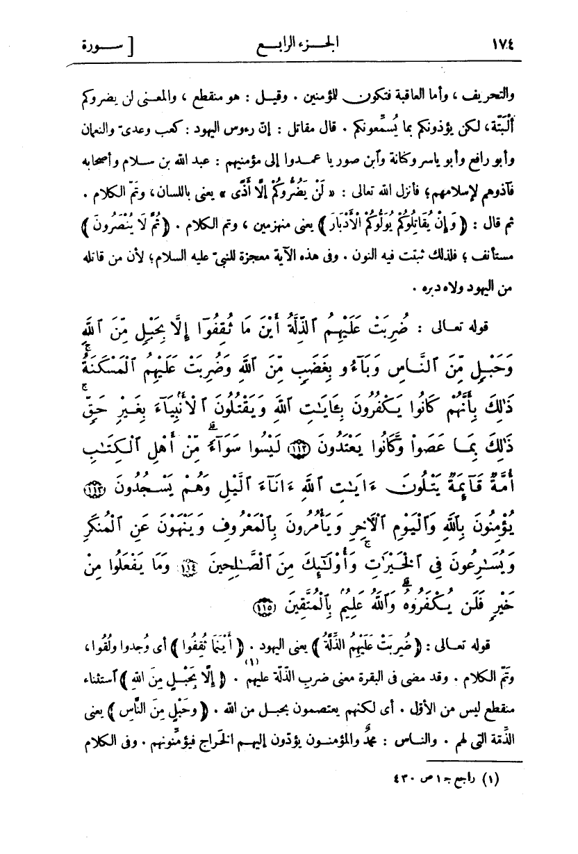 ضُرِبَتْ عَلَيْهِمُ الذِّلَّةُ أَيْنَ مَا ثُقِفُوا إِلاَّ بِحَبْلٍ مِنَ اللَّهِ وَحَبْلٍ مِنَ النَّاسِ وَباؤُ بِغَضَبٍ مِنَ اللَّهِ وَضُرِبَتْ عَلَيْهِمُ الْمَسْكَنَةُ ذلِكَ بِأَنَّهُمْ كانُوا يَكْفُرُونَ بِآياتِ اللَّهِ وَيَقْتُلُونَ الْأَنْبِياءَ بِغَيْرِ حَقٍّ ذلِكَ بِما عَصَوْا وَكانُوا يَعْتَدُونَ (١١٢) لَيْسُوا سَواءً مِنْ أَهْلِ الْكِتابِ أُمَّةٌ قائِمَةٌ يَتْلُونَ آياتِ اللَّهِ آناءَ اللَّيْلِ وَهُمْ يَسْجُدُونَ (١١٣) يُؤْمِنُونَ بِاللَّهِ وَالْيَوْمِ الْآخِرِ وَيَأْمُرُونَ بِالْمَعْرُوفِ وَيَنْهَوْنَ عَنِ الْمُنْكَرِ وَيُسارِعُونَ فِي الْخَيْراتِ وَأُولئِكَ مِنَ الصَّالِحِينَ (١١٤) وَما يَفْعَلُوا مِنْ خَيْرٍ فَلَنْ يُكْفَرُوهُ وَاللَّهُ عَلِيمٌ بِالْمُتَّقِينَ (١١٥)