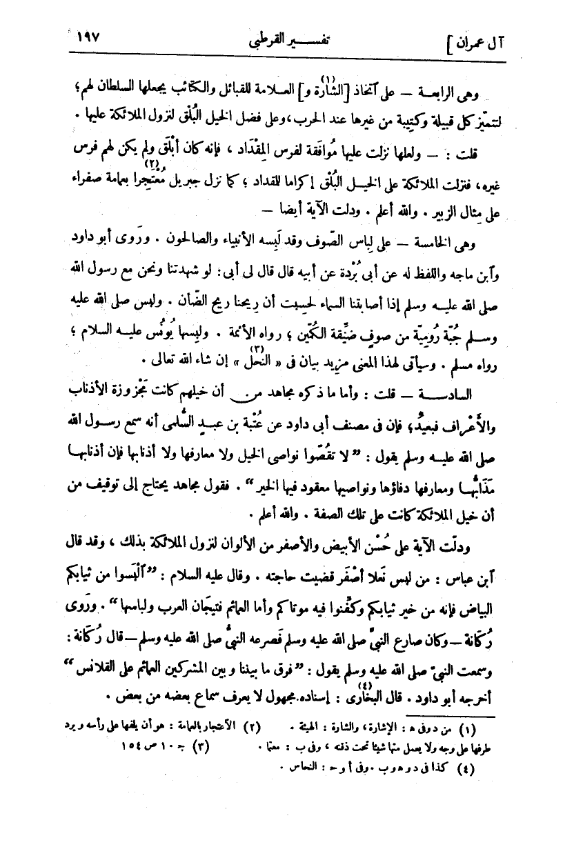 وهي الرابعة- على اتخاذ [الشارة و] «١» العلامة لِلْقَبَائِلِ وَالْكَتَائِبِ يَجْعَلُهَا السُّلْطَانُ لَهُمْ، لِتَتَمَيَّزَ كُلُّ قَبِيلَةٍ وَكَتِيبَةٍ مِنْ غَيْرِهَا عِنْدَ الْحَرْبِ، وَعَلَى فَضْلِ الْخَيْلِ الْبُلْقِ لِنُزُولِ الْمَلَائِكَةِ عَلَيْهَا. قُلْتُ:- وَلَعَلَّهَا نَزَلَتْ عَلَيْهَا مُوَافَقَةً لِفَرَسِ الْمِقْدَادِ، فَإِنَّهُ كَانَ أَبْلَقَ وَلَمْ يَكُنْ لَهُمْ فَرَسٌ غَيْرُهُ، فَنَزَلَتِ الْمَلَائِكَةُ عَلَى الْخَيْلِ الْبُلْقِ إِكْرَامًا لِلْمِقْدَادِ، كَمَا نَزَلَ جِبْرِيلُ مُعْتَجِرًا «٢» بِعِمَامَةٍ صَفْرَاءَ عَلَى مِثَالِ الزُّبَيْرِ. وَاللَّهُ أَعْلَمُ. وَدَلَّتِ الْآيَةُ أَيْضًا- وَهِيَ الْخَامِسَةُ- عَلَى لِبَاسِ الصُّوفِ وَقَدْ لَبِسَهُ الْأَنْبِيَاءُ وَالصَّالِحُونَ. وَرَوَى أَبُو دَاوُدَ وَابْنُ مَاجَهْ وَاللَّفْظُ لَهُ عَنْ أَبِي بُرْدَةَ عَنْ أَبِيهِ قَالَ قَالَ لِي أَبِي: لَوْ شَهِدْتَنَا وَنَحْنُ مَعَ رَسُولِ اللَّهِ صَلَّى اللَّهُ عَلَيْهِ وَسَلَّمَ إِذَا أَصَابَتْنَا السَّمَاءُ لَحَسِبْتَ أَنَّ رِيحَنَا رِيحُ الضَّأْنِ. وَلَبِسَ صَلَّى اللَّهُ عَلَيْهِ وَسَلَّمَ جُبَّةً رُومِيَّةً مِنْ صُوفٍ ضَيِّقَةِ الْكُمَّيْنِ، رَوَاهُ الْأَئِمَّةُ. وَلَبِسَهَا يُونُسُ عَلَيْهِ السَّلَامُ، رَوَاهُ مُسْلِمٌ. وَسَيَأْتِي لِهَذَا الْمَعْنَى مَزِيدُ بَيَانٍ فِي" النَّحْلِ" «٣» إِنْ شَاءَ اللَّهُ تَعَالَى. السَّادِسَةُ- قُلْتُ: وَأَمَّا مَا ذَكَرَهُ مُجَاهِدٌ مِنْ أَنَّ خَيْلَهُمْ كَانَتْ مَجْزُوزَةَ الأذناب والأعراف فبعد، فَإِنَّ فِي مُصَنَّفِ أَبِي دَاوُدَ عَنْ عُتْبَةَ بْنِ عَبْدٍ السُّلَمِيِّ أَنَّهُ سَمِعَ رَسُولَ اللَّهِ صَلَّى اللَّهُ عَلَيْهِ وَسَلَّمَ يَقُولُ: (لَا تَقُصُّوا نَوَاصِيَ الْخَيْلِ وَلَا مَعَارِفَهَا وَلَا أَذْنَابَهَا فَإِنَّ أَذْنَابَهَا مَذَابُّهَا وَمَعَارِفَهَا دِفَاؤُهَا وَنَوَاصِيَهَا مَعْقُودٌ فِيهَا الخير (. فيقول مُجَاهِدٍ يَحْتَاجُ إِلَى تَوْقِيفٍ مِنْ أَنَّ خَيْلَ الْمَلَائِكَةِ كَانَتْ عَلَى تِلْكَ الصِّفَةِ. وَاللَّهُ أَعْلَمُ. وَدَلَّتِ الْآيَةُ عَلَى حُسْنِ الْأَبْيَضِ وَالْأَصْفَرِ مِنَ الْأَلْوَانِ لِنُزُولِ الْمَلَائِكَةِ بِذَلِكَ، وَقَدْ قَالَ ابْنُ عَبَّاسٍ: مَنْ لَبِسَ نَعْلًا أَصْفَرَ قُضِيَتْ حَاجَتُهُ. وَقَالَ عَلَيْهِ السَّلَامُ: (الْبَسُوا مِنْ ثِيَابِكُمُ الْبَيَاضَ فَإِنَّهُ مِنْ خَيْرِ ثِيَابِكُمْ وَكَفِّنُوا فِيهِ مَوْتَاكُمْ وَأَمَّا الْعَمَائِمُ فَتِيجَانُ الْعَرَبِ وَلِبَاسُهَا (. وَرَوَى رُكَانَةُ- وَكَانَ صَارَعَ النَّبِيَّ صَلَّى اللَّهُ عَلَيْهِ وَسَلَّمَ فَصَرَعَهُ النَّبِيُّ صَلَّى اللَّهُ عَلَيْهِ وَسَلَّمَ- قَالَ رُكَانَةُ: وَسَمِعْتُ النَّبِيَّ صَلَّى اللَّهُ عَلَيْهِ وَسَلَّمَ يَقُولُ: (فَرْقُ مَا بَيْنَنَا وَبَيْنَ الْمُشْرِكِينَ الْعَمَائِمُ عَلَى الْقَلَانِسِ) أَخْرَجَهُ أَبُو دَاوُدَ. قَالَ الْبُخَارِيُّ «٤»: إِسْنَادُهُ مَجْهُولٌ لَا يُعْرَفُ سَمَاعُ بَعْضِهِ مِنْ بعض.