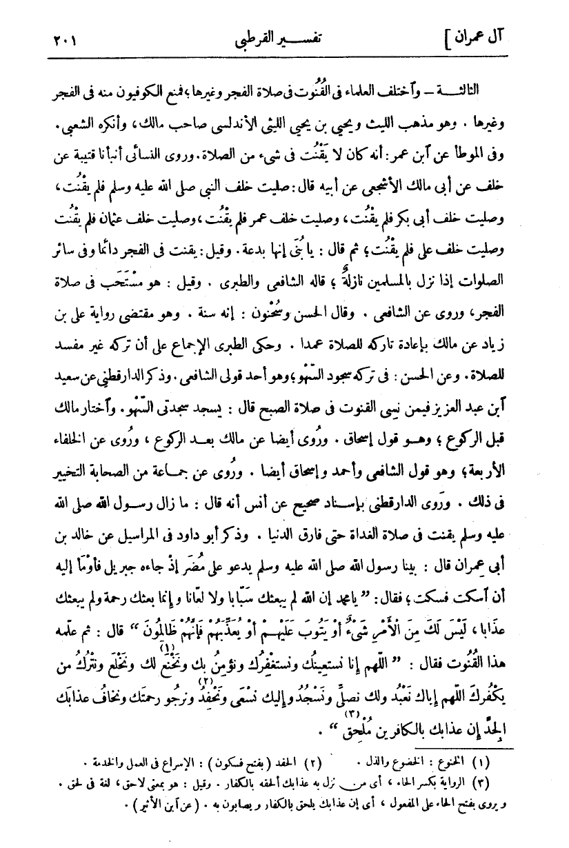 الثَّالِثَةُ- وَاخْتَلَفَ الْعُلَمَاءُ فِي الْقُنُوتِ فِي صَلَاةِ الْفَجْرِ وَغَيْرِهَا، فَمَنَعَ الْكُوفِيُّونَ مِنْهُ فِي الْفَجْرِ وَغَيْرِهَا. وَهُوَ مَذْهَبُ اللَّيْثِ وَيَحْيَى بْنِ يَحْيَى اللَّيْثِيِّ الْأَنْدَلُسِيِّ صَاحِبِ مَالِكٍ، وَأَنْكَرَهُ الشَّعْبِيُّ. وَفِي الْمُوَطَّأِ عَنِ ابْنِ عُمَرَ: أَنَّهُ كَانَ لَا يقنت في شي مِنَ الصَّلَاةِ. وَرَوَى النَّسَائِيُّ أَنْبَأَنَا قُتَيْبَةُ عَنْ خَلَفٍ عَنْ أَبِي مَالِكٍ الْأَشْجَعِيِّ عَنْ أَبِيهِ قَالَ: صَلَّيْتُ خَلْفَ النَّبِيِّ صَلَّى اللَّهُ عَلَيْهِ وَسَلَّمَ فَلَمْ يَقْنُتْ، وَصَلَّيْتُ خَلْفَ أَبِي بَكْرٍ فَلَمْ يَقْنُتْ، وَصَلَّيْتُ خَلْفَ عُمَرَ فَلَمْ يَقْنُتْ، وَصَلَّيْتُ خَلْفَ عُثْمَانَ فَلَمْ يَقْنُتْ وَصَلَّيْتُ خَلْفَ عَلِيٍّ فَلَمْ يَقْنُتْ، ثُمَّ قَالَ: يَا بُنَيَّ إِنَّهَا بِدْعَةٌ. وَقِيلَ: يَقْنُتُ فِي الْفَجْرِ دَائِمًا وَفِي سَائِرِ الصَّلَوَاتِ إِذَا نَزَلَ بِالْمُسْلِمِينَ نَازِلَةٌ، قَالَهُ الشَّافِعِيُّ وَالطَّبَرِيُّ. وَقِيلَ: هُوَ مُسْتَحَبٌّ فِي صَلَاةِ الْفَجْرِ، وَرُوِيَ عَنِ الشَّافِعِيِّ. وَقَالَ الْحَسَنُ وَسَحْنُونٌ: إِنَّهُ سُنَّةٌ. وَهُوَ مُقْتَضَى رِوَايَةِ عَلِيِّ بْنِ زِيَادٍ عَنْ مَالِكٍ بِإِعَادَةِ تَارِكِهِ لِلصَّلَاةِ عَمْدًا. وَحَكَى الطَّبَرِيُّ الْإِجْمَاعَ عَلَى أَنَّ تَرْكَهُ غَيْرُ مُفْسِدٍ لِلصَّلَاةِ. وَعَنِ الْحَسَنِ: فِي تَرْكِهِ سُجُودَ السَّهْوِ، وَهُوَ أَحَدُ قَوْلَيِ الشَّافِعِيِّ. وَذَكَرَ الدارقطني عن سعيد ابن عَبْدِ الْعَزِيزِ فِيمَنْ نَسِيَ الْقُنُوتَ فِي صَلَاةِ الصُّبْحِ قَالَ: يَسْجُدُ سَجْدَتَيِ السَّهْوِ. وَاخْتَارَ مَالِكٌ قَبْلَ الرُّكُوعِ، وَهُوَ قَوْلُ إِسْحَاقَ. وَرُوِيَ أَيْضًا عَنْ مَالِكٍ بَعْدَ الرُّكُوعِ، وَرُوِيَ عَنِ الْخُلَفَاءِ الْأَرْبَعَةِ، وَهُوَ قَوْلُ الشَّافِعِيِّ وَأَحْمَدَ وَإِسْحَاقَ أَيْضًا. وَرَوَى عَنْ جَمَاعَةٍ مِنَ الصَّحَابَةِ التَّخْيِيرَ فِي ذَلِكَ. وَرَوَى الدَّارَقُطْنِيُّ بِإِسْنَادٍ صَحِيحٍ عَنْ أَنَسٍ أَنَّهُ قَالَ: مَا زَالَ رَسُولُ اللَّهِ صَلَّى اللَّهُ عَلَيْهِ وَسَلَّمَ يَقْنُتُ فِي صَلَاةِ الْغَدَاةِ حَتَّى فَارَقَ الدُّنْيَا. وَذَكَرَ أَبُو دَاوُدَ فِي الْمَرَاسِيلِ عَنْ خَالِدِ بْنِ أَبِي عِمْرَانَ قَالَ: بَيْنَا رَسُولُ اللَّهِ صَلَّى اللَّهُ عَلَيْهِ وَسَلَّمَ يَدْعُو على مضر إذ جاءه جبريل فاؤ ما إِلَيْهِ أَنِ اسْكُتْ فَسَكَتَ، فَقَالَ: (يَا مُحَمَّدُ إِنَّ اللَّهَ لَمْ يَبْعَثْكَ سَبَّابًا وَلَا لَعَّانًا وَإِنَّمَا بَعَثَكَ رَحْمَةً وَلَمْ يَبْعَثْكَ عَذَابًا، لَيْسَ لك من الامر شي أَوْ يَتُوبَ عَلَيْهِمْ أَوْ يُعَذِّبَهُمْ فَإِنَّهُمْ ظَالِمُونَ) قَالَ: ثُمَّ عَلَّمَهُ هَذَا الْقُنُوتَ فَقَالَ: (اللَّهُمَّ إِنَّا نَسْتَعِينُكَ وَنَسْتَغْفِرُكَ وَنُؤْمِنُ بِكَ وَنَخْنَعُ «١» لَكَ وَنَتْرُكُ مَنْ يَكْفُرُكَ اللَّهُمَّ إِيَّاكَ نَعْبُدُ وَلَكَ نُصَلِّي وَنَسْجُدُ وَإِلَيْكَ نَسْعَى وَنَحْفِدُ «٢» وَنَرْجُو رَحْمَتَكَ وَنَخَافُ عَذَابَكَ الْجَدَّ إِنَّ عَذَابَكَ بِالْكَافِرِينَ مُلْحِقٌ «٣»).