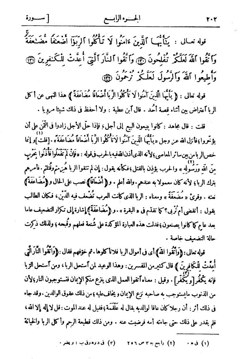 يا أَيُّهَا الَّذِينَ آمَنُوا لا تَأْكُلُوا الرِّبَوا أَضْعافاً مُضاعَفَةً وَاتَّقُوا اللَّهَ لَعَلَّكُمْ تُفْلِحُونَ (١٣٠) وَاتَّقُوا النَّارَ الَّتِي أُعِدَّتْ لِلْكافِرِينَ (١٣١) وَأَطِيعُوا اللَّهَ وَالرَّسُولَ لَعَلَّكُمْ تُرْحَمُونَ (١٣٢)