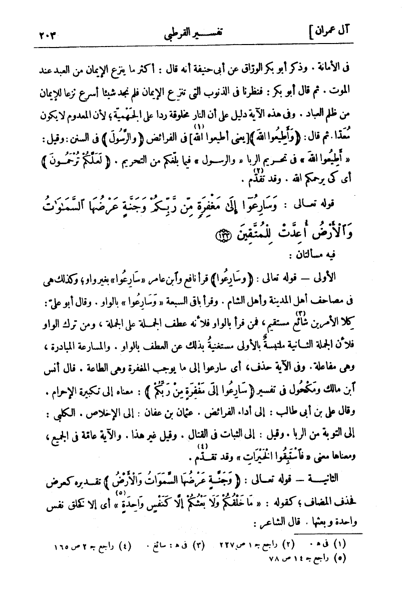 فِيهِ مَسْأَلَتَانِ: الْأُولَى- قَوْلُهُ تَعَالَى: (وَسارِعُوا) قَرَأَ نَافِعٌ وَابْنُ عَامِرٍ" سارِعُوا" بِغَيْرِ وَاوٍ، وَكَذَلِكَ هِيَ فِي مَصَاحِفَ أَهْلِ الْمَدِينَةِ وَأَهْلِ الشَّامِ. وَقَرَأَ بَاقِي السَّبْعَةِ" وَسارِعُوا". وَقَالَ أَبُو عَلِيٍّ: كِلَا الْأَمْرَيْنِ شَائِعٌ «٣» مُسْتَقِيمٌ، فَمَنْ قَرَأَ بِالْوَاوِ فَلِأَنَّهُ عَطَفَ الْجُمْلَةَ عَلَى الْجُمْلَةِ، وَمَنْ تَرَكَ الْوَاوَ فَلِأَنَّ الْجُمْلَةَ الثَّانِيَةَ مُلْتَبِسَةٌ بِالْأُولَى مُسْتَغْنِيَةٌ بِذَلِكَ عَنِ الْعَطْفِ بِالْوَاوِ. وَالْمُسَارَعَةُ الْمُبَادَرَةُ، وَهِيَ مُفَاعَلَةٌ. وَفِي الْآيَةِ حَذْفٌ. أَيْ سَارِعُوا إِلَى مَا يُوجِبُ الْمَغْفِرَةَ وهي الطاعة. قال أنس ابن مَالِكٍ وَمَكْحُولٌ فِي تَفْسِيرِ (سارِعُوا إِلى مَغْفِرَةٍ مِنْ رَبِّكُمْ): مَعْنَاهُ إِلَى تَكْبِيرَةِ الْإِحْرَامِ. وَقَالَ عَلِيُّ بْنُ أَبِي طَالِبٍ: إِلَى أَدَاءِ الْفَرَائِضِ. عُثْمَانُ بْنُ عَفَّانَ: إِلَى الْإِخْلَاصِ. الْكَلْبِيُّ: إِلَى التَّوْبَةِ مِنَ الرِّبَا. وَقِيلَ: إِلَى الثَّبَاتِ فِي الْقِتَالِ. وَقِيلَ غَيْرُ هَذَا. وَالْآيَةُ عَامَّةٌ فِي الجميع، ومعناها معني"اسْتَبِقُوا الْخَيْراتِ