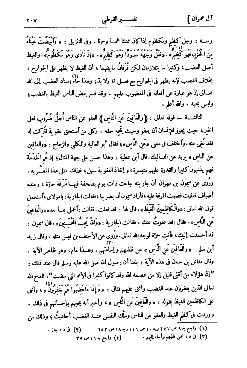 وَمِنْهُ: رَجُلٌ كَظِيمٌ وَمَكْظُومٌ إِذَا كَانَ مُمْتَلِئًا غَمًّا وَحُزْنًا. وَفِي التَّنْزِيلِ:" وَابْيَضَّتْ عَيْناهُ مِنَ الْحُزْنِ فَهُوَ كَظِيمٌ" [يوسف:] «١»." ظَلَّ وَجْهُهُ مُسْوَدًّا وَهُوَ كَظِيمٌ" [النحل: [." إِذْ نادى وَهُوَ مَكْظُومٌ" [القلم: [. وَالْغَيْظُ أَصْلُ الْغَضَبِ، وَكَثِيرًا مَا يَتَلَازَمَانِ لَكِنَّ فُرْقَانَ مَا بَيْنَهُمَا، أَنَّ الْغَيْظَ لَا يَظْهَرُ عَلَى الْجَوَارِحِ، بِخِلَافِ الْغَضَبِ فَإِنَّهُ يَظْهَرُ فِي الجوارح مع فعل ما لأبد، وَلِهَذَا جَاءَ «٢» إِسْنَادُ الْغَضَبِ إِلَى اللَّهِ تَعَالَى إِذْ هُوَ عِبَارَةٌ عَنْ أَفْعَالِهِ فِي الْمَغْضُوبِ عَلَيْهِمْ. وَقَدْ فَسَّرَ بَعْضُ النَّاسِ الْغَيْظَ بِالْغَضَبِ، وَلَيْسَ بِجَيِّدٍ. وَاللَّهُ أَعْلَمُ. الثَّالِثَةُ- قَوْلُهُ تَعَالَى: (وَالْعافِينَ عَنِ النَّاسِ) الْعَفْوُ عَنِ النَّاسِ أَجَلُّ ضُرُوبِ فِعْلِ الْخَيْرِ، حَيْثُ يَجُوزُ لِلْإِنْسَانِ أَنْ يَعْفُوَ وَحَيْثُ يَتَّجِهُ حَقُّهُ. وَكُلُّ مَنِ اسْتَحَقَّ عُقُوبَةً فَتُرِكَتْ لَهُ فَقَدْ عُفِيَ عَنْهُ. وَاخْتُلِفَ فِي مَعْنَى" عَنِ النَّاسِ"، فَقَالَ أَبُو الْعَالِيَةِ وَالْكَلْبِيُّ وَالزَّجَّاجُ:" وَالْعافِينَ عَنِ النَّاسِ" يُرِيدُ عَنِ الْمَمَالِيكِ. قَالَ ابْنُ عَطِيَّةَ: وَهَذَا حَسَنٌ عَلَى جِهَةِ الْمِثَالِ، إِذْ هُمُ الْخَدَمَةُ فَهُمْ يُذْنِبُونَ كَثِيرًا وَالْقُدْرَةُ عَلَيْهِمْ مُتَيَسِّرَةٌ، وَإِنْفَاذُ الْعُقُوبَةِ سَهْلٌ، فَلِذَلِكَ مَثَّلَ هَذَا الْمُفَسِّرُ بِهِ. وَرُوِيَ عَنْ مَيْمُونِ بْنِ مِهْرَانَ أَنَّ جَارِيَتَهُ جَاءَتْ ذَاتَ يَوْمٍ بِصَحْفَةٍ فِيهَا مَرَقَةٌ حَارَّةٌ، وَعِنْدَهُ أَضْيَافٌ فَعَثَرَتْ فَصَبَّتِ الْمَرَقَةَ عَلَيْهِ، فَأَرَادَ مَيْمُونٌ أَنْ يضربها، فقالت الجارية: يا مولاي، استعمل قول الله تَعَالَى:" وَالْكاظِمِينَ الْغَيْظَ". قَالَ لَهَا: قَدْ فَعَلْتُ. فَقَالَتْ: اعْمَلْ بِمَا بَعْدَهُ" وَالْعافِينَ عَنِ النَّاسِ". فَقَالَ: قَدْ عَفَوْتُ عَنْكِ. فَقَالَتِ الْجَارِيَةُ:" وَاللَّهُ يُحِبُّ الْمُحْسِنِينَ". قَالَ مَيْمُونٌ: قَدْ أَحْسَنْتُ إِلَيْكِ، فَأَنْتِ حُرَّةٌ لِوَجْهِ اللَّهِ تَعَالَى. وَرُوِيَ عَنِ الأحنف بن قيس مثله. وقال زيد ابن سلم:" وَالْعافِينَ عَنِ النَّاسِ" عَنْ ظُلْمِهِمْ وَإِسَاءَتِهِمْ «٣». وَهَذَا عَامٌّ، وَهُوَ ظَاهِرُ الْآيَةِ. وَقَالَ مُقَاتِلُ بْنُ حَيَّانَ فِي هَذِهِ الْآيَةِ: بَلَغَنَا أَنَّ رَسُولَ اللَّهِ صَلَّى اللَّهُ عَلَيْهِ وَسَلَّمَ قَالَ عِنْدَ ذَلِكَ: (إِنَّ هَؤُلَاءِ مِنْ أُمَّتِي قَلِيلٌ إِلَّا مَنْ عَصَمَهُ اللَّهُ وَقَدْ كَانُوا كَثِيرًا فِي الْأُمَمِ الَّتِي مَضَتْ). فَمَدَحَ اللَّهُ تَعَالَى الَّذِينَ يَغْفِرُونَ عِنْدَ الْغَضَبِ وَأَثْنَى عَلَيْهِمْ فَقَالَ:" وَإِذا ما غَضِبُوا هُمْ يَغْفِرُونَ" [الشورى: ٣٧] «٤»، وَأَثْنَى عَلَى الْكَاظِمِينَ الْغَيْظَ بِقَوْلِهِ:" وَالْعافِينَ عَنِ النَّاسِ"، وَأَخْبَرَ أَنَّهُ يُحِبُّهُمْ بِإِحْسَانِهِمْ فِي ذَلِكَ. وَوَرَدَتْ فِي كَظْمِ الْغَيْظِ وَالْعَفْوِ عَنِ النَّاسِ وَمِلْكِ النَّفْسِ عِنْدَ الْغَضَبِ أَحَادِيثُ، وَذَلِكَ مِنْ